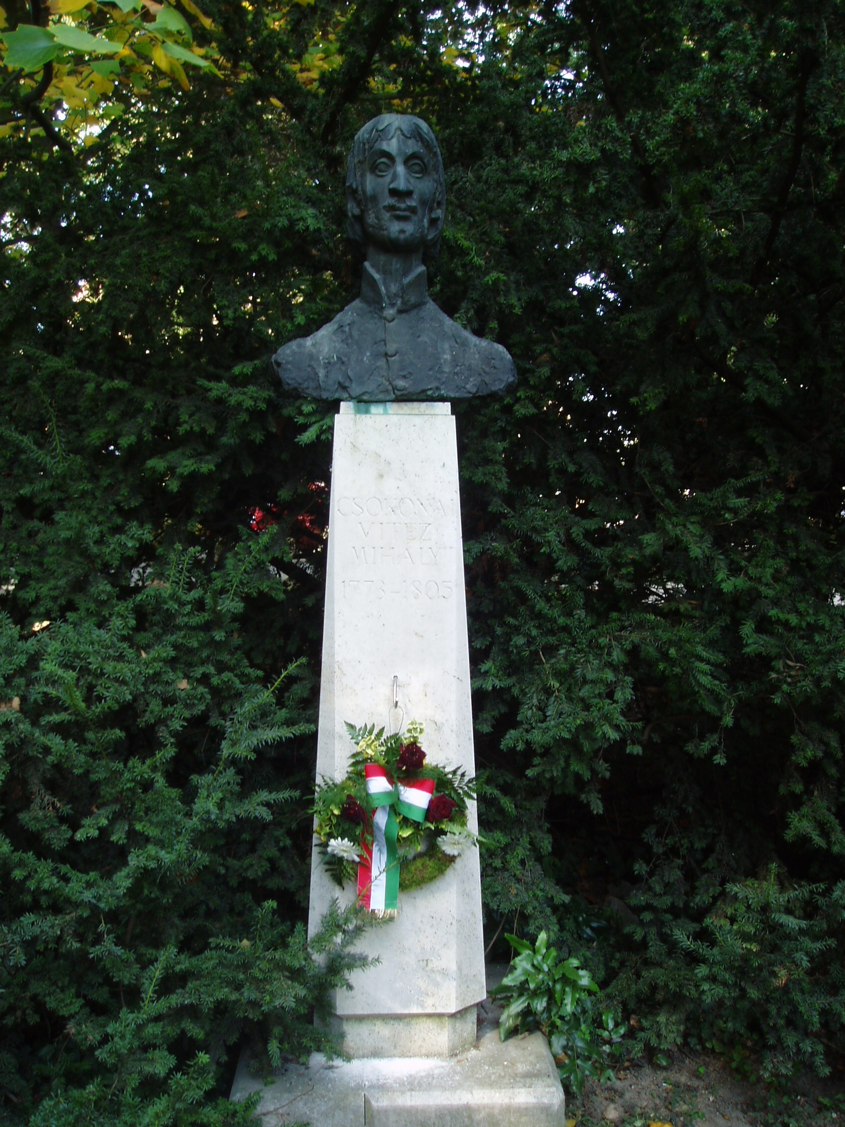 Nyilvános 1267 | 2615 | Hévíz, Schulhof sétány: Csokonai Vitéz Mihály szobra | A Schulhof sétányon a szanatórium felé haladva jobbra egy szoborparkot találunk. Irodalmunk nagyjainak szoborportréi között ott van Csokonai Vitéz Mihályé is. A mellszobor Rátonyi József alkotása. Csokonai annakidején a közeli Keszthelyen járt (lásd: Keszthely, Kastély u. 11.), mecénása volt Festetics György. 1985-ben Major Zala Lajos költő (lásd még: Hévíz, Hunyadi út 9.) és köre Hévízen alapította meg a Csokonai Irodalmi Társaságot, amely az utóbbi években minden ősszel megrendezi a költői versennyel egybekötött Csokonai Napokat. A felvétel 2006 októberében készült. Felh. irod.: Látnivalók Zala megyében. Miskolc, Well PRess, 1998 www.csokonai.org |