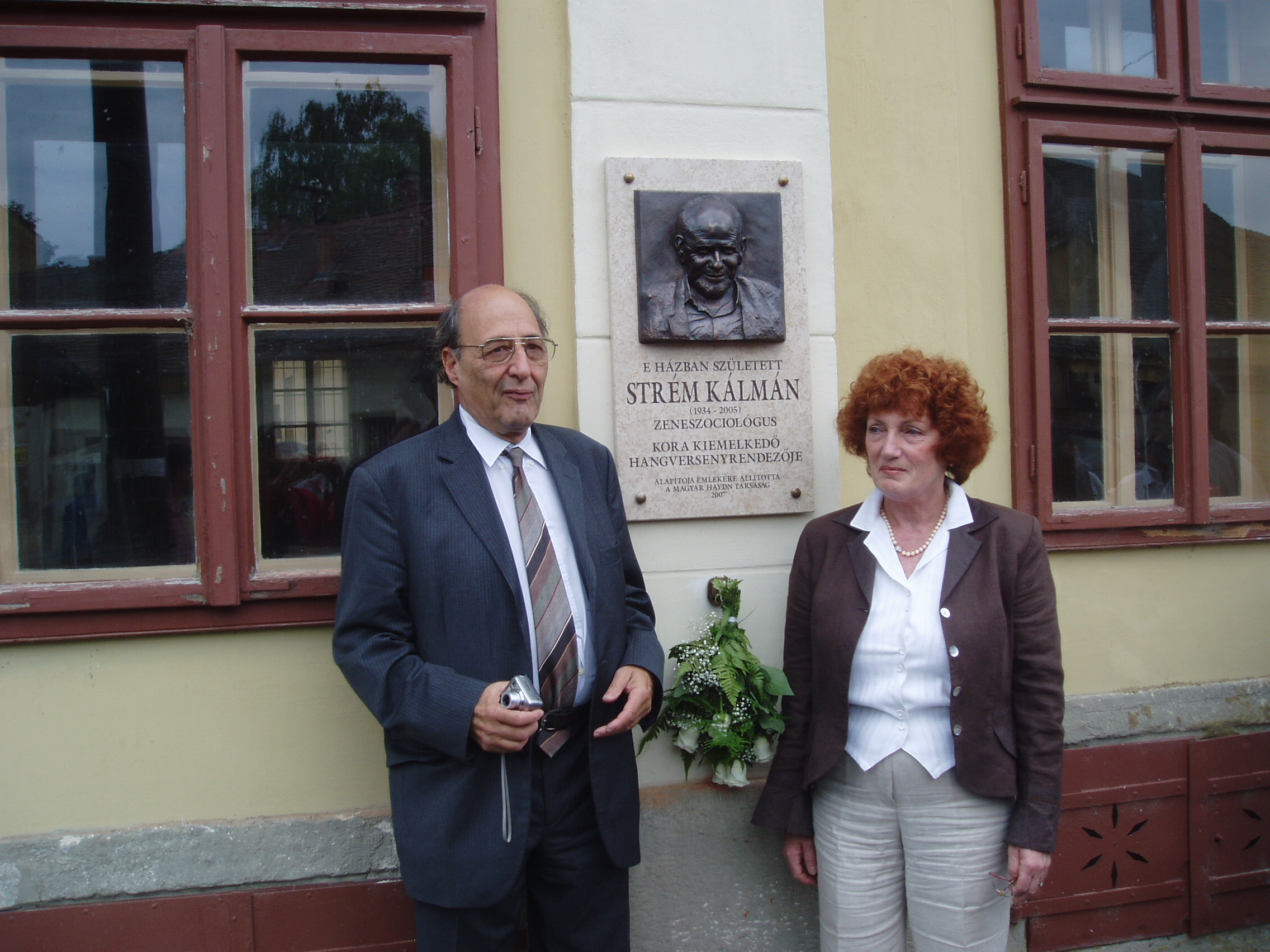 Nyilvános 1771 | 4427 | Strém Kálmán emléktáblájának felavatása 2007. május 28-án Nagykanizsán, Erzsébet tér 11. számú szülőházán. A táblát a Magyar Haydn Társaság állította, az eseményt a Kanizsai Klasszikusok Kulturális és Közhasznú Alapítvány rendezte. | A képen Strém Kálmán öccse és dr. Gerő Katalin, az emléktábla alkotója. Strém Kálmán (1934-2005) zeneszociológus, hangversenyrendező, a legjelentősebb hazai koncertrendező iroda vezetője 1934. május 23-án született Nagykanizsán az Erzsébet tér 11. számú épületben, az ún. Gutmann–palotában. Évtizedekig tevékenykedett az Országos Filharmóniánál, ahol a vidéki osztály vezetőjeként felbecsülhetetlen értékű munkát végzett. 1978-ban a Zeneművész Szövetség ügyvezető titkára lett, ezen a posztján húsz évig tevékenykedett. Közben olyan, a magyar zenei élet húsbavágó kérdéseiről publikált nagyhatású könyveket, mint a Hol vannak a magyar vonósok?, a Lemorzsolódás a zeneiskolákban és a Vitairat a magyar zenei művelődésről. A magyar zenei élet jobbítására közreadott javaslatai közül a — mára sajnos megszüntetett — zenei menedzserképzést ő indíthatta el a Zeneakadémián. A menedzselést nemcsak tanította, hanem a rendszerváltást követően maga is vállalkozni kezdett, s létrehozta a Strém Koncert Kft.-t, amely hamarosan a legnagyobb nem állami hangversenyrendező irodává vált. Strém Kálmán e minőségében is példamutató, áldozatos munkát végzett. Tevékenységének egyik fő iránya a magyarországi Haydn–kultusz erősítése volt: megszervezte és működtette a Fertőd–Eszterházai Nyári Fesztiválokat. Hangversenyrendezői munkájának másik pólusán a kortárs zene állott: ő hívta életre Balatonföldváron a Földvári Zenei Napokat, ahol igaz összművészeti kulturális műhelyt hozott létre (sajnos, mára ez a rendezvénysorozat is megszűnt). Hangversenyeit mindig a legnagyobb gondossággal, európai ízléssel rendezte meg. S bár ő maga nem volt muzsikus, de — mint egy tisztelője megfogalmazta — a hangversenyrendezést művészi fokon művelte. 2005. november 27-én bekövetkezett hirtelen halálával egy korszak zárult le a magyar zenei életben. Batta András, a Zeneakadémia rektora a következő szavakkal méltatta őt: "Olyan fajta ember volt, akiről azt hittük soha nem öregedik meg és nem fárad el. Élete volt a zene és a zene közvetítése. Évente százával szervezett, rendezett hangversenyeket, állt ki jó ügyek mellett, fedezett fel fiatal tehetségeket, adta meg a tiszteletet idős művészeknek." Halála óta már két emléktáblát avattak tiszteletére: Székesfehérváron a Szent István Művelődési Központban és a budapesti Liszt Ferenc Zeneművészeti Egyetemen. Most nagykanizsai szülőházára került fel emléktábla, az emlékező beszédet Malina János zenetörténész, a Magyar Haydn Társaság elnöke tartotta. Az eseményt — természetesen — hangverseny is követte a Jézus Szíve templomban, amelyen Földes Imre tanár úr idézte fel Strém Kálmán alakját a közönség előtt. A hangversenyen közreműködtek: Horváth Anikó (csembaló), Kelemen Barnabás (hegedű), Kokas Katalin (hegedű és brácsa), Kokas Dóra (cselló). |