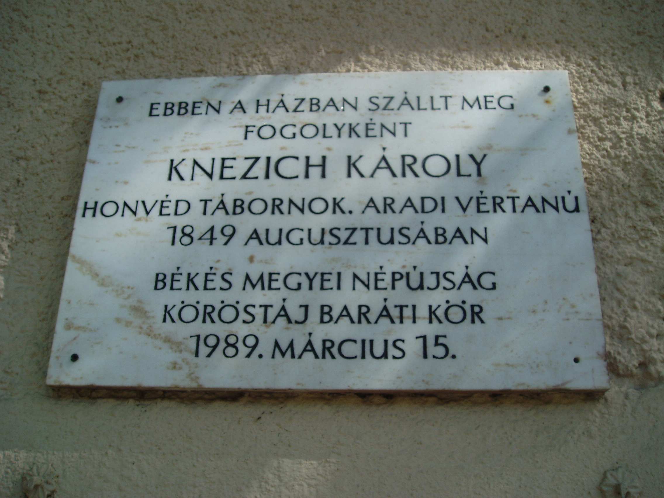 Nyilvános 1337 | 1723 | Gyula, Jókai utca 8. Czégényi-ház | Ebben a házban volt elszállásolva 1849. augusztusában Knezich Károly honvéd tábornok, az aradi vértanúk egyike. A lefegyverzéskor kardját Czégényi nevű házigazdájának adta át, s ma a gyulai múzeum becses tulajdona. A szabadságharc tragikus gyulai eseményét lásd: Gyula, Várkert: Honvédtiszti emlékhely. A fénykép 2007 júliusában készült. Felh. irod.: Czeglédi Imre: Gyula útikalauz. 2. jav., bőv. kiad. Gyula, 1995 |