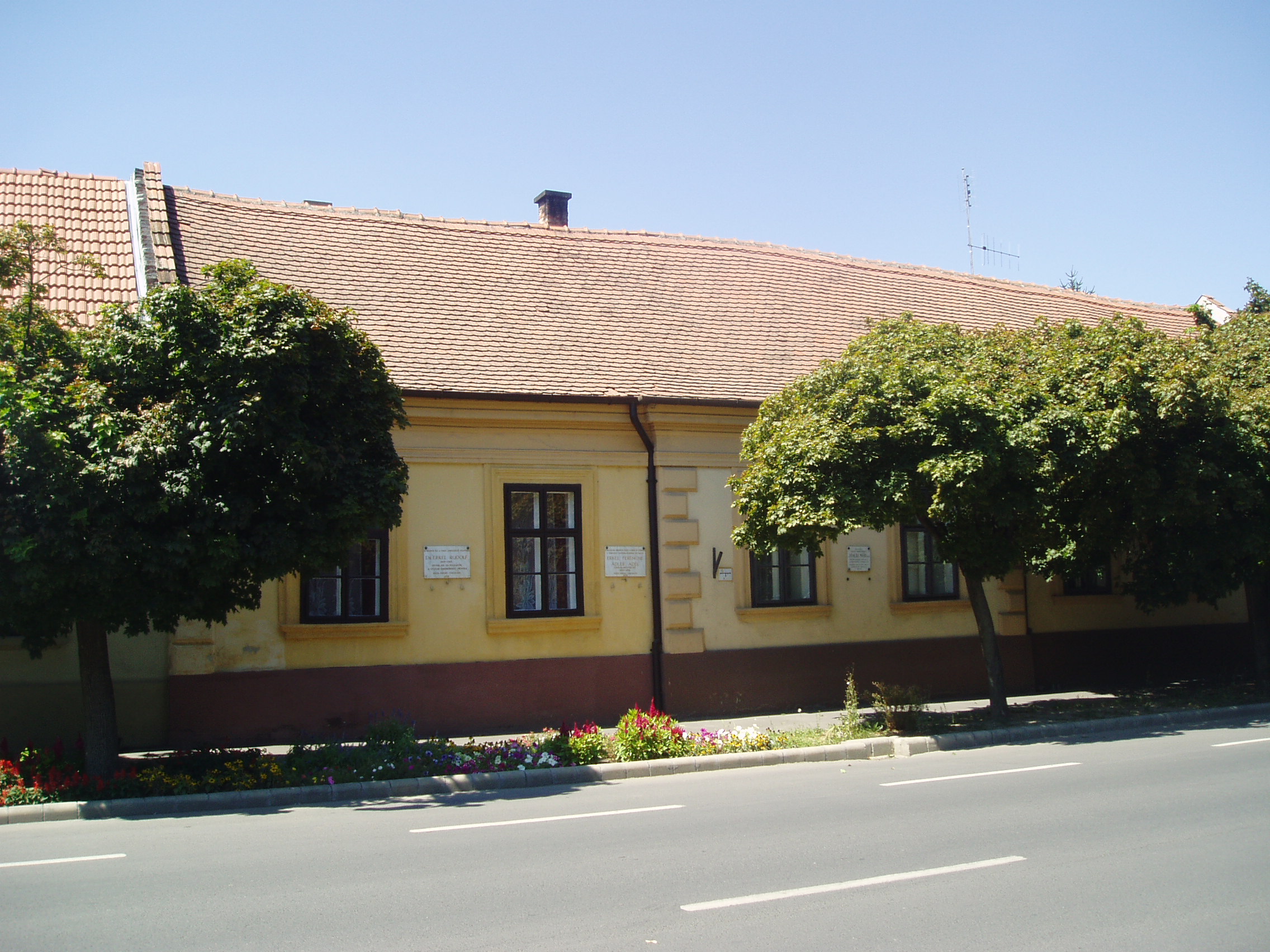 Nyilvános 1362 | 1876 | Gyula, Kossuth utca 30. | Az Almásy-kastélyhoz vezető kőhíddal egyvonalban, az utca túlsó oldalán álló földszintes lakóház egykor Erkel Rezső (Rudolf) vármegyei főorvos, Erkel Ferenc öccse lakása volt, ahol a zeneköltő is gyakran megfordult (János testvérük a szomszédban, a mai 28. szám alatt lakott). Jókai Mór két ízben is megfordult a házban. Először Laborfalvy Rózával 1848. augusztus 29-én kötött házasságuk után voltak a ház vendégei (Erkel Rezső korábban a Nemzeti Színház orvosa volt, onnét ismerték egymást). 1849 júliusában, a szabadságharc vége felé Jókai, Pestről elmenekülve az Erkel család vendégszeretetére bízta feleségét, akivel együtt volt a kor kiváló operaénekesnője, Schodelné Klein Róza is, akik a ház két udvari szobájában húzták meg magukat. Ide tért vissza Jókai feleségéért a világosi fegyverletétel után. Erről szól "Egy napom Gyulán" című szívszorító írása: "Ez volt életem legszomorúbb napja. 1849. augusztus 13-án nyitottam be a gyulai Erkel ház ajtaján ezzel a szóval: nincsen hazánk”. Jókai innét utazott álöltözetben, hamis papírokkal Tardonára. 1860-tól haláláig ebben a házban élt Erkel Ferencné Ádler Adél, miután különvált férjétől. Gyulán hunyt el, sírja a Szentháromság-temetőben van. Az épületen Erkel Rudolf, Ádler Adél és Jókai Mór emlékét márványtáblákon örökítették meg. A fénykép 2007 júliusában készült. Felh. irod.: Czeglédi Imre: Gyula útikalauz. 2. jav., bőv. kiad. Gyula, 1995 |