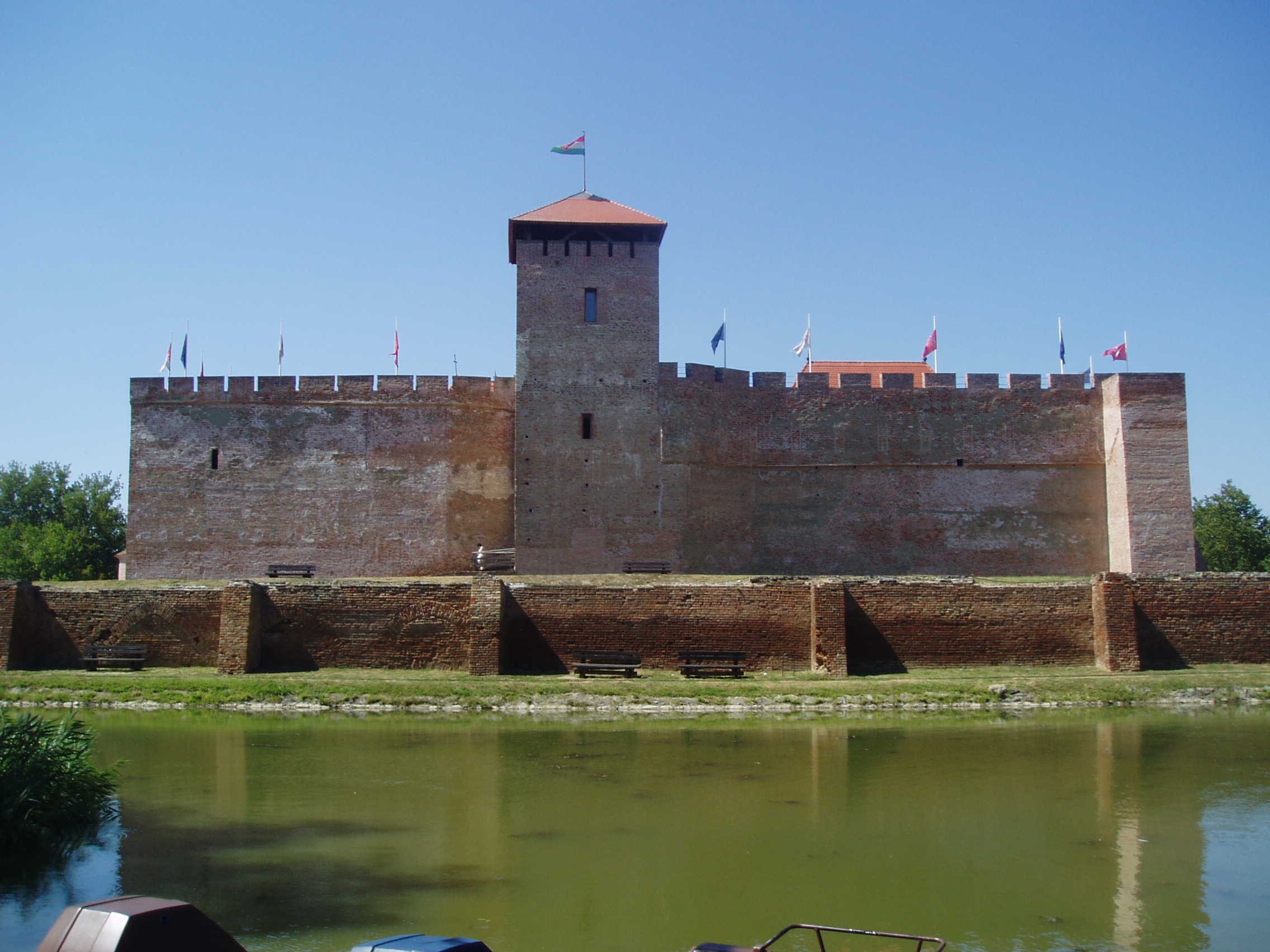 Nyilvános 1020 | 1491 | Gyula, Vár | Az Alföld egyetlen középkori téglavárát a Maróthy család építtette a XV. század első felében. Derékvárának saroktornyát 1482 után Corvin János emeltette (ma eszpresszó és borozó működik benne). Corvin János, mint a trónöröklésből kiszorított herceg 1482 és 1504 között volt a vár ura, s feleségével, Frangepán Beatrix-szel együtt gyakran tartózkodott itt. Corvin János 150-ben bekövetkezett halála után özvegye állandóan Gyulán lakott. 1508-ban itt halt meg leánya, Corvin Erzsébet, a Hunyadi család utolsó sarja. 1543-ban a vár történelmi esemény színhelye volt: itt tartott közös országgyűlést Fráter György elnökletével az Erdéllyel határos nyolc alföldi megye nemessége. 1552-től a vár a török elleni végvári rendszer láncszeme lett és ó-olasz bástyás palánkvárrá alakították át. 1566-ban került török kézre, miután erősítés hiányában, kilenc heti ostrom után Kerecsényi László kapitány kénytelen volt feladni. Bár a török szabad elvonulást ígért, a maradék védőket a janicsárok megtámadták és lemészárolták, Kerecsényi kapitányt pedig foglyul ejtették és Nándorfehérváron kivégezték. A vár 1695-ig volt török kézen. Akkori állapotát megörökítette leírásában Evlia Cselebi török világutazó. A Rákóczi-szabadságharc után az ún. huszárvárat lerombolták, csak a belső vár maradt meg. Az épület déli sarkán Tóth Béla: Végvári vitéz című lovas szobra áll. A vár két bejárata közül a délkeleti oldalon van az ún. Kerecsényi kapu. A boltíve alatti két helyiségben a helyi hagyomány szerint Damjanich János és Lahner György tábornok volt elszállásolva 1849 augusztusában. A várudvar 1964 óta a Gyulai Várszínház előadásainak színhelye. A belső termekben a közelmúltban nyílt meg a Vármúzeum. A vár előtt az egykori vizesárok kiszélesítésével csónakázótavat létesítettek, melynek közepén tószínpadot alakítottak ki. A fénykép 2007 júliusában készült. Felh. irod.: Czeglédi Imre: Gyula útikalauz. 2. jav., bőv. kiad. Gyula, 1995 www.vendegvaro.hu www.gyula.hu |
