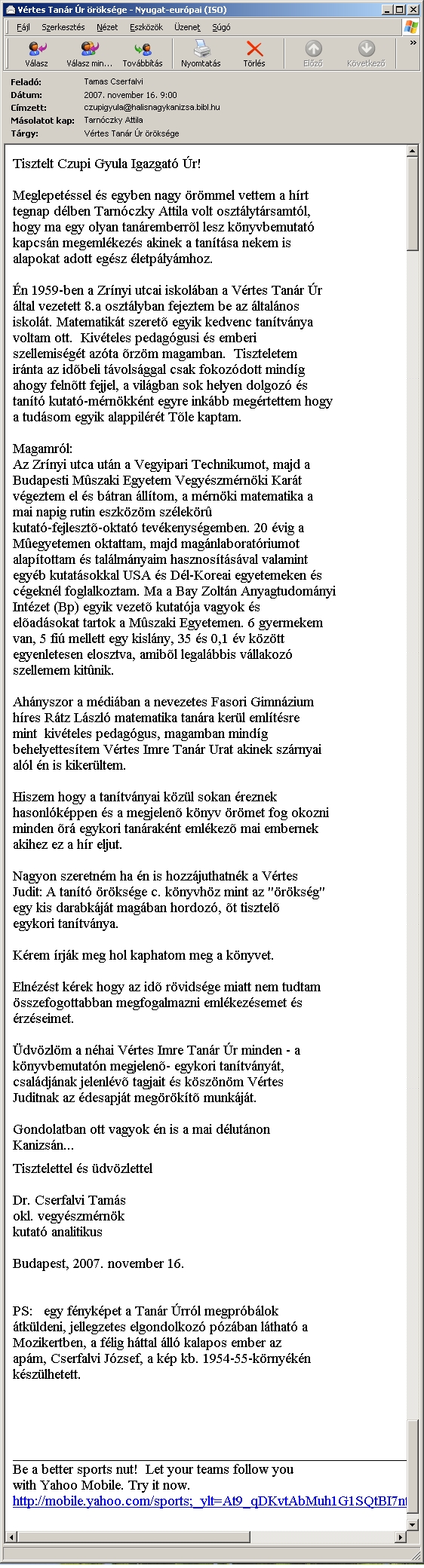 Nyilvános 1569 | 2767 | Cserfalvi tamás levele Vértes Imre estéjére | Tisztelt Czupi Gyula Igazgató Úr! Meglepetéssel és egyben nagy örömmel vettem a hírt tegnap délben Tarnóczky Attila volt osztálytársamtól, hogy ma egy olyan tanáremberről lesz könyvbemutató kapcsán megemlékezés akinek a tanítása nekem is alapokat adott egész életpályámhoz. Én 1959-ben a Zrínyi utcai iskolában a Vértes Tanár Úr által vezetett 8.a osztályban fejeztem be az általános iskolát. Matematikát szerető egyik kedvenc tanítványa voltam ott. Kivételes pedagógusi és emberi szellemiségét azóta őrzöm magamban. Tiszteletem iránta az időbeli távolsággal csak fokozódott mindíg ahogy felnőtt fejjel, a világban sok helyen dolgozó és tanító kutató-mérnökként egyre inkább megértettem hogy a tudásom egyik alappilérét Tőle kaptam. Magamról: Az Zrínyi utca után a Vegyipari Technikumot, majd a Budapesti Műszaki Egyetem Vegyészmérnöki Karát végeztem el és bátran állítom, a mérnöki matematika a mai napig rutin eszközöm szélekörű kutató-fejlesztő-oktató tevékenységemben. 20 évig a Műegyetemen oktattam, majd magánlaboratóriumot alapítottam és találmányaim hasznosításával valamint egyéb kutatásokkal USA és Dél-Koreai egyetemeken és cégeknél foglalkoztam. Ma a Bay Zoltán Anyagtudományi Intézet (Bp) egyik vezető kutatója vagyok és előadásokat tartok a Műszaki Egyetemen. 6 gyermekem van, 5 fiú mellett egy kislány, 35 és 0,1 év között egyenletesen elosztva, amiből legalábbis vállakozó szellemem kitűnik. Ahányszor a médiában a nevezetes Fasori Gimnázium híres Rátz László matematika tanára kerül említésre mint kivételes pedagógus, magamban mindíg behelyettesítem Vértes Imre Tanár Urat akinek szárnyai alól én is kikerültem. Hiszem hogy a tanítványai közül sokan éreznek hasonlóképpen és a megjelenő könyv örömet fog okozni minden őrá egykori tanáraként emlékező mai embernek akihez ez a hír eljut. Nagyon szeretném ha én is hozzájuthatnék a Vértes Judit: A tanító öröksége c. könyvhöz mint az "örökség" egy kis darabkáját magában hordozó, őt tisztelő egykori tanítványa. Kérem írják meg hol kaphatom meg a könyvet. Elnézést kérek hogy az idő rövidsége miatt nem tudtam összefogottabban megfogalmazni emlékezésemet és érzéseimet. Üdvözlöm a néhai Vértes Imre Tanár Úr minden - a könyvbemutatón megjelenő- egykori tanítványát, családjának jelenlévő tagjait és köszönöm Vértes Juditnak az édesapját megörökítő munkáját. Gondolatban ott vagyok én is a mai délutánon Kanizsán... Tisztelettel és üdvözlettel Dr. Cserfalvi Tamás okl. vegyészmérnök kutató analitikus Budapest, 2007. november 16. PS: egy fényképet a Tanár Úrról megpróbálok átküldeni, jellegzetes elgondolkozó pózában látható a Mozikertben, a félig háttal álló kalapos ember az apám, Cserfalvi József, a kép kb. 1954-55-környékén készülhetett. |