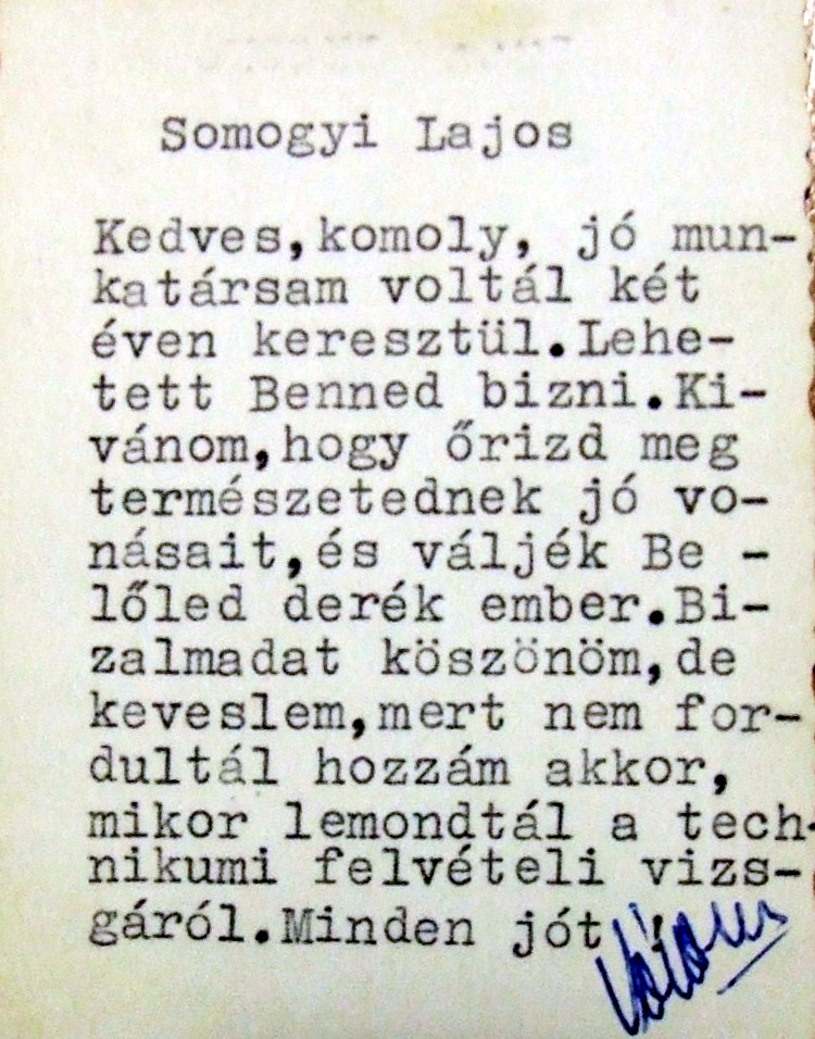 Somogyi Lajos 8. osztályos ballagási képének hátoldala, melyen Vértes Imre tőle búcsúzó gondolatai olvashatók.