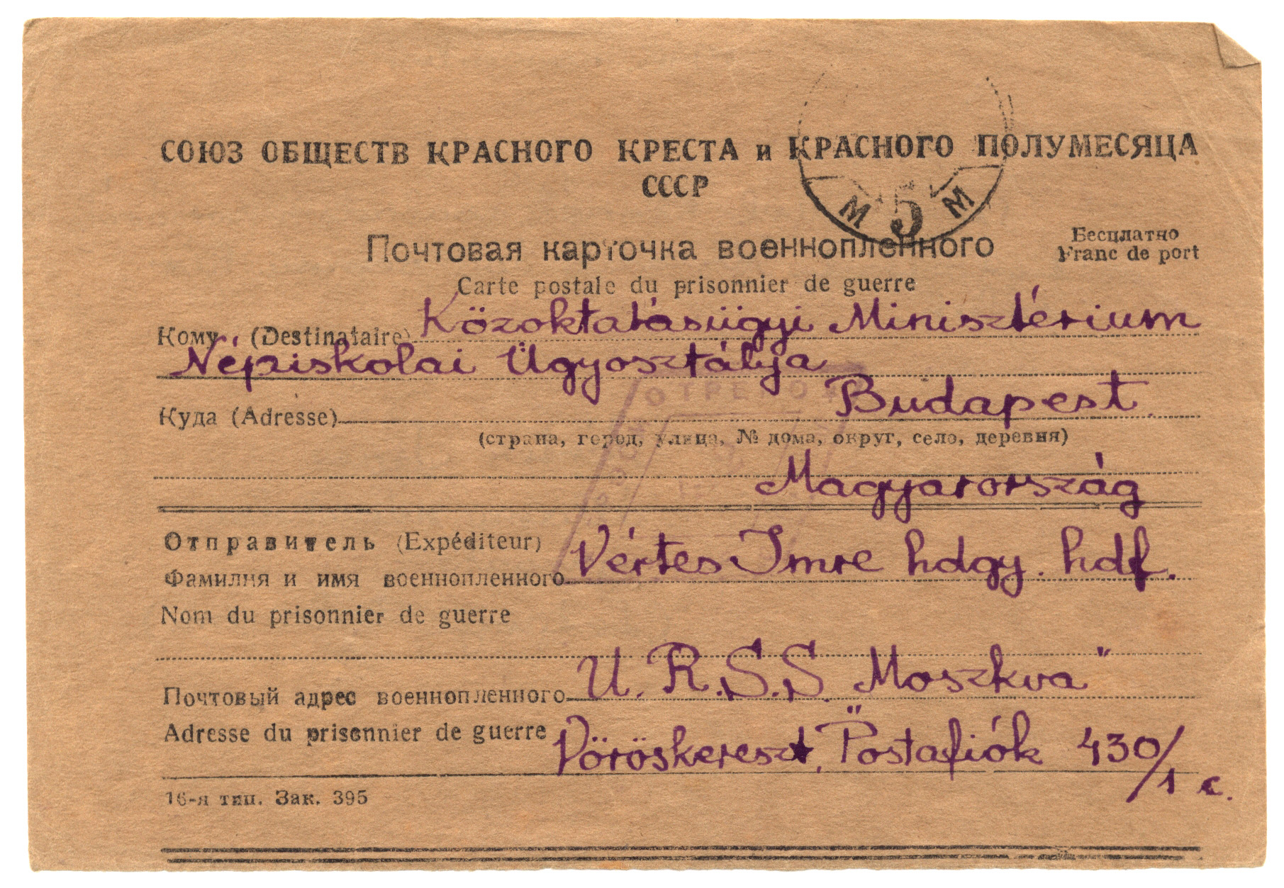 Nyilvános 1738 | 2758 | Közoktatásügyi Minisztérium Népiskolai Ügyosztálya | Budapest Magyarország Vértes Imre hdgy. hdf. U.R.S.S. "Moszkva" Vöröskereszt, Postafiók 430/1 c. 1946. november 2. Tisztelettel kérnék családom sorsáról tudósítást. Második éve semmi hír róluk. Vértes Imre állami népiskolai igazgató (Letenye, Zala vm.) |
