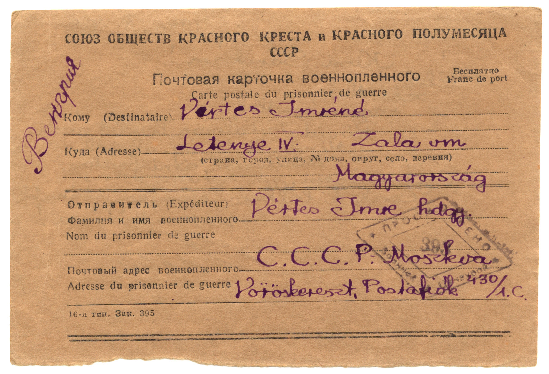 Nyilvános 1741 | 2763 | Vértes Imréné | Letenye IV. Zala vm. Magyarország Vértes Imre hdgy. C.C.C.P. Moszkva Vöröskereszt, Postafiók 430/1. c. 1946.X.20. Kicsi Sárikám! Élek, szeretlek, nagyon szeretlek. Rövid, tartalmas levelet várok. Mindenkiről írj, aki él. Mindenről, ami fontos. Egészségem, jó sorom van. Csak a lelkem szomjas utánatok. Viszontlátásra! Imre |