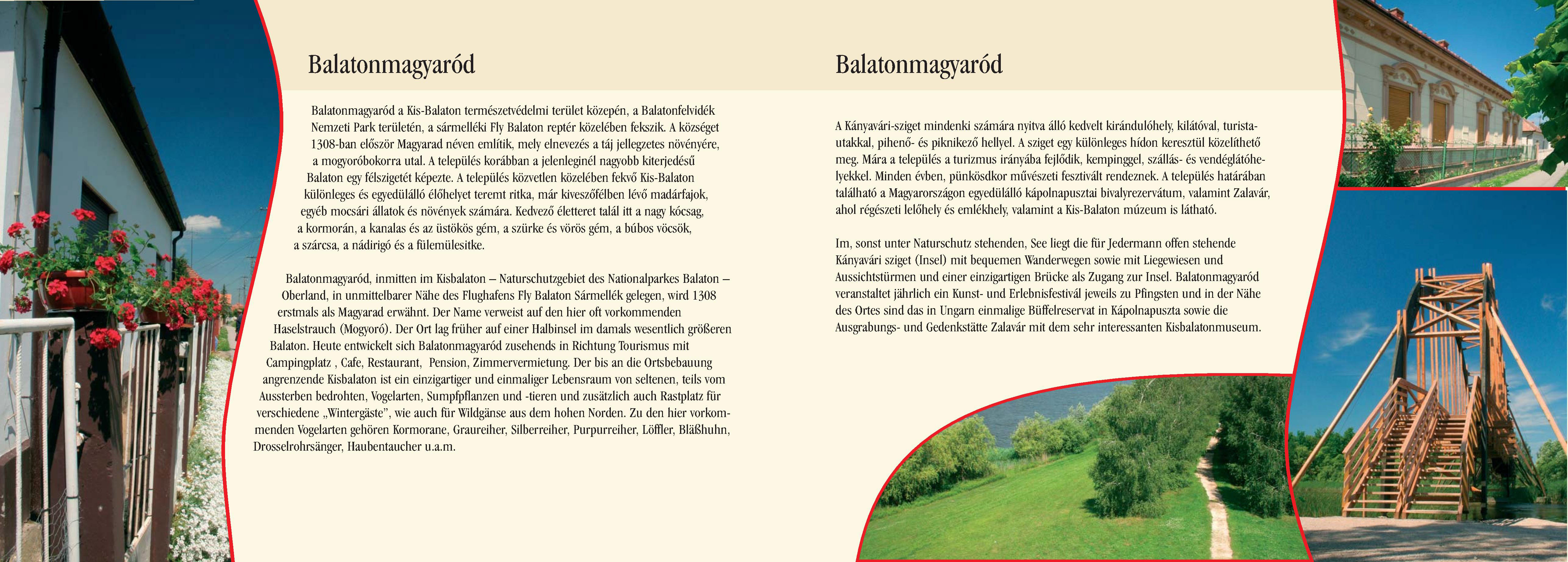 Nyilvános 2622 | 7055 | Balatonmagyaród | Balatonmagyaród, inmitten im Kisbalaton Naturschutzgebiet des Nationalparkes Balaton Oberland, in unmittelbarer Nähe des Flughafens Fly Balaton Sármellék gelegen, wird 1308 erstmals als Magyarad erwähnt. Der Name verweist auf den hier oft vorkommenden Haselstrauch (Mogyoró). Der Ort lag früher auf einer Halbinsel im damals wesentlich größeren Balaton. Heute entwickelt sich Balatonmagyaród zusehends in Richtung Tourismus mit Campingplatz , Cafe, Restaurant, Pension, Zimmervermietung. Der bis an die Ortsbebauung angrenzende Kisbalaton ist ein einzigartiger und einmaliger Lebensraum von seltenen, teils vom Aussterben bedrohten, Vogelarten, Sumpfpflanzen und -tieren und zusätzlich auch Rastplatz für verschiedene ,,Wintergäste", wie auch für Wildgänse aus dem hohen Norden. Zu den hier vorkommenden Vogelarten gehören Kormorane, Graureiher, Silberreiher, Purpurreiher, Löffler, Bläßhuhn, Drosselrohrsänger, Haubentaucher u.a.m. Im, sonst unter Naturschutz stehenden, See liegt die für Jedermann offen stehende Kányavári sziget (Insel) mit bequemen Wanderwegen sowie mit Liegewiesen und Aussichtstürmen und einer einzigartigen Brücke als Zugang zur Insel. Balatonmagyaród veranstaltet jährlich ein Kunst- und Erlebnisfestivál jeweils zu Pfingsten und in der Nähe des Ortes sind das in Ungarn einmalige Büffelreservat in Kápolnapuszta sowie die Ausgrabungs- und Gedenkstätte Zalavár mit dem sehr interessanten Kisbalatonmuseum. Dieses Text stammt von: Pannonhát tájpark prospektus 2006. Web: http://www.pannonhat.hu/ (auch in Deutsch) |