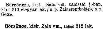 Nyilvános 1999 | 5588 | Börzöncze,kisk. Zala vm. kanizsai j.-ban, (1910) 310 magyar lak. ; u. p. Zalaszentbalázs, u. t. Gelse. Börzönce kisk. Zala Vm., (1920) 312 lak. Cím: Révai nagy lexikona Alcím: az ismeretek enciklopédiája Kiadás: Budapest : Révai testvérek, [1911]- Kötetei: 1. köt., A - Arany 2. köt., Arány - Beke 3. köt., Béke - Brutto 4. köt., Bratus - Csát 5. köt., Csata - Duc 6. köt., Duc - Etele 7. köt., Stelka - Földöv 8. köt., Földpálya - Gres 9. köt., Gréc - Herold 10. köt., Hérold - Jób 11. köt., Jób - Nontur 12. köt., Kontúr - Lovas 13. köt., Lovas - Mons 14. köt., Mens - Ottó 15. köt., Ottó - Racine 16. köt., Racine - Sodoma 17. köt., Sodoma - Tarján 18. köt., 19. köt., Vár - Zsüri | Kiegészítés Aachen - Beöthy 20. köt., Kiegészítés: Bér - Zsolt ETO jelzet: 03=945.11 Szakjelzet: 030 Cutter: R 62 Nyelv: magyar |