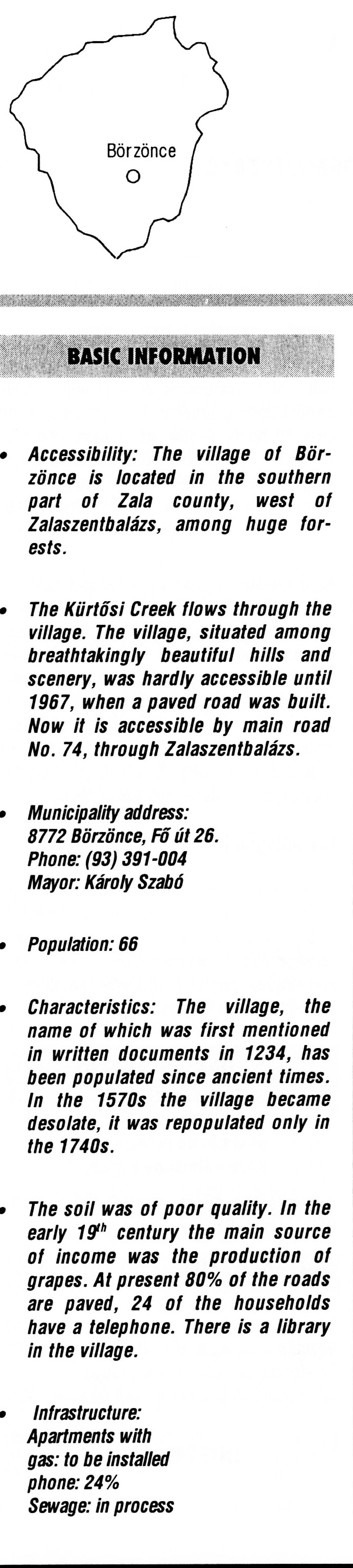 Nyilvános 1979 | 5611 | Börzönce | BASIC INFORMATION Accessibility: The village of Börzönce is located in the southern part of Zala county, west of Zalaszentbalázs, among huge forests. The Kürtősi Creek flows through the village. The village, situated among breathtakingly beautiful hills and scenery, was hardly accessible until 1967, when a paved road was built. Now it is accessible by main road No. 74, through Zalaszentbalázs. Municipality address: 8772 Börzönce, Fő út 26. Phone: (93) 391-004 Mayor: Károly Szabó Population: 66 Characteristics: The village, the name of which was first mentioned in written documents in 1234, has been populated since ancient times. In the 1570s the village became desolate, it was repopulated only in the 1740s. The soil was of poor quality. In the early 19th century the main source of income was the production of grapes. At present 80% of the roads are paved, 24 of the households have a telephone. There is a library in the village. Infrastructure: Apartments with gas: to be installed phone: 24% Sewage: in process This text came from the following book: Title: Handbook of Zala county (Zala megye kézikönyve) Series: County handbooks of Hungary (Magyarország megyei kézikönyvei) Chief editor: Hóbor József Publisher: (Hatvan), CEBA-Hungary Ltd, 1998 ETO: 908.439.121(035) ; 050.8(439.121) ISBN: 963-9089-18-2 Pages: 488-1040 p. Remark: Closed on: 1998. márc. 31. |