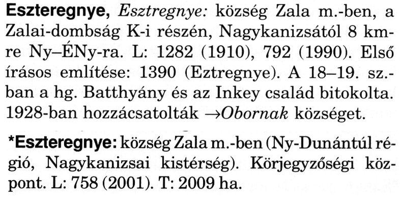Nyilvános 2225 | 6117 | Rövid leírás | Teljes leírás (2.13 KB) | A szócikkek felismertetett szövege: (A csillag után a kiegészítő kötetből származó szöveg következik) Eszteregnye, Esztregnye: község Zala m.-ben, a Zalai-dombság K-i részén, Nagykanizsától 8 km-re Ny-ÉNy-ra. L: 1282 (1910), 792 (1990). Első írásos említése: 1390 (Eztregnye). A 18–19. sz.-ban a hg. Batthyány és az Inkey család bitokolta. 1928-ban hozzácsatolták → Obornak községet. *Eszteregnye: község Zala m.-ben (Ny-Dunántúl régió, Nagykanizsai kistérség). Körjegyzőségi központ. L: 758 (2001). T: 2009 ha. A szócikkek a következő lexikonból származnak: Cím: Magyar nagylexikon Közreműködő: Élesztős László (1949) (szerk.) ; Barabás Éva (1943) (szerk.) ; Berényi Gábor (1946) (szerk.) ; Bárány Lászlóné (szerk.) ; Adelmann-né Kertész Judit (1945) (közrem.) ; Froemel Károlyné Jáky Éva (1936) (közrem.) ; Akadémiai Kiadó és Nyomda Vállala Szerz. közl.: [... Élesztős László főszerk.] ; [szerk. Barabás Éva et al.] ; [bibliogr. Adelmanné Kertész Judit] ; [kész. az Akadémiai Kiadó Magyar Nagylexikon Szerkesztőségében] Kiadás: Budapest : Akad. K., 1993- Kötetei: 1. köt., A - Anc 2. köt., And - Bag 3. köt., Bah - Bij 4. köt., Bik - Bz 5. köt., C - Csem 6. köt., Csen - Ec 7. köt., Ed - Fe 8. köt., Ff - Gyep 9. köt., Gyer - Iq 10. köt., Ir - Kip 11. köt., Kir - Lem 12. köt., Len - Mep 13. köt., Mer - Nyk 14. köt., Nyl - Pom 15. köt., Pon - Sek 16. köt., Sel - Szö 17. köt., Szp - Ung 18. köt., Unh - Z 19. köt., Kiegészítő kötet, A - Z ETO jelzet: 030=945.11 Szakjelzet: 030 Cutter: M 14 ISBN: 963-05-6611-7 [!ISBN 963-05-6615-X] Nyelv: magyar Megjegyzés: Az 5. kötettől kiad. a Magyar Nagylexikon Kiadó ; A 6. kötettől főszerk. Berényi Gábor ; A 6. kötettől szakszerk. Bárány Lászlóné et al. ; A 6. kötettől bibliogr. Froemel Károlyné ; Bibliogr. a szócikkek végén |