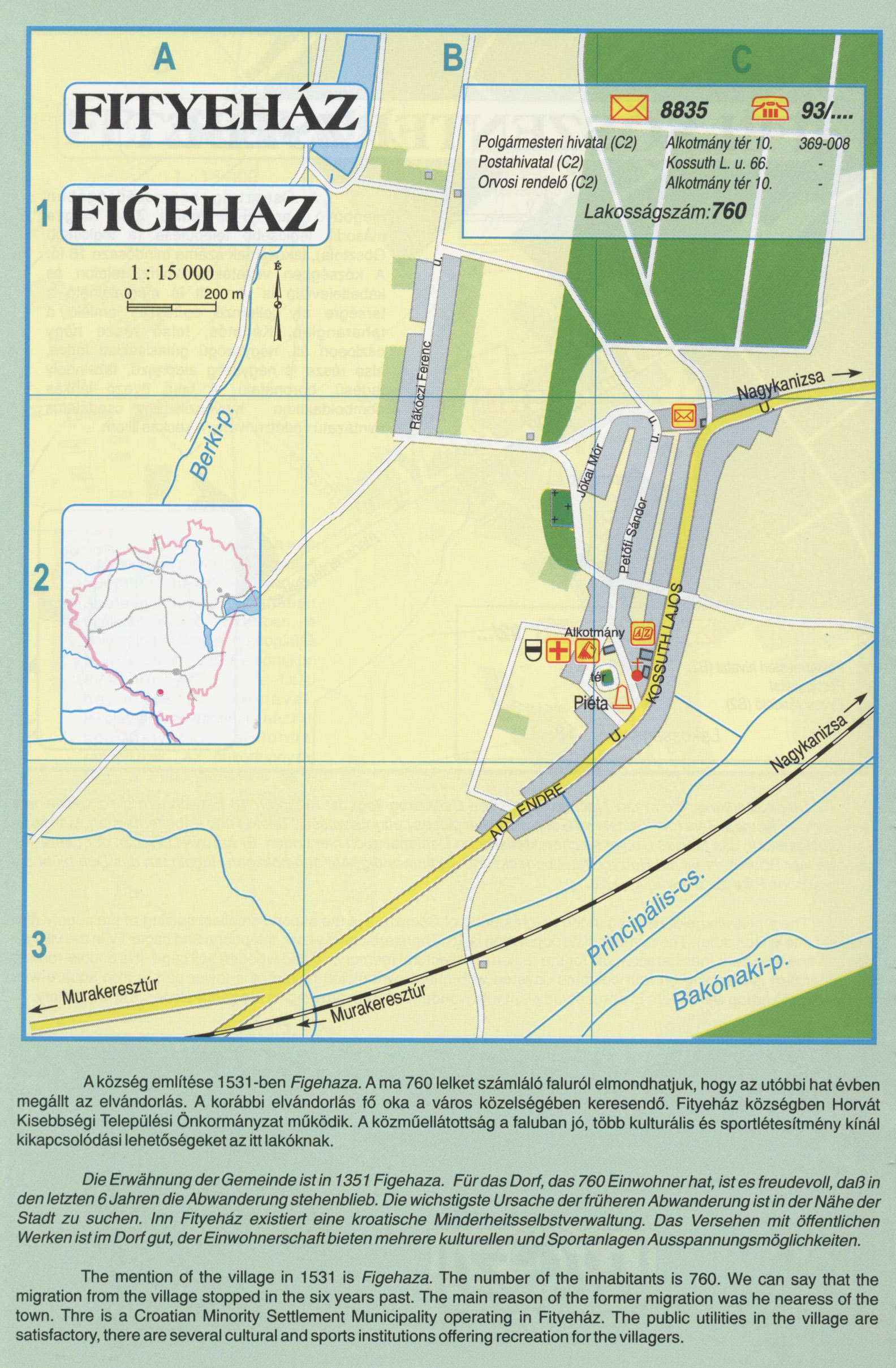 Nyilvános 2263 | 9128 | Rövid leírás | Teljes leírás (2.11 KB) | Fityeház A község említése 1531-ben Figehaza. A ma 760 lelket számláló faluról elmondhatjuk, hogy az utóbbi hat évben megállt az elvándorlás. A korábbi elvándorlás fő oka a város közelségében keresendő. Fityeház községben Horvát Kisebbségi Települési Önkormányzat működik. A közműellátottság a faluban jó, több kulturális és sportlétesítmény kínál kikapcsolódási lehetőségeket az itt lakóknak. Die Erwähnung der Gemeinde ist in 1351 Figehaza. FürdasDorf, das 760 Einwohner hat, ist es freudevoll, daßin den letzten 6 Jahren die Abwanderung stehenblieb. Die wichstigste Ursache der früheren Abwanderung ist in der Nähe der Stadt zu suchen. Inn Fityeház existiert eine kroatische Minderheitsselbstverwaltung. Das Versehen mit öffentlichen Werken ist im Dorf gut, der Einwohnerschaft bieten mehrere kulturellen und Sportanlagen Ausspannungsmöglichkeiten. The mention of the village in 1531 is Figehaza. The number of the inhabitants is 760. We can say that the migration from the village stopped in the six years past. The main reason of the former migration was he nearess of the town. Thre is a Croatian Minority Settlement Municipality operating in Fityeház. The public utilities in the village are satisfactory, there are several cultural and sports institutions offering recreation for the villagers. A részlet a következő kiadványból származik/Die Teile stammen vom volgenden Buch/This text came from the following book: Cím/Titel/Title: Zala megye településeinek atlasza - 257 település részletes térképe/Atlas der Komitat Zala - 257 Detailte Siedlungskarten/Zala county\'s Atlas - 257 settlement maps. Közreműködő/contributor: Lackner László (1943) (fotó) Kiadás/Ausgabe/Publisher: Gyula : HISZI-MAP, 1997 Sorozat/Serie/Series: Indulástól - megérkezésig... ETO: 912(439.121-2) ; 908.439.121 Cutter: Z 19 ISBN: 963-610-025-4 Oldalszám/Seiten/Pages: 323, 81 p. Megjegyzés/Note: Lezárva/Abgeschlossen am/Closed am: 1997. máj. 30. |
