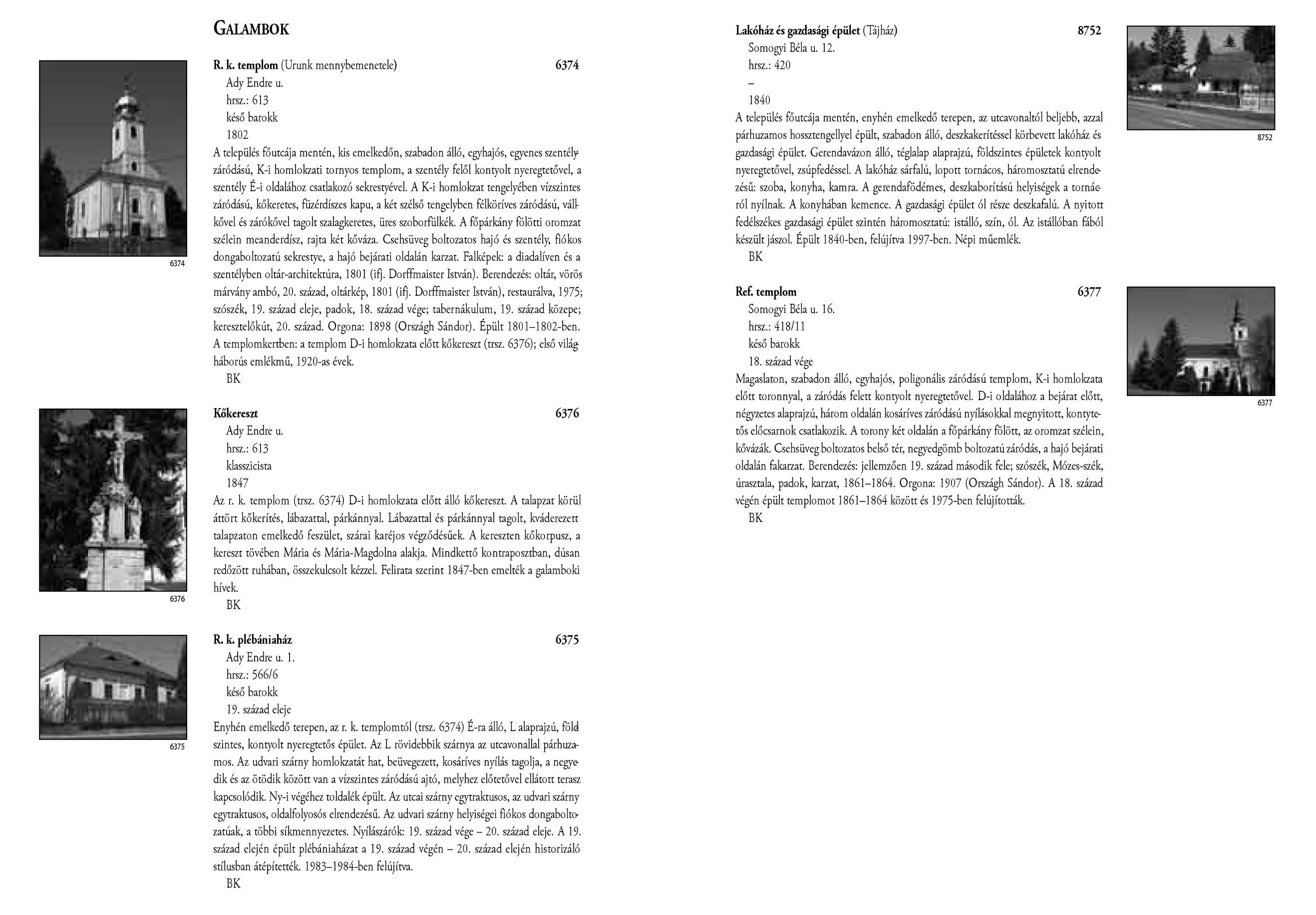 Nyilvános 1767 | 3833 | Galambok - Magyarország műemlékjegyzéke - Zala megye 2006 028-029old | A részlet szövege: GALAMBOK 6374 R. k. templom (Urunk mennybemenetele) Ady Endre u. hrsz.: 613 késő barokk 1802 A település főutcája mentén, kis emelkedőn, szabadon álló, egyhajós, egyenes szentélyzáródású, K-i homlokzati tornyos templom, a szentély felől kontyolt nyeregtetővel, a szentély É-i oldalához csatlakozó sekrestyével. A K-i homlokzat tengelyében vízszintes záródású, kőkeretes, füzérdíszes kapu, a két szélső tengelyben félköríves záródású, vállkővel és zárókővel tagolt szalagkeretes, üres szoborfülkék. A főpárkány fölötti oromzat szélein meanderdísz, rajta két kőváza. Csehsüveg boltozatos hajó és szentély, fiókos dongaboltozatú sekrestye, a hajó bejárati oldalán karzat. Falképek: a diadalíven és a szentélyben oltár-architektúra, 1801 (ifj. Dorffmaister István). Berendezés: oltár, vörös márvány ambó, 20. század, oltárkép, 1801 (ifj. Dorffmaister István), restaurálva, 1975; szószék, 19. század eleje, padok, 18. század vége; tabernákulum, 19. század közepe; keresztelőkút, 20. század. Orgona: 1898 (Országh Sándor). Épült 1801–1802-ben. A templomkertben: a templom D-i homlokzata előtt kőkereszt (trsz. 6376); első világháborús emlékmű, 1920-as évek. BK Kőkereszt 6376 Ady Endre u. hrsz.: 613 klasszicista 1847 Az r. k. templom (trsz. 6374) D-i homlokzata előtt álló kőkereszt. A talapzat körül áttört kőkerítés, lábazattal, párkánnyal. Lábazattal és párkánnyal tagolt, kváderezett talapzaton emelkedő feszület, szárai karéjos végződésűek. A kereszten kőkorpusz, a kereszt tövében Mária és Mária-Magdolna alakja. Mindkettő kontraposztban, dúsan redőzött ruhában, összekulcsolt kézzel. Felirata szerint 1847-ben emelték a galamboki hívek. BK 6375 R. k. plébániaház 6375 Ady Endre u. 1. hrsz.: 566/6 késő barokk 19. század eleje Enyhén emelkedő terepen, az r. k. templomtól (trsz. 6374) É-ra álló, L alaprajzú, földszintes, kontyolt nyeregtetős épület. Az L rövidebbik szárnya az utcavonallal párhuzamos. Az udvari szárny homlokzatát hat, beüvegezett, kosáríves nyílás tagolja, a negyedik és az ötödik között van a vízszintes záródású ajtó, melyhez előtetővel ellátott terasz kapcsolódik. Ny-i végéhez toldalék épült. Az utcai szárny egytraktusos, az udvari szárny egytraktusos, oldalfolyosós elrendezésű. Az udvari szárny helyiségei fiókos dongaboltozatúak, a többi síkmennyezetes. Nyílászárók: 19. század vége – 20. század eleje. A 19. század elején épült plébániaházat a 19. század végén – 20. század elején historizáló stílusban átépítették. 1983–1984-ben felújítva. BK Lakóház és gazdasági épület Somogyi Béla u. 12. hrsz.: 420 – (Tájház) 8752 A település főutcája mentén, enyhén emelkedő terepen, az utcavonaltól beljebb, azzal párhuzamos hossztengellyel épült, szabadon álló, deszkakerítéssel körbevett lakóház és gazdasági épület. Gerendavázon álló, téglalap alaprajzú, földszintes épületek kontyolt nyeregtetővel, zsúpfedéssel. A lakóház sárfalú, lopott tornácos, háromosztatú elrendezésű: szoba, konyha, kamra. A gerendafödémes, deszkaborítású helyiségek a tornácról nyílnak. A konyhában kemence. A gazdasági épület ól része deszkafalú. A nyitott fedélszékes gazdasági épület szintén háromosztatú: istálló, szín, ól. Az istállóban fából készült jászol. Épült 1840-ben, felújítva 1997-ben. Népi műemlék. BK Ref. templom 6377 Somogyi Béla u. 16. hrsz.: 418/11 késő barokk 18. század vége Magaslaton, szabadon álló, egyhajós, poligonális záródású templom, K-i homlokzata előtt toronnyal, a záródás felett kontyolt nyeregtetővel. D-i oldalához a bejárat előtt, négyzetes alaprajzú, három oldalán kosáríves záródású nyílásokkal megnyitott, kontytetős előcsarnok csatlakozik. A torony két oldalán a főpárkány fölött, az oromzat szélein, kővázák. Csehsüveg boltozatos belső tér, negyedgömb boltozatú záródás, a hajó bejárati oldalán fakarzat. Berendezés: jellemzően 19. század második fele; szószék, Mózes-szék, úrasztala, padok, karzat, 1861–1864. Orgona: 1907 (Országh Sándor). A 18. század végén épült templomot 1861–1864 között és 1975-ben felújították. BK A részlet a következő könyv online változatából származik: Cím: Magyarország műemlékjegyzéke Közreműködő: Haris Andrea. (szerk.) ; Kulturális Örökségvédelmi Hivatal (Budapest) (közread.) ; Somorjay Sélysette. (szerk.) ; Bardoly István (közrem.) Szerz. közl.: [sorozatszerk. Haris Andrea, Somorjay Sélysette] ; [mtárs Bardoly István] ; [közread. a] Kulturális Örökségvédelmi Hivatal. Kiadás: Budapest : KÖH, 2006 Kötetadat: Zala megye ISBN: 963-86510-7-5 ö ISBN: 963 7474 10 2 Nyelv: magyar A jegyzék a Kultúrális Örökségvédelmi Hivatal honlapján, a következő link alatt található: http://www.koh.hu/index.php?_mp=nyitolap&_amp=MUEML A fejléc adatairól 1. Objektum neve – törzsszám A fejléc első sora a műemlék eredeti rendeltetésének megfelelő nevet tartalmazza. Mögötte zárójelben templom esetében annak titulusa, más épületeknél indokolt esetben az eredeti rendeltetéstől eltérő, mai használatra utaló intézmény név (pl. városháza, múzeum, szálloda, oktatási intézmény hivatalos neve, stb.) olvasható. A törzsszám (trsz.) a műemlék egyetlen soha nem változó adata. A gyors azonosítás, illetve a törzsszám szerinti keresés lehetősége végett az objektummal egy sorban, a fejléc jobb szélén kiemelten jelenik meg. Összetartozó műemlék részek vagy történetileg egy együttest alkotó műemlékek sokszor külön törzsszámon lettek műemlékké nyilvánítva. Előfordulha