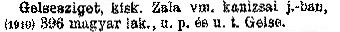 Nyilvános 2515 | 6387 | Cím: Révai nagy lexikona | Alcím: az ismeretek enciklopédiája Kiadás: Budapest : Révai testvérek, [1911]- Kötetei: 1. köt., A - Arany 2. köt., Arány - Beke 3. köt., Béke - Brutto 4. köt., Bratus - Csát 5. köt., Csata - Duc 6. köt., Duc - Etele 7. köt., Stelka - Földöv 8. köt., Földpálya - Gres 9. köt., Gréc - Herold 10. köt., Hérold - Jób 11. köt., Jób - Nontur 12. köt., Kontúr - Lovas 13. köt., Lovas - Mons 14. köt., Mens - Ottó 15. köt., Ottó - Racine 16. köt., Racine - Sodoma 17. köt., Sodoma - Tarján 18. köt., 19. köt., Vár - Zsüri | Kiegészítés Aachen - Beöthy 20. köt., Kiegészítés: Bér - Zsolt ETO jelzet: 03=945.11 Szakjelzet: 030 Cutter: R 62 Nyelv: magyar GELSESZIGET Gelsesziget, kisk. Zala vm. kanizsai j.-ban, (1910) 396 magyar lak., u. p. és u. t. Gelse. |
