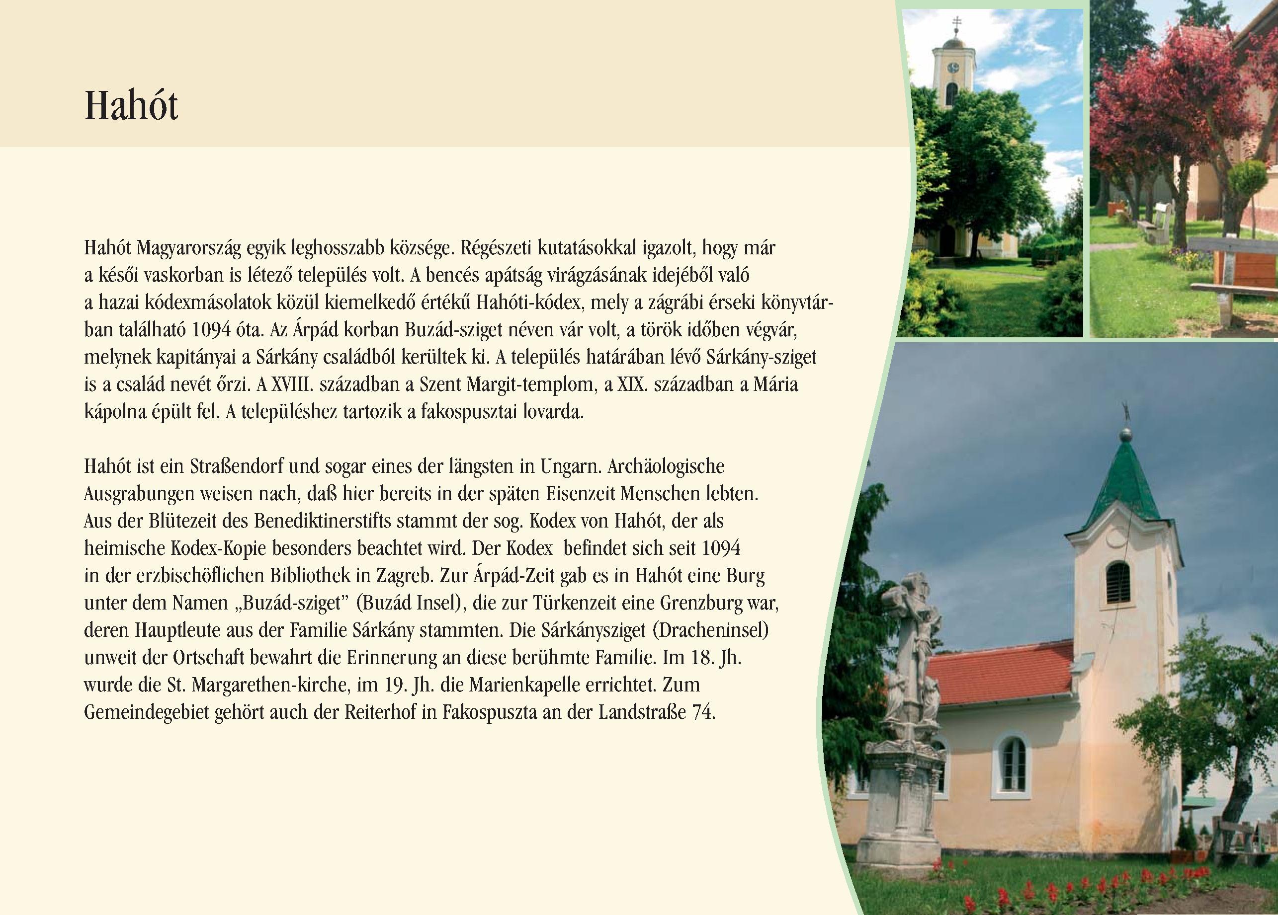 Nyilvános 2309 | 6848 | Rövid leírás | Teljes leírás (1.05 KB) | Hahót Hahót ist ein Straßendorf und sogar eines der längsten in Ungarn. Archäologische Ausgrabungen weisen nach, daß hier bereits in der späten Eisenzeit Menschen lebten. Aus der Blütezeit des Benediktinerstifts stammt der sog. Kodex von Hahót, der als heimische Kodex-Kopie besonders beachtet wird. Der Kodex befindet sich seit 1094 in der erzbischöflichen Bibliothek in Zagreb. Zur Árpád-Zeit gab es in Hahót eine Burg unter dem Namen ,,Buzád-sziget" (Buzád Insel), die zur Türkenzeit eine Grenzburg war, deren Hauptleute aus der Familie Sárkány stammten. Die Sárkánysziget (Dracheninsel) unweit der Ortschaft bewahrt die Erinnerung an diese berühmte Familie. Im 18. Jh. wurde die St. Margarethen-kirche, im 19. Jh. die Marienkapelle errichtet. Zum Gemeindegebiet gehört auch der Reiterhof in Fakospuszta an der Landstraße 74. Dieses Text stammt von: Pannonhát tájpark prospektus 2006. Web: http://www.pannonhat.hu/ (auch in Deutsch) |