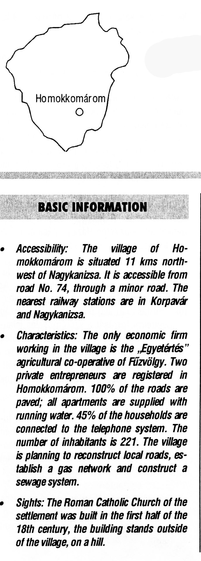 Nyilvános 2225 | 6247 | Homokkomárom | BASIC INFORMATION Accessibility: The village of Homokkomárom is situated 11 kms northwest of Nagykanizsa. It is accessible from road No. 74, through a minor road. The nearest railway stations are in Korpavár and Nagykanizsa. Characteristics: The only economic firm working in the village is the „Egyetértés” agricultural co-operative of Fűzvölgy. Two private entrepreneurs are registered in Homokkomárom. 100% of the roads are paved; all apartments are supplied with running water. 45% of the households are connected to the telephone system. The number of inhabitants is 221. The village is planning to reconstruct local roads, establish a gas network and construct a sewage system. Sights: The Roman Catholic Church of the settlement was built in the first half of the 18th century, the building stands outside of the village, on a hill. This text came from the following book: Title: Handbook of Zala county (Zala megye kézikönyve) Series: County handbooks of Hungary (Magyarország megyei kézikönyvei) Chief editor: Hóbor József Publisher: (Hatvan), CEBA-Hungary Ltd, 1998 ETO: 908.439.121(035) ; 050.8(439.121) ISBN: 963-9089-18-2 Pages: 488-1040 p. Remark: Closed on: 1998. márc. 31. |