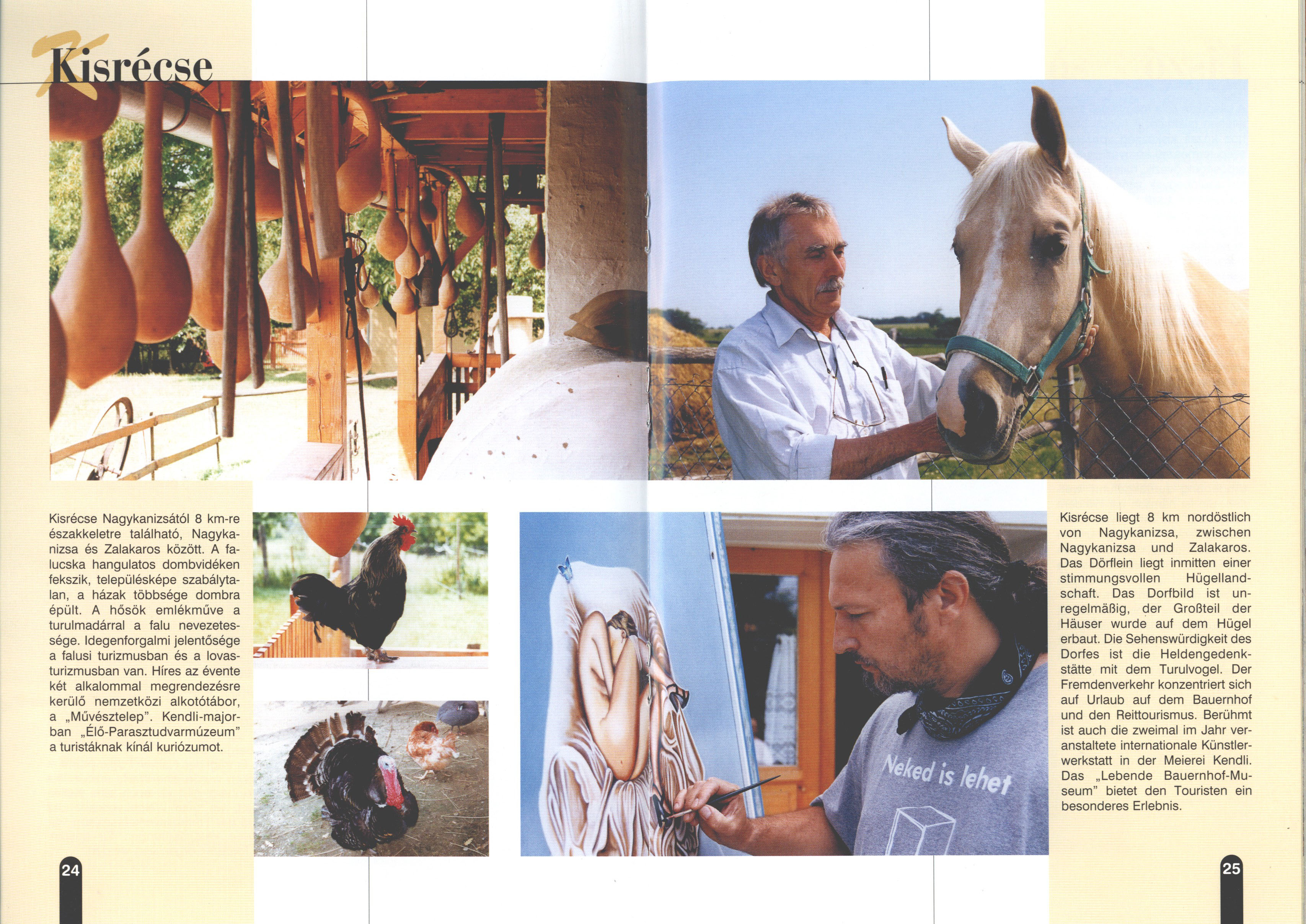Nyilvános 2237 | 7786 | Rövid leírás | Teljes leírás (1.79 KB) | Kisrécse Kisrécse Nagykanizsától 8 km-re északkeletre található, Nagykanizsa és Zalakaros között. A falucska hangulatos dombvidéken fekszik, településképe szabálytalan, a házak többsége dombra épült. A hősök emlékműve a turulmadárral a falu nevezetessége. Idegenforgalmi jelentősége a falusi turizmusban és a lovasturizmusban van. Híres az évente két alkalommal megrendezésre kerülő nemzetközi alkotótábor, a „Művésztelep". Kendli-majorban „Élő-Parasztudvarmúzeum" a turistáknak kínál kuriózumot. Kisrécse liegt 8 km nordöstlich von Nagykanizsa, zwischen Nagykanizsa und Zalakaros. Das Dörflein liegt inmitten einer stimmungsvollen Hügellandschaft. Das Dorfbild ist unregelmäßig, der Großteil der Häuser wurde auf dem Hügel erbaut. Die Sehenswürdigkeit des Dorfes ist die Heldengedenkstätte mit dem Turulvogel. Der Fremdenverkehr konzentriert sich auf Urlaub auf dem Bauernhof und den Reittourismus. Berühmt ist auch die zweimal im Jahr veranstaltete internationale Künstlerwerkstatt in der Meierei Kendli. Das „Lebende Bauernhof-Museum" bietet den Touristen ein besonderes Erlebnis. Dieses Text stammt von: Titel: Hívogató a Régiók Kapujában - Útikönyv Látnivalók Nagykanizsán és Térségében (Einladend in dem Tor des Gebiets - Reisebuch - Sehenswürdigkeiten in Nagykanizsa und Umgebung) Herausgegeben von: Nagykanizsa és a Környező Települések Területfejlesztési Társulása (Verein für Gebietsentwicklung in Nagykanizsa und in ihrer Umgebung) 8800 Nagykanizsa, Petőfi Sándor út 5. Tel.: 06 93/536-453 • 06 93/536-454 Tel ./Fax: 06 93/326-323 E-mail: terstars@axelero.hu www.kanizsaterseg.celodin.hu |