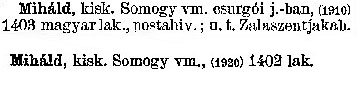 Nyilvános 2654 | 6262 | Miháld | kisk. Somogy vm. csurgói j. -ban, (1910) 1403 magyar lak., postahiv.; u. t. Zalaszentjakab. Miháld kisk. Somogy vm., (1920) 1402 lak. Cím: Révai nagy lexikona Alcím: az ismeretek enciklopédiája Kiadás: Budapest : Révai testvérek, [1911]- Kötetei: 1. köt., A - Arany 2. köt., Arány - Beke 3. köt., Béke - Brutto 4. köt., Bratus - Csát 5. köt., Csata - Duc 6. köt., Duc - Etele 7. köt., Stelka - Földöv 8. köt., Földpálya - Gres 9. köt., Gréc - Herold 10. köt., Hérold - Jób 11. köt., Jób - Nontur 12. köt., Kontúr - Lovas 13. köt., Lovas - Mons 14. köt., Mens - Ottó 15. köt., Ottó - Racine 16. köt., Racine - Sodoma 17. köt., Sodoma - Tarján 18. köt., 19. köt., Vár - Zsüri | Kiegészítés Aachen - Beöthy 20. köt., Kiegészítés: Bér - Zsolt ETO jelzet: 03=945.11 Szakjelzet: 030 Cutter: R 62 Nyelv: magyar |