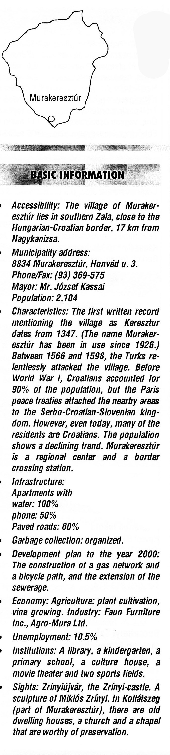 Nyilvános 2250 | 6152 | Murakeresztúr | BASIC INFORMATION Accessibility: The village of Murakeresztúr lies in southern Zala, close to the Hungarian-Croatian border, 17 km from Nagykanizsa. Municipality address: 8834 Murakeresztúr, Honvéd u. 3. Phone/Fax: (93) 369-575 Mayor: Mr. József Kassai Population: 2,104 Characteristics: The first written record mentioning the village as Keresztur dates from 1347. (The name Murakeresztúr has been in use since 1926.) Between 1566 and 1598, the Turks relentlessly attacked the village. Before World War I, Croatians accounted for 90% of the population, but the Paris peace treaties attached the nearby areas to the Serbo-Croatian-Slovenian kingdom. However, even today, many of the residents are Croatians. The population shows a declining trend. Murakeresztúr is a regional center and a border crossing station. Infrastructure: Apartments with water: 100% phone: 50% Paved roads: 60% Garbage collection: organized. Development plan to the year 2000: The construction of a gas network and a bicycle path, and the extension of the sewerage. Economy: Agriculture: plant cultivation, vine growing. Industry: Faun Furniture Inc., Agro-Mura Ltd. Unemployment: 10.5% Institutions: A library, a kindergarten, a primary school, a culture house, a movie theater and two sports fields. Sights: Zrínyiújvár, the Zrínyi-castle. A sculpture of Miklós Zrínyi. In Kollátszeg (part of Murakeresztúr), there are old dwelling houses, a church and a chapel that are worthy of preservation. This text came from the following book: Title: Handbook of Zala county (Zala megye kézikönyve) Series: County handbooks of Hungary (Magyarország megyei kézikönyvei) Chief editor: Hóbor József Publisher: (Hatvan), CEBA-Hungary Ltd, 1998 ETO: 908.439.121(035) ; 050.8(439.121) ISBN: 963-9089-18-2 Pages: 488-1040 p. Remark: Closed on: 1998. márc. 31. |