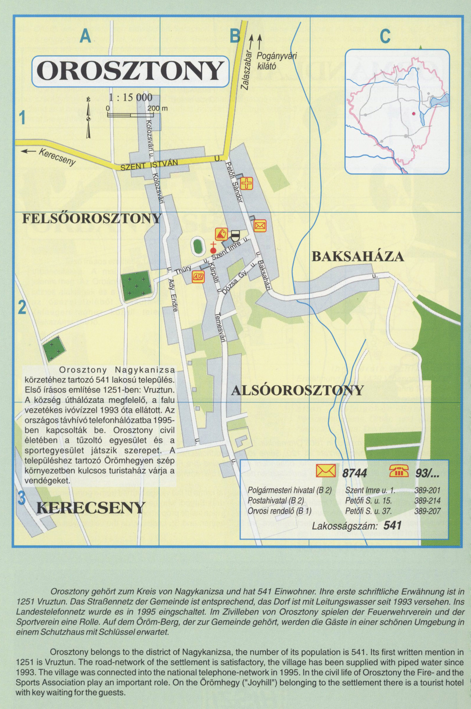 Nyilvános 2563 | 9798 | Rövid leírás | Teljes leírás (2.25 KB) | OROSZTONY Orosztony Nagykanizsa körzetéhez tartozó 541 lakosú település. Első írásos említése 1251-ben: Vruztun. A község úthálózata megfelelő, a falu. vezetékes ivóvízzel 1993 óta ellátott. Az országos távhívó telefonhálózatba 1995-ben kapcsolták be. Orosztony civil életében a tűzoltó egyesület és a sportegyesület játszik szerepet. A településhez tartozó Örömhegyen szép környezetben kulcsos turistaház várja a vendégeket. Orosztony gehört zum Kreis von Nagykanizsa und hat 541 Einwohner. Ihre erste schriftliche Erwähnung ist in 1251 Vruztun. Das Straßennetz der Gemeinde ist entsprechend, das Dorf ist mit Leitungswasser seit 1993 versehen. Ins Landestelefonnetz wurde es in 1995 eingschaltet. Im Zivilleben von Orosztony spielen der Feuerwehrverein und der Sportverein eine Rolle. Auf dem Öröm-Berg, der zur Gemeinde gehört, werden die Gäste in einer schönen Umgebung in einem Schutzhaus mit Schlüssel erwartet. Orosztony belongs to the district of Nagykanizsa, the number of its population is 541. Its first written mention in 1251 is Vruztun. The road-network of the settlement is satisfactory, the village has been supplied with piped water since 1993. The village was connected into the national telephone-network in 1995. In the civil life of Orosztony the Fire- and the Sports Association play an important role. On the Örömhegy ("Joyhill") belonging to the settlement there is a tourist hotel with key waiting forthe guests. A részlet a következő kiadványból származik/Die Teile stammen vom volgenden Buch/This text came from the following book: Cím/Titel/Title: Zala megye településeinek atlasza - 257 település részletes térképe/Atlas der Komitat Zala - 257 Detailte Siedlungskarten/Zala county\'s Atlas - 257 settlement maps. Közreműködő/contributor: Lackner László (1943) (fotó) Kiadás/Ausgabe/Publisher: Gyula : HISZI-MAP, 1997 Sorozat/Serie/Series: Indulástól - megérkezésig... ETO: 912(439.121-2) ; 908.439.121 Cutter: Z 19 ISBN: 963-610-025-4 Oldalszám/Seiten/Pages: 323, 81 p. Megjegyzés/Note: Lezárva/Abgeschlossen am/Closed am: 1997. máj. 30. |