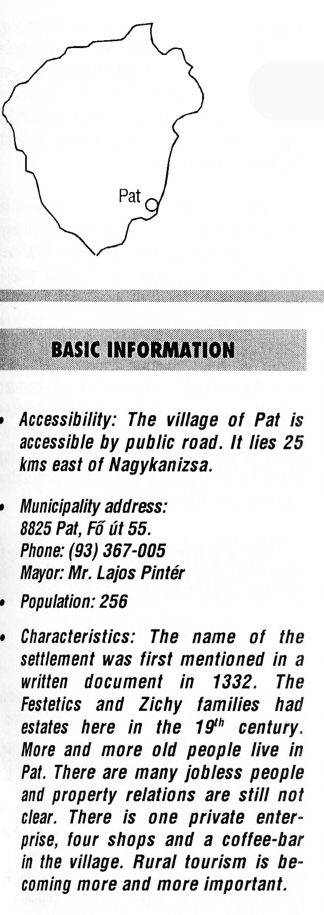 Nyilvános 2364 | 5834 | Rövid leírás | Teljes leírás (1.12 KB) | Pat BASIC INFORMATION Accessibility: The village of Pat is accessible by public road. It lies 25 kms east of Nagykanizsa. Municipality address: 8825 Pat, Fő út 55. Phone: (93) 367-005 Mayor: Mr. Lajos Pintér Population: 256 Characteristics: The name of the settlement was first mentioned in a written document in 1332. The Festetics and Zichy families had estates here in the 19th century. More and more old people live in Pat. There are many jobless people and property relations are still not clear. There is one private enter¬prise, four shops and a coffee-bar in the village. Rural tourism is be¬coming more and more important. This text came from the following book: Title: Handbook of Zala county (Zala megye kézikönyve) Series: County handbooks of Hungary (Magyarország megyei kézikönyvei) Chief editor: Hóbor József Publisher: (Hatvan), CEBA-Hungary Ltd, 1998 ETO: 908.439.121(035) ; 050.8(439.121) ISBN: 963-9089-18-2 Pages: 488-1040 p. Remark: Closed on: 1998. márc. 31. |