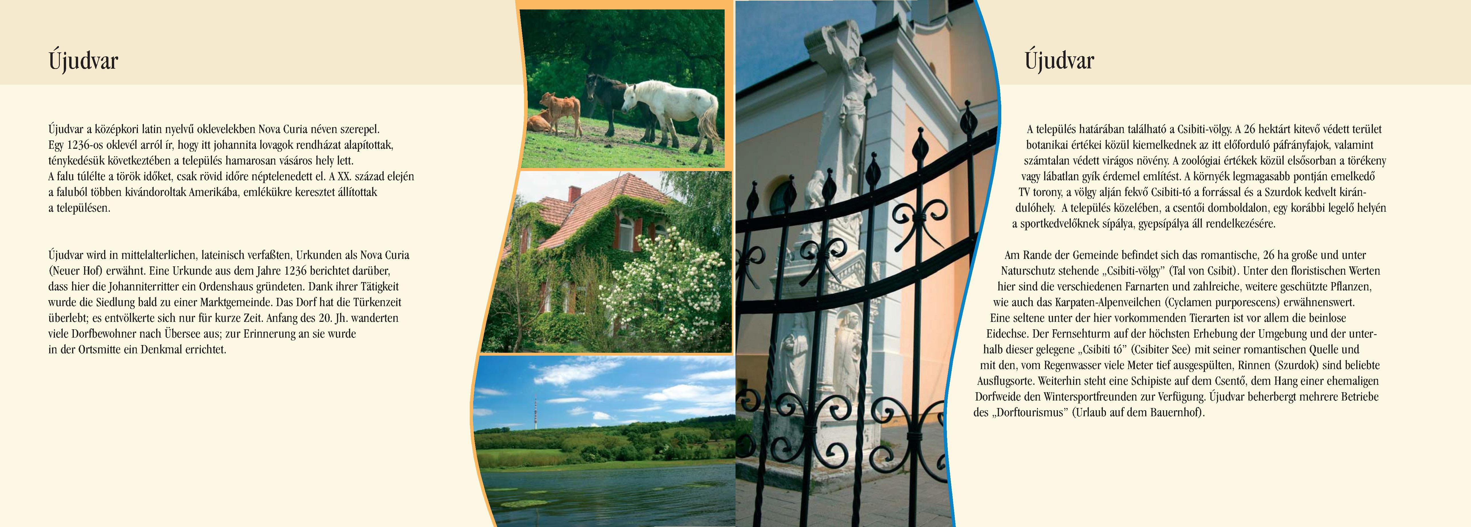 Nyilvános 2211 | 7802 | Rövid leírás | Teljes leírás (1.6 KB) | Újudvar Újudvar wird in mittelalterlichen, lateinisch verfaßten, Urkunden als Nova Curia (Neuer Hof) erwähnt. Eine Urkunde aus dem Jahre 1236 berichtet darüber, dass hier die Johanniterritter ein Ordenshaus gründeten. Dank ihrer Tätigkeit wurde die Siedlung bald zu einer Marktgemeinde. Das Dorf hat die Türkenzeit überlebt; es entvölkerte sich nur für kurze Zeit. Anfang des 20. Jh. wanderten viele Dorfbewohner nach Übersee aus; zur Erinnerung an sie wurde in der Ortsmitte ein Denkmal errichtet. Am Rande der Gemeinde befindet sich das romantische, 26 ha große und unter Naturschutz stehende ,,Csibiti-völgy" (Tal von Csibit). Unter den floristischen Werten hier sind die verschiedenen Farnarten und zahlreiche, weitere geschützte Pflanzen, wie auch das Karpaten-Alpenveilchen (Cyclamen purporescens) erwähnenswert. Eine seltene unter der hier vorkommenden Tierarten ist vor allem die beinlose Eidechse. Der Fernsehturm auf der höchsten Erhebung der Umgebung und der unterhalb dieser gelegene ,,Csibiti tó" (Csibiter See) mit seiner romantischen Quelle und mit den, vom Regenwasser viele Meter tief ausgespülten, Rinnen (Szurdok) sind beliebte Ausflugsorte. Weiterhin steht eine Schipiste auf dem Csentő, dem Hang einer ehemaligen Dorfweide den Wintersportfreunden zur Verfügung. Újudvar beherbergt mehrere Betriebe des ,,Dorftourismus" (Urlaub auf dem Bauernhof). Dieses Text stammt von: Pannonhát tájpark prospektus 2006. Web: http://www.pannonhat.hu/ (auch in Deutsch) |