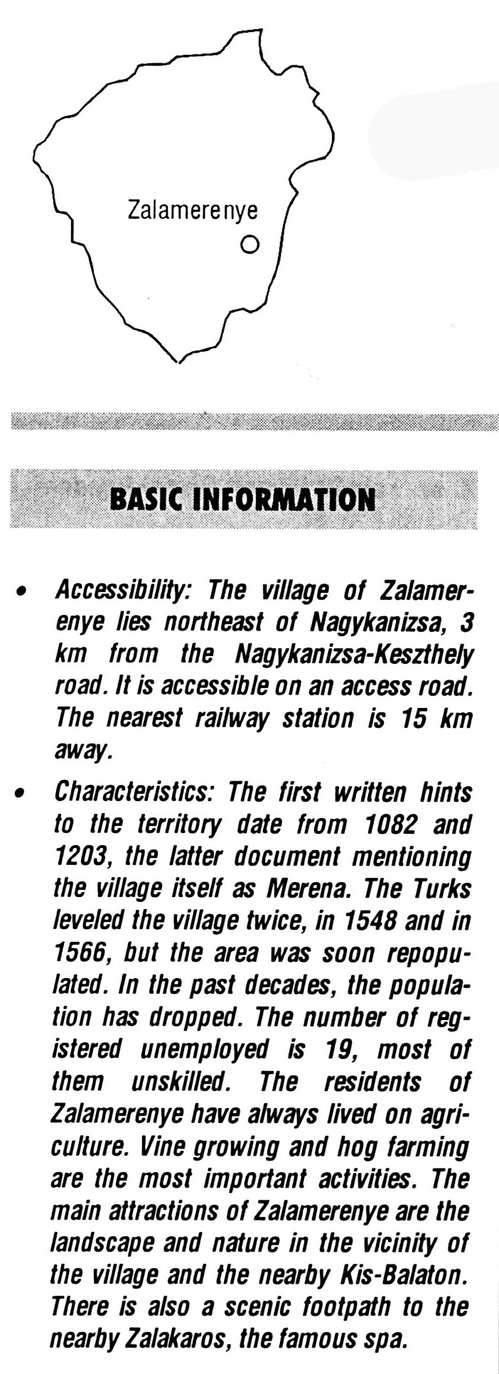 Nyilvános 2106 | 5836 | Zalamerenye | BASIC INFORMATION Accessibility: The village of Zalamerenye lies northeast of Nagykanizsa, 3 km from the Nagykanizsa-Keszthely road. It is accessible on an access road. The nearest railway station is 15 km away. Characteristics: The first written hints to the territory date from 1082 and 1203, the latter document mentioning the village itself as Merena. The Turks leveled the village twice, in 1548 and in 1566, but the area was soon repopu-lated. In the past decades, the population has dropped. The number of registered unemployed is 19, most of them unskilled. The residents of Zalamerenye have always lived on agriculture. Vine growing and hog farming are the most important activities. The main attractions of Zalamerenye are the landscape and nature in the vicinity of the village and the nearby Kis-Balaton. There is also a scenic footpath to the nearby Zalakaros, the famous spa. This text came from the following book: Title: Handbook of Zala county (Zala megye kézikönyve) Series: County handbooks of Hungary (Magyarország megyei kézikönyvei) Chief editor: Hóbor József Publisher: (Hatvan), CEBA-Hungary Ltd, 1998 ETO: 908.439.121(035) ; 050.8(439.121) ISBN: 963-9089-18-2 Pages: 488-1040 p. Remark: Closed on: 1998. márc. 31. |