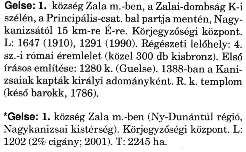 Nyilvános 2708 | 7117 | A szócikkek felismertetett szövege: | (A csillag után a kiegészítő kötetből származó szöveg következik) Gelse: 1. község Zala m.-ben, a Zalai-dombság K-i szélén, a Principális-csat, bal partja mentén, Nagykanizsától 15 km-re É-re. Körjegyzőségi központ. L: 1647 (1910), 1291 (1990). Régészeti lelőhely: 4. sz.-i római éremlelet (közel 300 db kisbronz). Első írásos említése: 1280 k. (Guelse). 1388-ban a Kanizsaiak kapták királyi adományként. R. k. templom (késő barokk, 1786). *Gelse: 1. község Zala m.-ben (Ny-Dunántúl régió, Nagykanizsai kistérség). Körjegyzőségi központ. L: 1202 (2% cigány; 2001). T: 2245 ha. A szócikkek a következő lexikonból származnak: Cím: Magyar nagylexikon Közreműködő: Élesztős László (1949) (szerk.) ; Barabás Éva (1943) (szerk.) ; Berényi Gábor (1946) (szerk.) ; Bárány Lászlóné (szerk.) ; Adelmann-né Kertész Judit (1945) (közrem.) ; Froemel Károlyné Jáky Éva (1936) (közrem.) ; Akadémiai Kiadó és Nyomda Vállala Szerz. közl.: [... Élesztős László főszerk.] ; [szerk. Barabás Éva et al.] ; [bibliogr. Adelmanné Kertész Judit] ; [kész. az Akadémiai Kiadó Magyar Nagylexikon Szerkesztőségében] Kiadás: Budapest : Akad. K., 1993- Kötetei: 1. köt., A - Anc 2. köt., And - Bag 3. köt., Bah - Bij 4. köt., Bik - Bz 5. köt., C - Csem 6. köt., Csen - Ec 7. köt., Ed - Fe 8. köt., Ff - Gyep 9. köt., Gyer - Iq 10. köt., Ir - Kip 11. köt., Kir - Lem 12. köt., Len - Mep 13. köt., Mer - Nyk 14. köt., Nyl - Pom 15. köt., Pon - Sek 16. köt., Sel - Szö 17. köt., Szp - Ung 18. köt., Unh - Z 19. köt., Kiegészítő kötet, A - Z ETO jelzet: 030=945.11 Szakjelzet: 030 Cutter: M 14 ISBN: 963-05-6611-7 [!ISBN 963-05-6615-X] Nyelv: magyar Megjegyzés: Az 5. kötettől kiad. a Magyar Nagylexikon Kiadó ; A 6. kötettől főszerk. Berényi Gábor ; A 6. kötettől szakszerk. Bárány Lászlóné et al. ; A 6. kötettől bibliogr. Froemel Károlyné ; Bibliogr. a szócikkek végén |