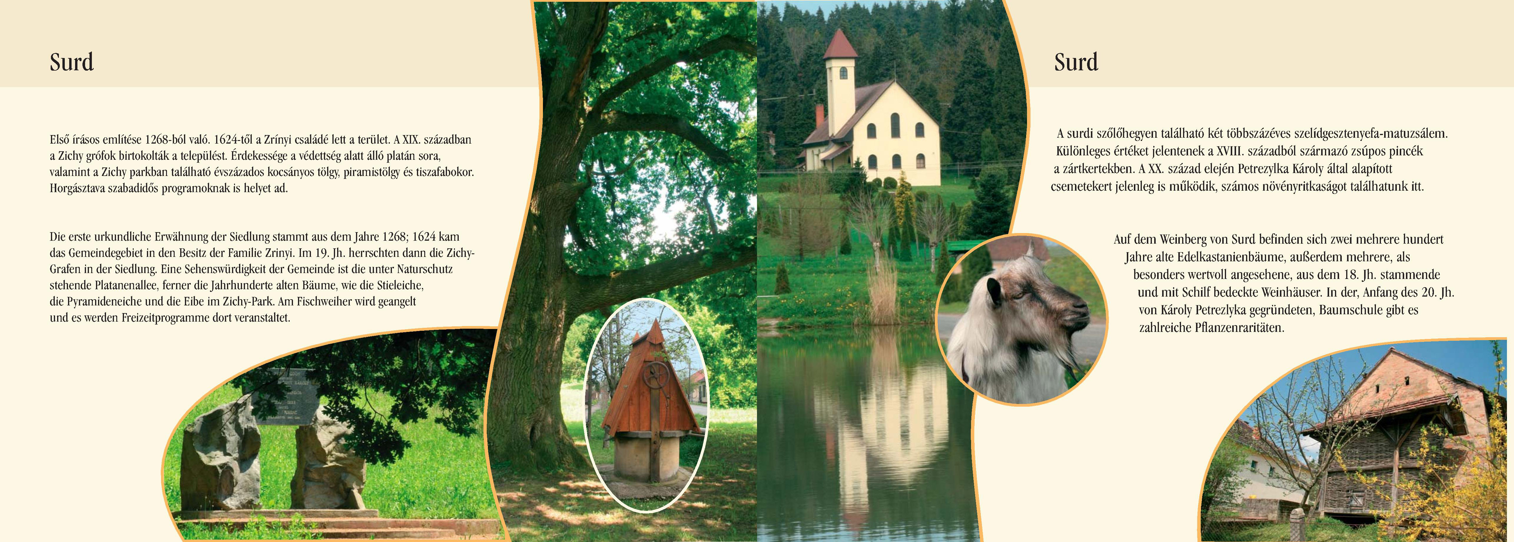 Nyilvános 2978 | 9298 | Surd | Die erste urkundliche Erwähnung der Siedlung stammt aus dem Jahre 1268; 1624 kam das Gemeindegebiet in den Besitz der Familie Zrinyi. Im 19. Jh. herrschten dann die Zichy-Grafen in der Siedlung. Eine Sehenswürdigkeit der Gemeinde ist die unter Naturschutz stehende Platanenallee, ferner die Jahrhunderte alten Bäume, wie die Stieleiche, die Pyramideneiche und die Eibe im Zichy-Park. Am Fischweiher wird geangelt und es werden Freizeitprogramme dort veranstaltet. Auf dem Weinberg von Surd befinden sich zwei mehrere hundert Jahre alte Edelkastanienbäume, außerdem mehrere, als besonders wertvoll angesehene, aus dem 18. Jh. stammende und mit Schilf bedeckte Weinhäuser. In der, Anfang des 20. Jh. von Károly Petrezlyka gegründeten, Baumschule gibt es zahlreiche Pflanzenraritäten. Dieses Text stammt von: Pannonhát tájpark prospektus 2006. Web: http://www.pannonhat.hu/ (auch in Deutsch |