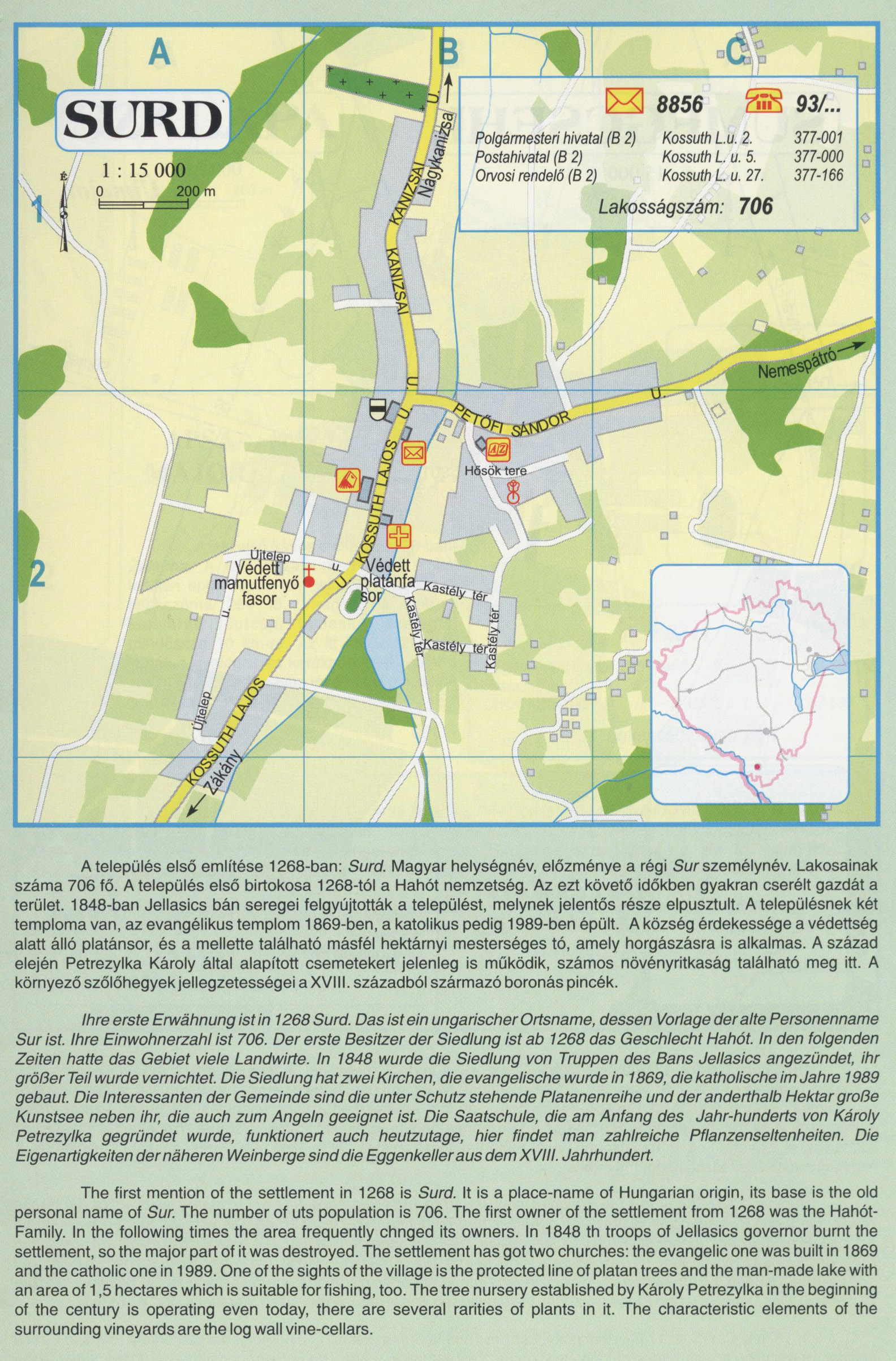Nyilvános 3079 | 10786 | Rövid leírás | Teljes leírás (3.38 KB) | SURD A település első említése 1268-ban: Surd. Magyar helységnév, előzménye a régi Sur személynév. Lakosainak száma 706 fő. A település első birtokosa 1268-tól a Hahót nemzetség. Az ezt követő időkben gyakran cserélt gazdát a terület. 1848-ban Jellasics bán seregei felgyújtották a települést, melynek jelentős része elpusztult. A településnek két temploma van, az evangélikus templom 1869-ben, a katolikus pedig 1989-ben épült. A község érdekessége a védettség alatt álló platánsor, és a mellette található másfél hektárnyi mesterséges tó, amely horgászásra is alkalmas. A század elején Petrezylka Károly által alapított csemetekert jelenleg is működik, számos növényritkaság található meg itt. A környező szőlőhegyek jellegzetességei a XVIII. századból származó boronás pincék. Ihre erste Erwähnung ist in 1268 Surd. Das ist ein ungarischer Ortsname, dessen Vorlage der alte Personenname Sur ist. Ihre Einwohnerzahl ist 706. Der erste Besitzer der Siedlung ist ab 1268 das Geschlecht Hahót. In den folgenden Zeiten hatte das Gebiet viele Landwirte. In 1848 wurde die Siedlung von Truppen des Bans Jellasics angezündet, ihr größer Teil wurde vernichtet. Die Siedlung hat zwei Kirchen, die evangelische wurde in 1869, die katholische im Jahre 1989 gebaut. Die Interessanten der Gemeinde sind die unter Schutz stehende Platanenreihe und der anderthalb Hektar große Kunstsee neben ihr, die auch zum Angeln geeignet ist. Die Saatschule, die am Anfang des Jahr-hunderts von Károly Petrezylka gegründet wurde, funktionert auch heutzutage, hier findet man zahlreiche Pflanzenseltenheiten. Die Eigenartigkeiten der näheren Weinberge sind die Eggenkeller aus dem XVIII. Jahrhundert. The first mention of the settlement in 1268 is Surd. It is a place-name of Hungarian origin, its base is the old personal name of Sur. The number of uts population is 706. The first owner of the settlement from 1268 was the Hahót-Family. In the following times the area frequently chnged its owners. In 1848 th troops of Jellasics governor burnt the settlement, so the major part of it was destroyed. The settlement has got two churches: the evangelic one was built in 1869 and the catholic one in 1989. One of the sights of the village is the protected line of platan trees and the man-made lake with an area of 1,5 hectares which is suitable forfishing, too. The tree nursery established by Károly Petrezylka in the beginning of the century is operating even today, there are several rarities of plants in it. The characteristic elements of the surrounding vineyards are the log wall vine-cellars. A részlet a következő kiadványból származik/Die Teile stammen vom volgenden Buch/This text came from the following book: Cím/Titel/Title: Zala megye településeinek atlasza - 257 település részletes térképe/Atlas der Komitat Zala - 257 Detailte Siedlungskarten/Zala county\'s Atlas - 257 settlement maps. Közreműködő/contributor: Lackner László (1943) (fotó) Kiadás/Ausgabe/Publisher: Gyula : HISZI-MAP, 1997 Sorozat/Serie/Series: Indulástól - megérkezésig... ETO: 912(439.121-2) ; 908.439.121 Cutter: Z 19 ISBN: 963-610-025-4 Oldalszám/Seiten/Pages: 323, 81 p. Megjegyzés/Note: Lezárva/Abgeschlossen am/Closed am: 1997. máj. 30. |