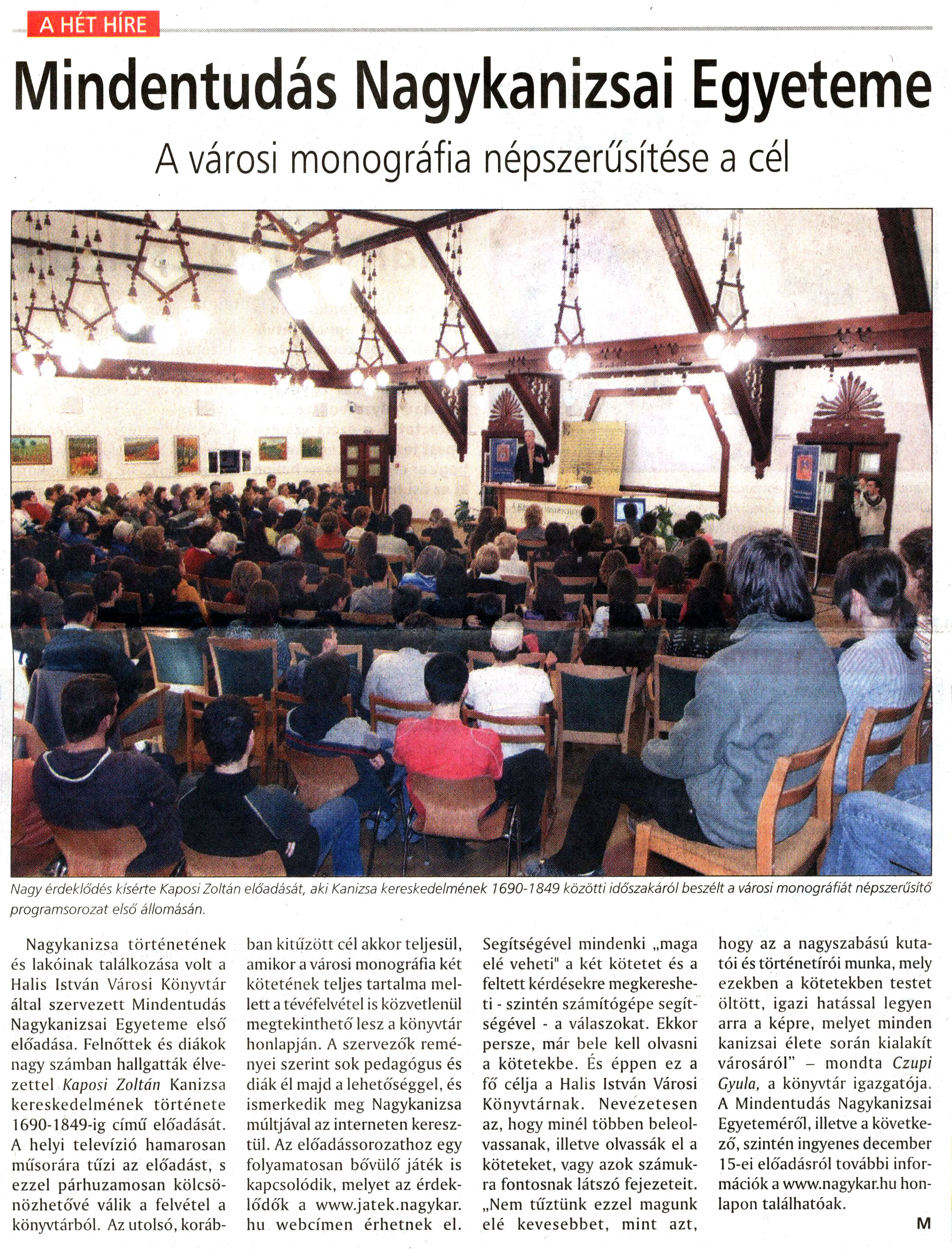 Nyilvános 2883 | 5275 | Nagykanizsai Maraton 2008. november 20. 46. szám 1. oldal - Mindentudás Nagykanizsai Egyeteme | A cikk szövege: A HÉT HÍRE Mindentudás Nagykanizsai Egyeteme A városi monográfia népszerűsítése a cél Nagy érdeklődés kísérte Kaposi Zoltán előadását, aki Kanizsa kereskedelmének 1690-1849 közötti időszakáról beszélt a városi monográfiát népszerűsítő programsorozat első állomásán. Nagykanizsa történetének és lakóinak találkozása volt a Halis István Városi Könyvtár által szervezett Mindentudás Nagykanizsai Egyeteme első előadása. Felnőttek és diákok nagy számban hallgatták élvezettel Kaposi Zoltán Kanizsa kereskedelmének története 1690-1849-ig című előadását. A helyi televízió hamarosan műsorára tűzi az előadást, s ezzel párhuzamosan kölcsö-nözhetővé válik a felvétel a könyvtárból. Az utolsó, koráb- ban kitűzött cél akkor teljesül, amikor a városi monográfia két kötetének teljes tartalma mellett a tévéfelvétel is közvetlenül megtekinthető lesz a könyvtár honlapján. A szervezők reményei szerint sok pedagógus és diák él majd a lehetőséggel, és ismerkedik meg Nagykanizsa múltjával az interneten keresztül. Az előadássorozathoz egy folyamatosan bővülő játék is kapcsolódik, melyet az érdeklődők a www.jatek.nagykar, hu webcímen érhetnek el. Segítségével mindenki „maga elé veheti" a két kötetet és a feltett kérdésekre megkeresheti - szintén számítógépe segítségével - a válaszokat. Ekkor persze, már bele kell olvasni a kötetekbe. És éppen ez a fő célja a Halis István Városi Könyvtárnak. Nevezetesen az, hogy minél többen beleolvassanak, illetve olvassák el a köteteket, vagy azok számukra fontosnak látszó fejezeteit. „Nem tűztünk ezzel magunk elé kevesebbet, mint azt, hogy az a nagyszabású kutatói és történetírói munka, mely ezekben a kötetekben testet öltött, igazi hatással legyen arra a képre, melyet minden kanizsai élete során kialakít városáról" - mondta Czupi Gyula, a könyvtár igazgatója. A Mindentudás Nagykanizsai Egyeteméről, illetve a következő, szintén ingyenes december 15-ei előadásról további információk a www.nagykar.hu honlapon találhatóak. M |