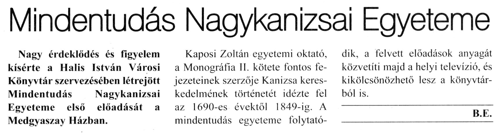 Nyilvános 2827 | 5298 | Kanizsa 2008. november 20. 39. szám 2. oldal - Mindentudás Nagykanizsai Egyeteme | A cikk szövege: Mindentudás Nagykanizsai Egyeteme Nagy érdeklődés és figyelem kísérte a Halis István Városi Könyvtár szervezésében létrejött Mindentudás Nagykanizsai Egyeteme első előadását a Medgyaszay Házban. Kaposi Zoltán egyetemi oktató, a Monográfia II. kötete fontos fejezeteinek szerzője Kanizsa kereskedelmének történetét idézte fel az 1690-es évektől 1849-ig. A mindentudás egyeteme folytató- dik, a felvett előadások anyagát közvetíti majd a helyi televízió, és kikölcsönözhető lesz a könyvtárból is. B.E. |
