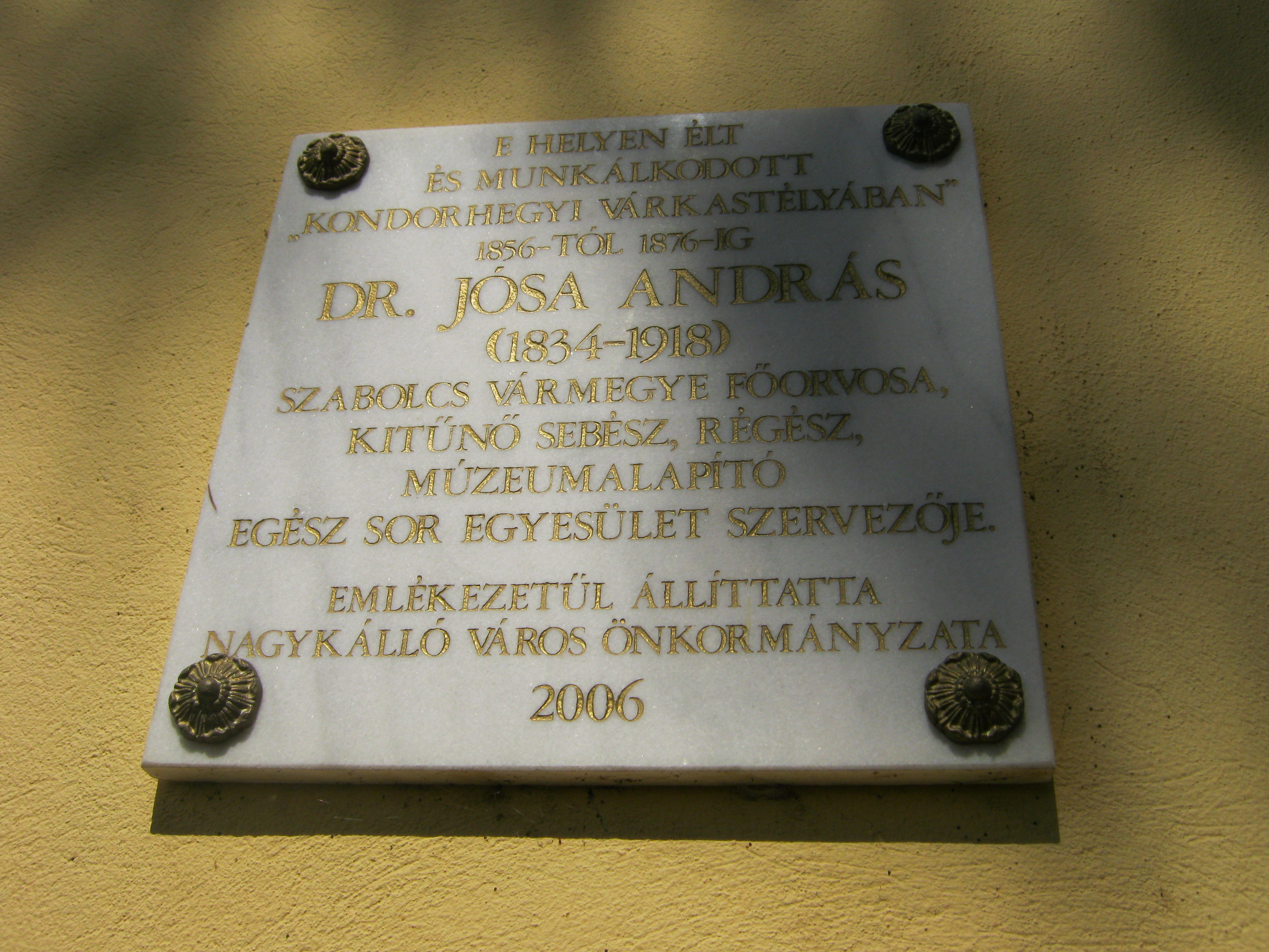 Nyilvános 1371 | 1708 | Nagykálló, Somogyi B. út 5-7. | Ma a Polgármesteri Hivatal működik itt, ahol egykor dr. Jósa András orvos, múzeumlapító élt. Jósa fiatal orvosként az 1860-as évek közepén telepedett le Nagykállóban, ahol Korányi Frigyes örökébe lépett. Nagykállóhoz erős családi kötelékek is fűzték: egyik őse kállói várkapitány volt, apai nagyapja pedig a vármegye első főorvosa. Dr. Jósa két évtizedet töltött itt legendássá váló gyakorló orvosként. Itt alapított családot: hat leánya született, akiket "orgonasípok"-nak nevezett :). Házasságkötése után vásárolta meg ezt az azóta átépített kúriát, amelyet - Nagykálló e részének neve után - tréfásan kondorhegyi várkastélyaként emlegetett. Rendkívül széles egyéniségű és sokoldalú ember volt. Hogy kórházának pénzt szerezzen, felvirágoztatta a településen a műkedvelő színjátszást. Mellette fúrt-faragott, később beletanult a régészeti kutatásokba. Amikor a vármegye székhelyét Nyíregyházára tették át, ő is odaköltözött (lásd: Nyíregyháza, Malom utca 3.). Felh. irod.: Harsányi Gézáné: Kálló kincsei. Nagykálló, 2007 Harsányi Gézáné: Nagykálló porában. Dr. Jósa András nyomában. = A nyíregyházi Jósa András Múzeum évkönyve 2008 |