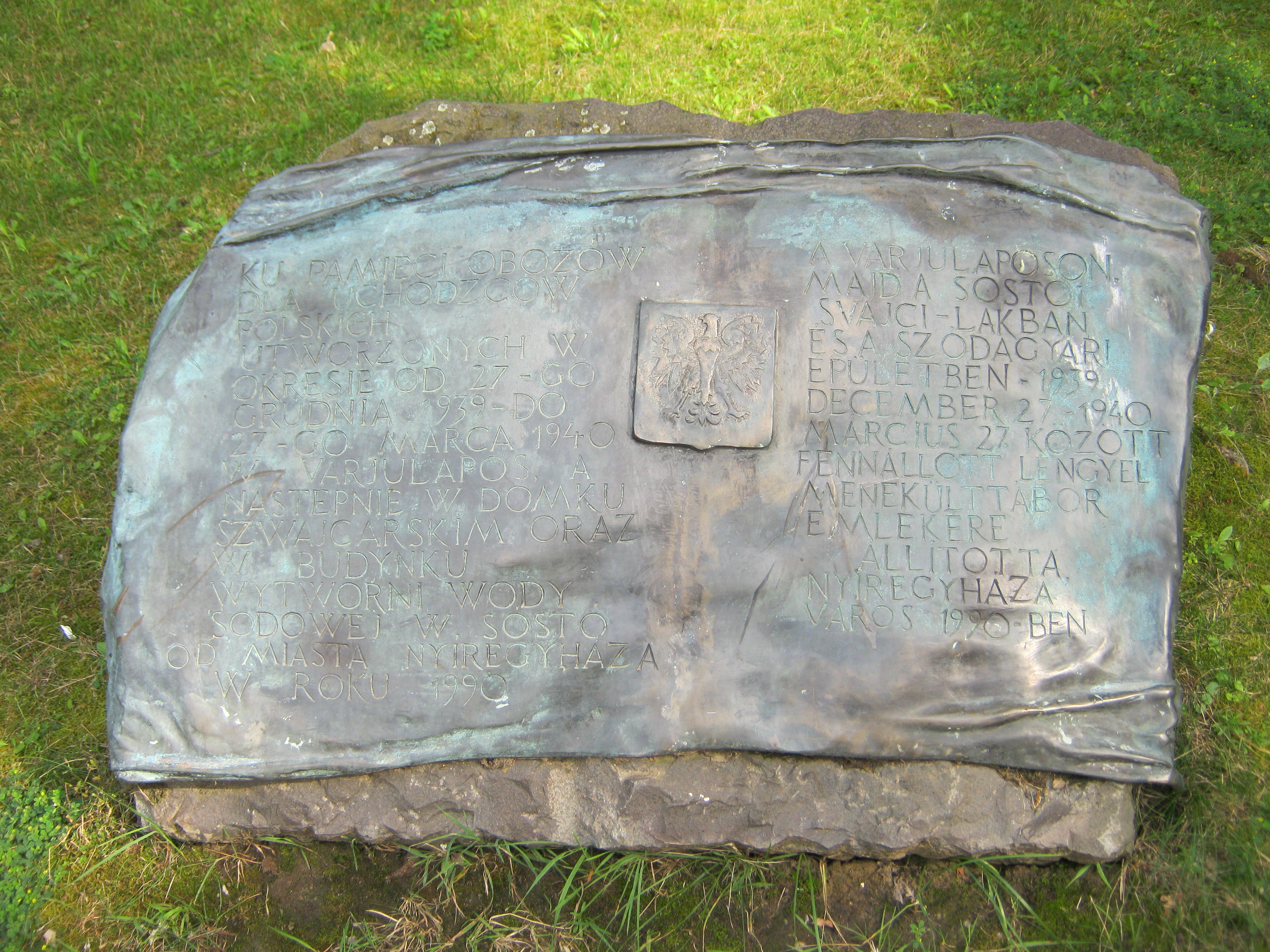 Nyilvános 799 | 1154 | Nyíregyháza-Sóstó, Svájci lak | A Svájci lak előtt kétnyelvű emlékkő idézi azt az időszakot, amikor a szálloda és a környező épületek 1939/40-ben lengyel menekülttábornak adtak helyet. A fénykép 2010 augusztus elején készült |