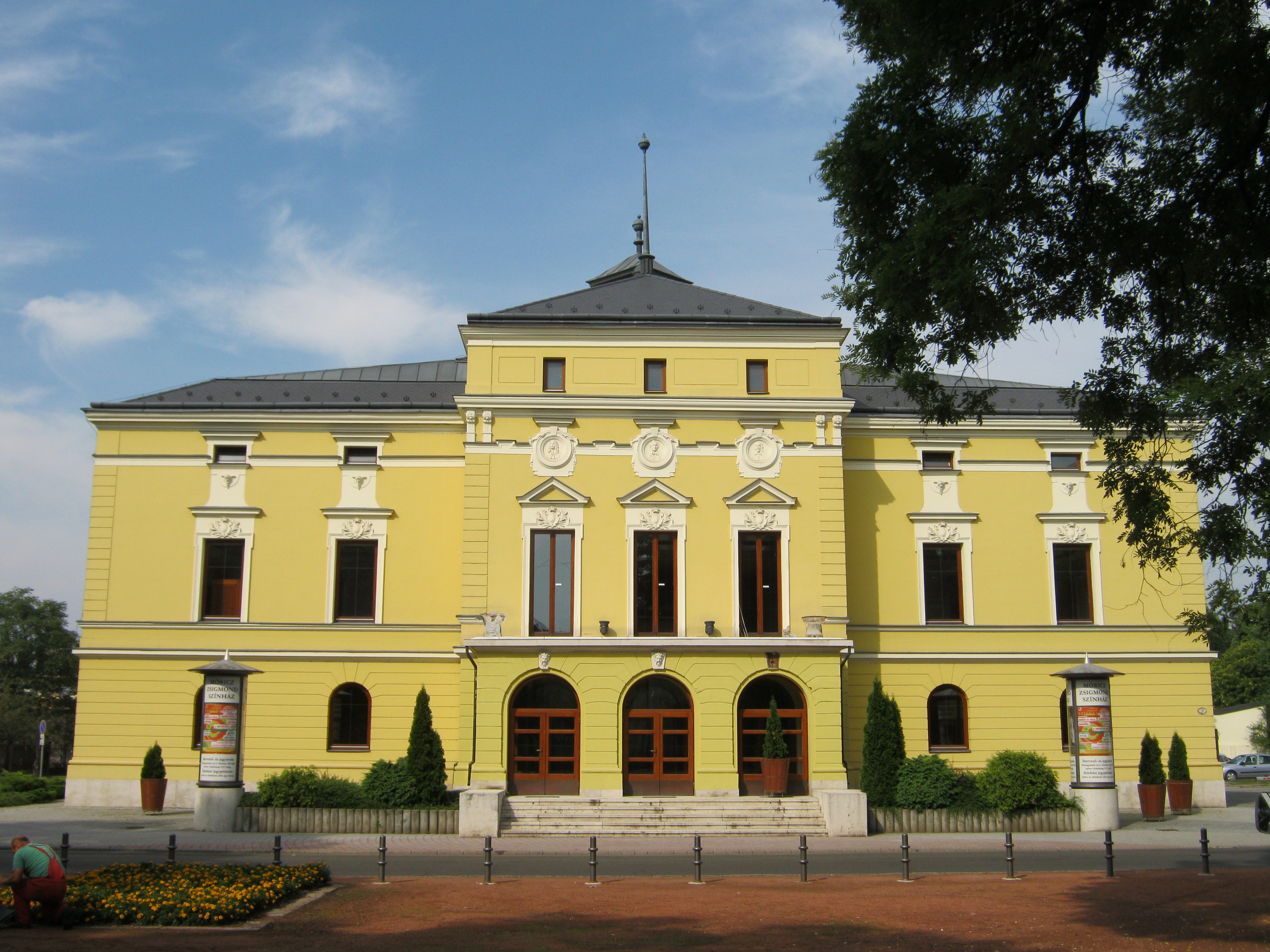 Nyilvános 1019 | 1430 | Nyíregyháza, Bessenyei tér 13. | Nyíregyháza első állandó kőszínháza 1894-ben épült Alpár Ignác tervei szerint eklektikus stílusban. 1955-ben teljesen felújították, csak a színpadi nyílás körüli négy fal maradt meg a régiekből, az épület minden irányban kitágult. Saját társulattal 1981 óta rendelkezik. Felh. irod.: Látnivalók Szabolcs-Szatmár-Bereg megyében. Miskolc. Well-PRess, 1999 www.moriczszinhaz.hu A fénykép 2010 augusztus elején készült. |