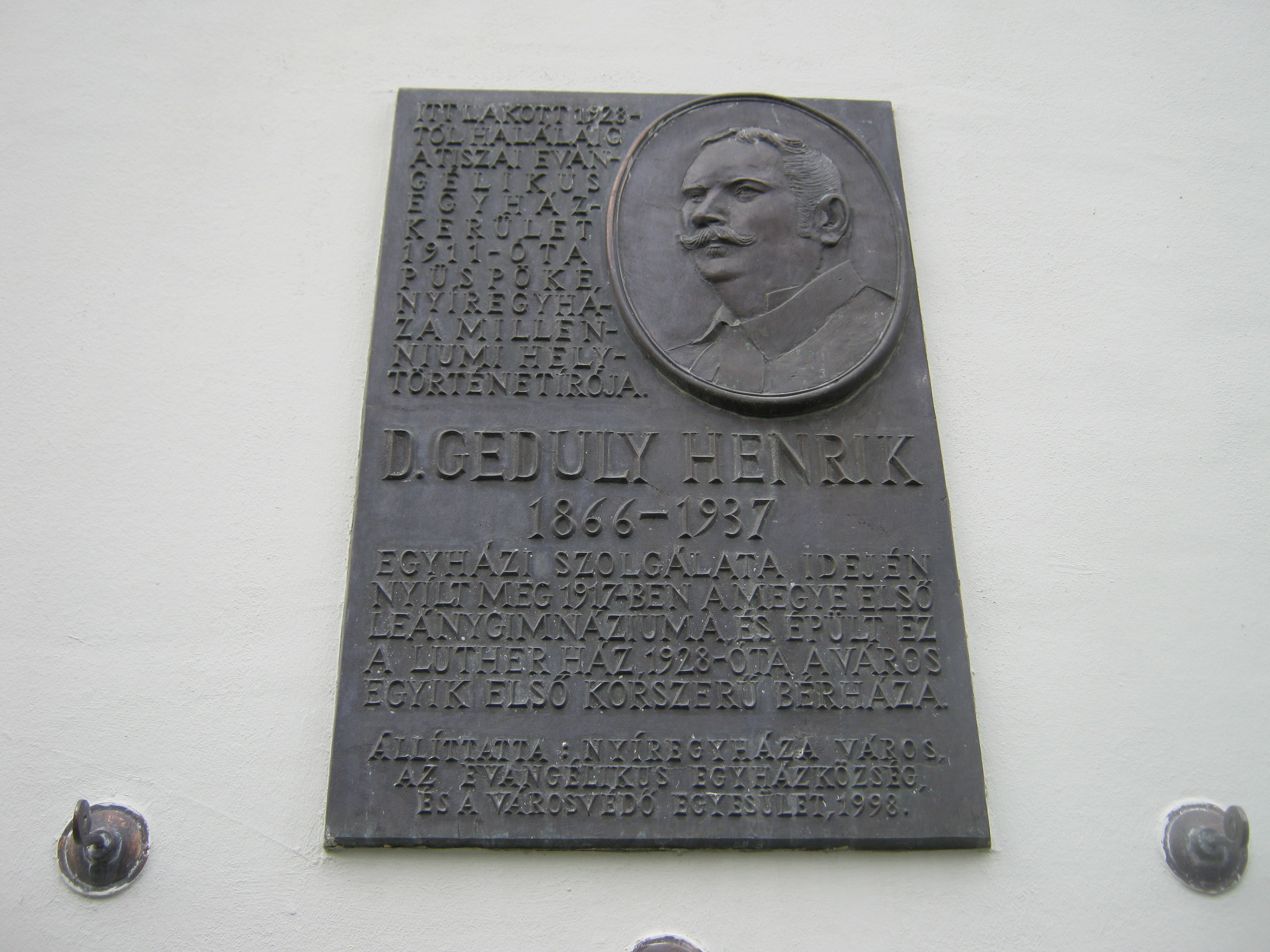 Nyilvános 1360 | 1918 | Nyíregyháza, Luther utca 5. | Az épület egy másik táblája Geduly Henrik emlékét örökíti meg. A Tiszai Evangélikus Egyházkerület püspöke itt lakott, az általa 1928-ban építtetett házban. Ez volt Nyíregyháza első korszerű bérháza. Geduly egyházi működése mellett 1896-ban megírta a "Nyíregyháza az ezredik évben" című városmonográfiát. Ő alapította a leánygimnáziumot és tevékenyen részt vett a város kulturális és társadalmi életében. Sírja az Északi temetőben (lásd: Pazonyi tér 5.) található. Felh. irod.: http://www.lutheran.hu/z/ujsagok/evelet/archivum/2007/07/103 A fénykép 2010 augusztus elején készült. |