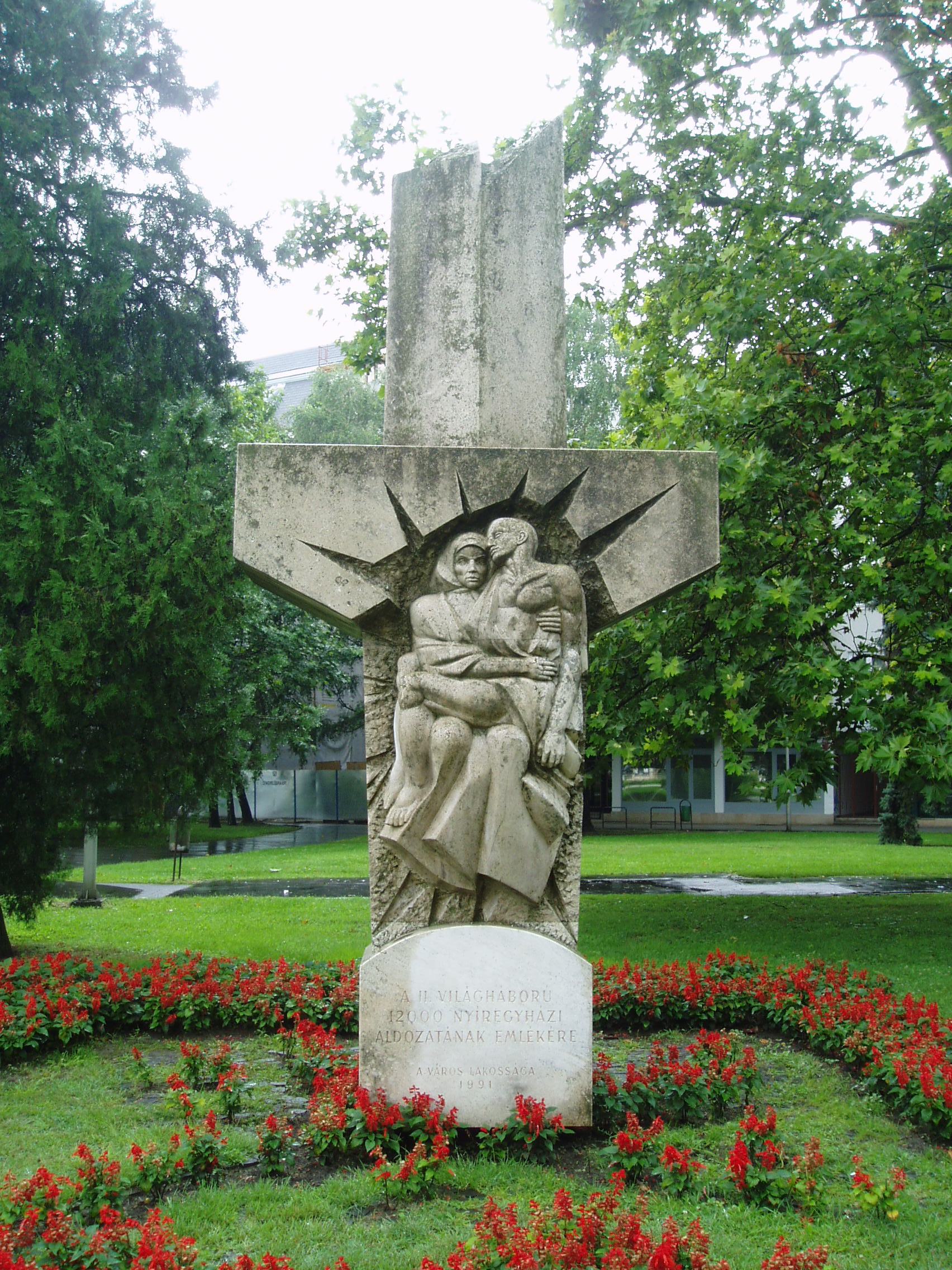 Nyilvános 1047 | 1910 | Nyíregyháza, Országzászló tér: A II. világháború nyíregyházi áldozatai | A szépen kialakított parkban 1991-ben helyezték el a második világháború nyíregyházi áldozatainak kőből faragott, kereszt alakú emlékművét. Gyurcsek Ferenc alkotását Antall József miniszterelnök avatta fel. Felh. irod.: www.szoborlap.hu A fénykép 2010 augusztus elején készült. |
