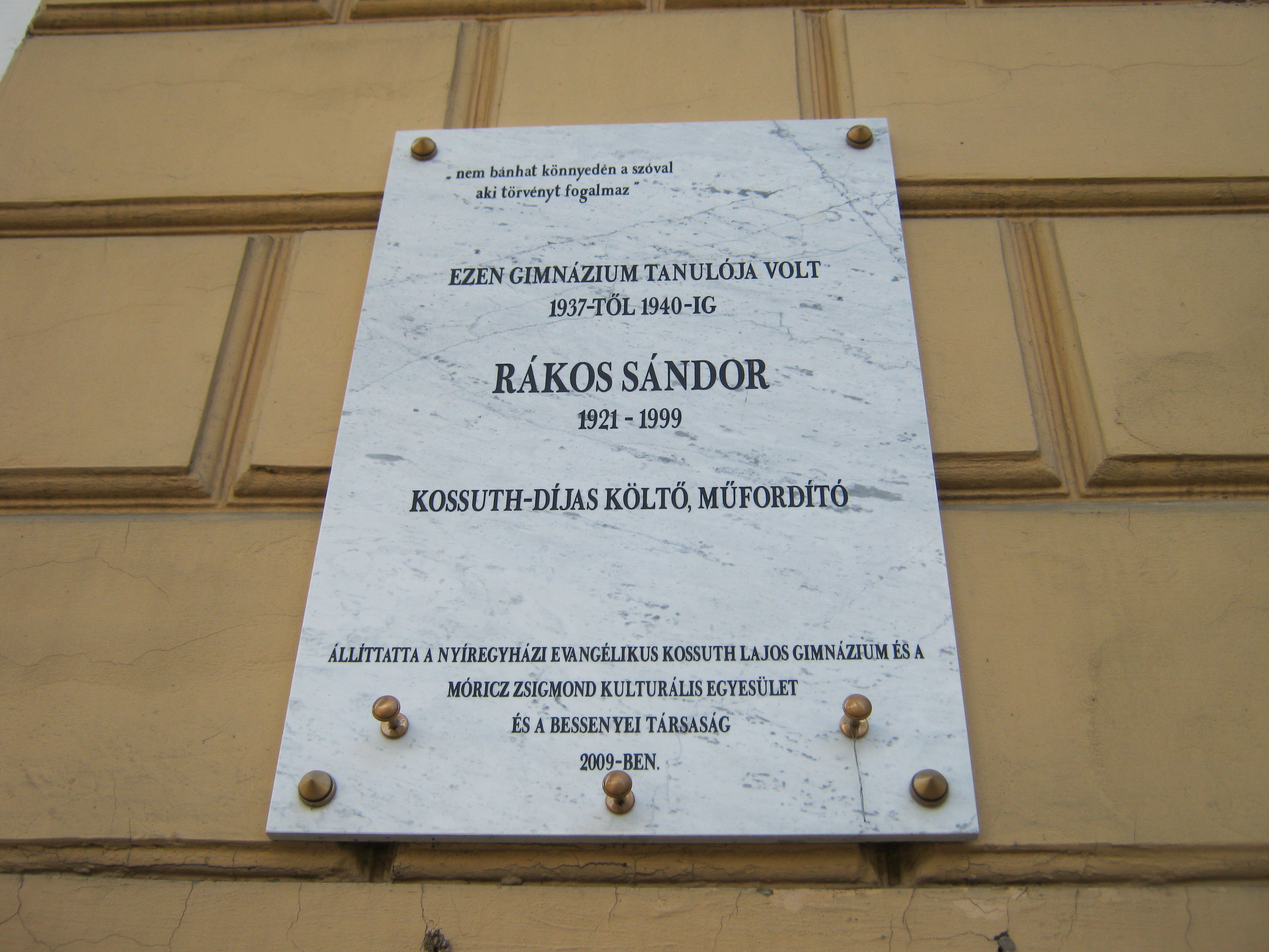 Nyilvános 1336 | 1690 | Nyíregyháza, Szent István utca 19. Evangélikus Kossuth Lajos Gimnázium | A megye legrégibb középiskolája. 1808-ban alapították mint evangélikus professzori iskolát (lásd: Nyíregyháza, Luther utca 5.). Nyolc osztályos gimnáziummá 1888-ra fejlesztették fel. Mai épületét ekkoriban, 1887-ben emelték Bobula János tervei szerint. Kossuth Lajos nevét 1921-ben vette fel. Az 1948-ban államosított iskolát 1992-ben kapta vissza az evangélikus egyház. Homlokzatán számos márványtábla emlékezik kiváló diákjaira, tanáraira. Krúdy emléktáblája mellett Rákos Sándor költőé látható. A közelben született (lásd: Kálmánháza, Kossuth utca 53.) Kossuth-díjas költő, műfordító 1937 és 1940 között volt a gimnázium tanulója. Felh. irod.: www.eklg.hu A fénykép 2010 augusztus elején készült |