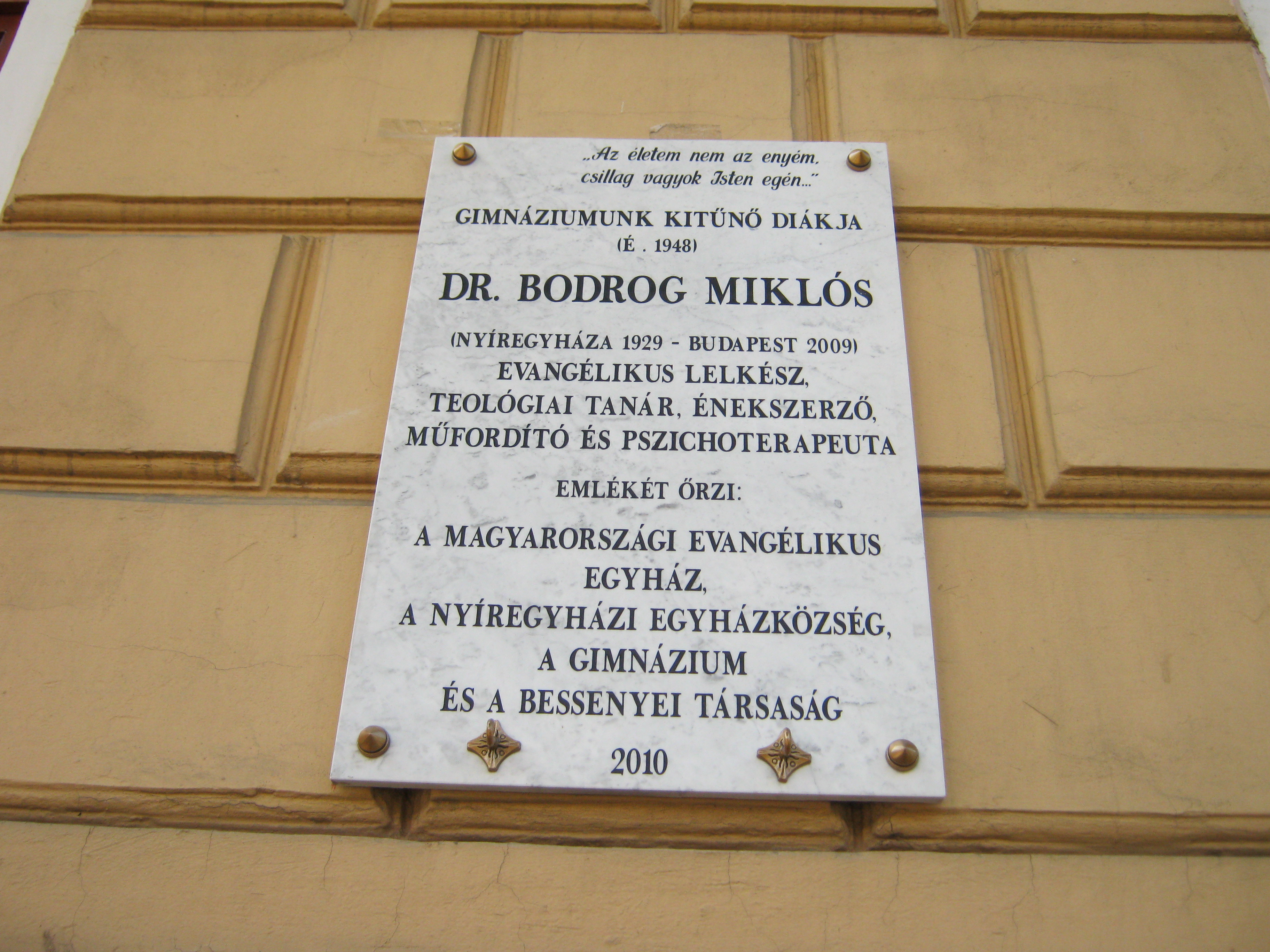 Nyilvános 1350 | 1705 | Nyíregyháza, Szent István utca 19. Evangélikus Kossuth Lajos Gimnázium | A megye legrégibb középiskolája. 1808-ban alapították mint evangélikus professzori iskolát (lásd: Nyíregyháza, Luther utca 5.). Nyolc osztályos gimnáziummá 1888-ra fejlesztették fel. Mai épületét ekkoriban, 1887-ben emelték Bobula János tervei szerint. Kossuth Lajos nevét 1921-ben vette fel. Az 1948-ban államosított iskolát 1992-ben kapta vissza az evangélikus egyház. Homlokzatán számos márványtábla emlékezik kiváló diákjaira, tanáraira. Itt végezte tanulmányait Bodrog Miklós evangélikus lelkész, teológiai tanár, énekszerző és pszichoterapeuta itt érettségizett 1948-ban. Felh. irod.: www.eklg.hu A fénykép 2010 augusztus elején készült |
