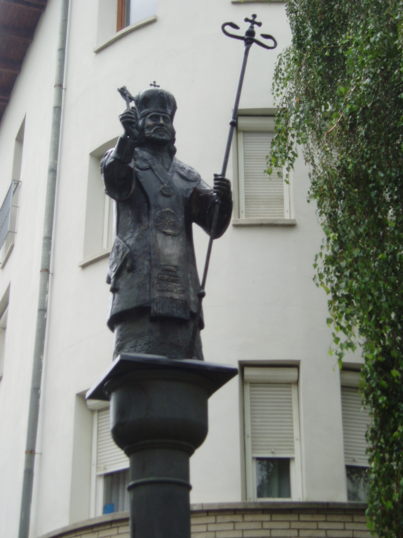 Nyilvános 1050 | 2151 | Nyíregyháza, Szent Miklós tér: Szent Miklós szobra | A város központjában levő, de csöndes és hangulatos kis téren 1996-ban állították fel a kiváló nyíregyházi szobrászművész, Tóth Sándor Szent Miklóst megjelenítő szobrát. A fénykép 2010 augusztus elején készült |