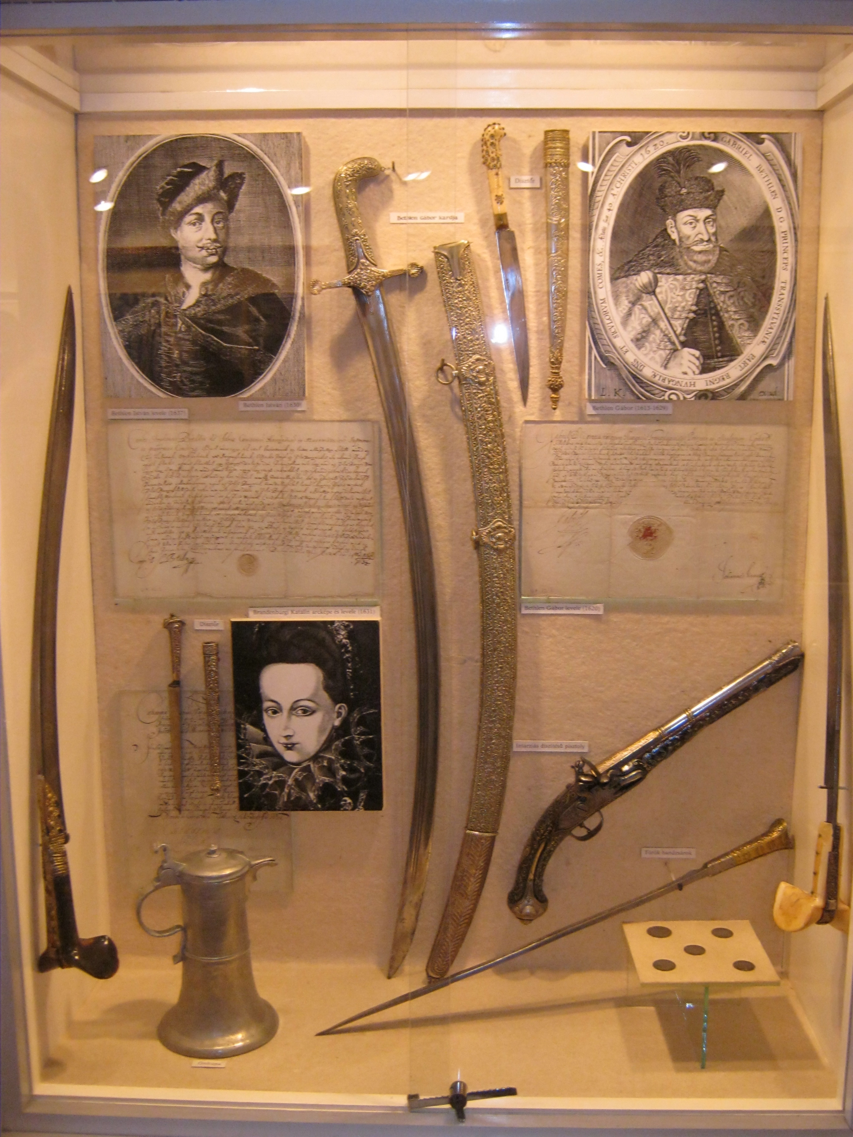 Nyilvános 994 | 1354 | Nyírbátor, Károlyi utca 21. Báthori István Múzeum | A minorita kolostor épültét 1959-ben kapta meg a múzeum. Első igazgatója, Szalontai Barnabás áldozatos munkája nyomán két év múlva már meg is nyílhatott benne az első kiállítás. A képen Bethlen Gábor relikviái: középen kardja, jobbra egy 1620-ból származó levele, balra pedig második felesége, Brandenburgi Katalin 1631-ben írott levele, alatta arcképével. Felh. irod.: Látnivalók Szabolcs-Szatmár-Bereg megyében. Miskolc, Well-PRess, 1999 www.nyirbim.hu |