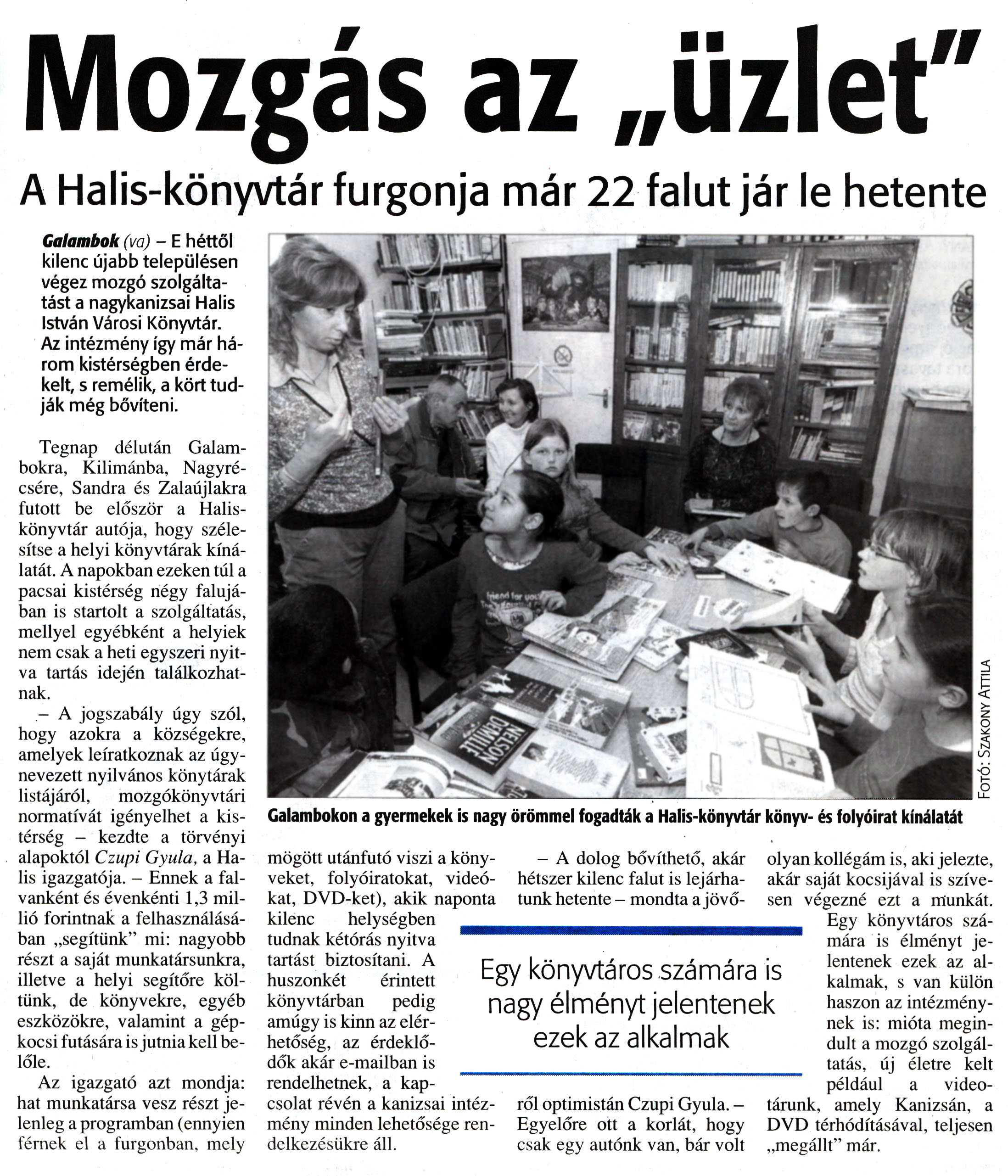 Nyilvános 7365 | 14831 | Zalai Hírlap 2008. március 14. 4. oldal - Mozgás az üzlet | Mozgás az „üzlet" A Halis-könyvtár furgonja már 22 falut jár le hetente Galambok (va) - E héttől kilenc újabb településen végez mozgó szolgáltatást a nagykanizsai Halis István Városi Könyvtár. Az intézmény így már három kistérségben érdekelt, s remélik, a kört tudják még bővíteni. Tegnap délután Galambokra, Kilimánba, Nagyrécsére, Sandra és Zalaújlakra futott be először a Halis-könyvtár autója, hogy szélesítse a helyi könyvtárak kínálatát. A napokban ezeken túl a pacsai kistérség négy falujában is startolt a szolgáltatás, mellyel egyébként a helyiek nem csak a heti egyszeri nyitva tartás idején találkozhatnak. - A jogszabály úgy szól, hogy azokra a községekre, amelyek leiratkoznak az úgynevezett nyilvános könytárak listájáról, mozgókönyvtári normatívát igényelhet a kistérség — kezdte a törvényi alapoktól Czupi Gyula, a Halis igazgatója. - Ennek a falvanként és évenkénti 1,3 millió forintnak a felhasználásában „segítünk" mi: nagyobb részt a saját munkatársunkra, illetve a helyi segítőre költünk, de könyvekre, egyéb eszközökre, valamint a gépkocsi futására is jutnia kell belőle. Az igazgató azt mondja: hat munkatársa vesz részt jelenleg a programban (ennyien férnek el a furgonban, mely mögött utánfutó viszi a könyveket, folyóiratokat, videókat, DVD-ket), akik naponta kilenc helységben tudnak kétórás nyitva tartást biztosítani. A huszonkét érintett könyvtárban pedig amúgy is kinn az elérhetőség, az érdeklődők akár e-mailban is rendelhetnek, a kapcsolat révén a kanizsai intézmény minden lehetősége rendelkezésükre áll. - A dolog bővíthető, akár hétszer kilenc falut is lejárhatunk hetente - mondta a jövőről optimistán Czupi Gyula. - Egyelőre ott a korlát, hogy csak egy autónk van, bár volt olyan kollégám is, aki jelezte, akár saját kocsijával is szívesen végezné ezt a munkát. Egy könyvtáros számára is élményt jelentenek ezek az alkalmak, s van külön haszon az intézménynek is: mióta megindult a mozgó szolgáltatás, új életre kelt például a video-tárunk, amely Kanizsán, a DVD térhódításával, teljesen „megállt" már. |