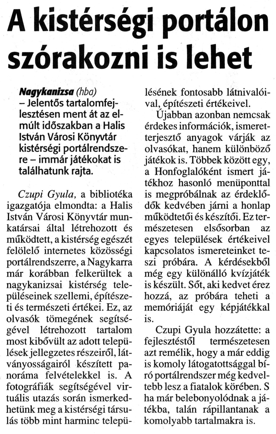 Nyilvános 1495 | 1915 | Zalai Hírlap 2009. február 3. 28. szám 12. oldal | A kistérségi portálon szórakozni is lehet A cikk szövege: A kistérségi portálon szórakozni is lehet Nagykanizsa (hba) - Jelentős tartalomfejlesztésen ment át az elmúlt időszakban a Halis István Városi Könyvtár kistérségi portálrendszere - immár játékokat is találhatunk rajta. Czupi Gyula, a bibliotéka igazgatója elmondta: a Halis István Városi Könyvtár munkatársai által létrehozott és működtett, a kistérség egészét felölelő internetes közösségi portálrendszerre, a Nagykarra már korábban felkerültek a nagykanizsai kistérség településeinek szellemi, építészeti és természeti értékei. Ez, az olvasók tömegének segítségével létrehozott tartalom most kibővült az adott településekjellegzetes részeiről, látványosságairól készített panoráma felvételekkel is. A fotográfiák segítségével virtuális utazás során ismerkedhetünk meg a kistérségi társulás több mint harminc településének fontosabb látnivalóival, építészeti értékeivel. Ujabban azonban nemcsak érdekes információk, ismeretterjesztő anyagok várják az olvasókat, hanem különböző játékok is. Többek között egy, a Honfoglalóként ismert játékhoz hasonló menüponttal is megpróbálnak az érdeklődők kedvében járni a honlap működtetői és készítői. Ez természetesen elsősorban az egyes települések értékeivel kapcsolatos ismereteinket teszi próbára. A kérdésekből még egy különálló kvízjáték is készült. Sőt, aki kedvet érez hozzá, az próbára teheti a memóriáját egy képjátékkal is. Czupi Gyula hozzátette: a fejlesztéstől természetesen azt remélik, hogy a már eddig is komoly látogatottsággal bíró portálrendszer még kedveltebb lesz a fiatalok körében. S ha már belebonyolódnak a játékba, talán rápillantanak a komolyabb tartalmakra is. |