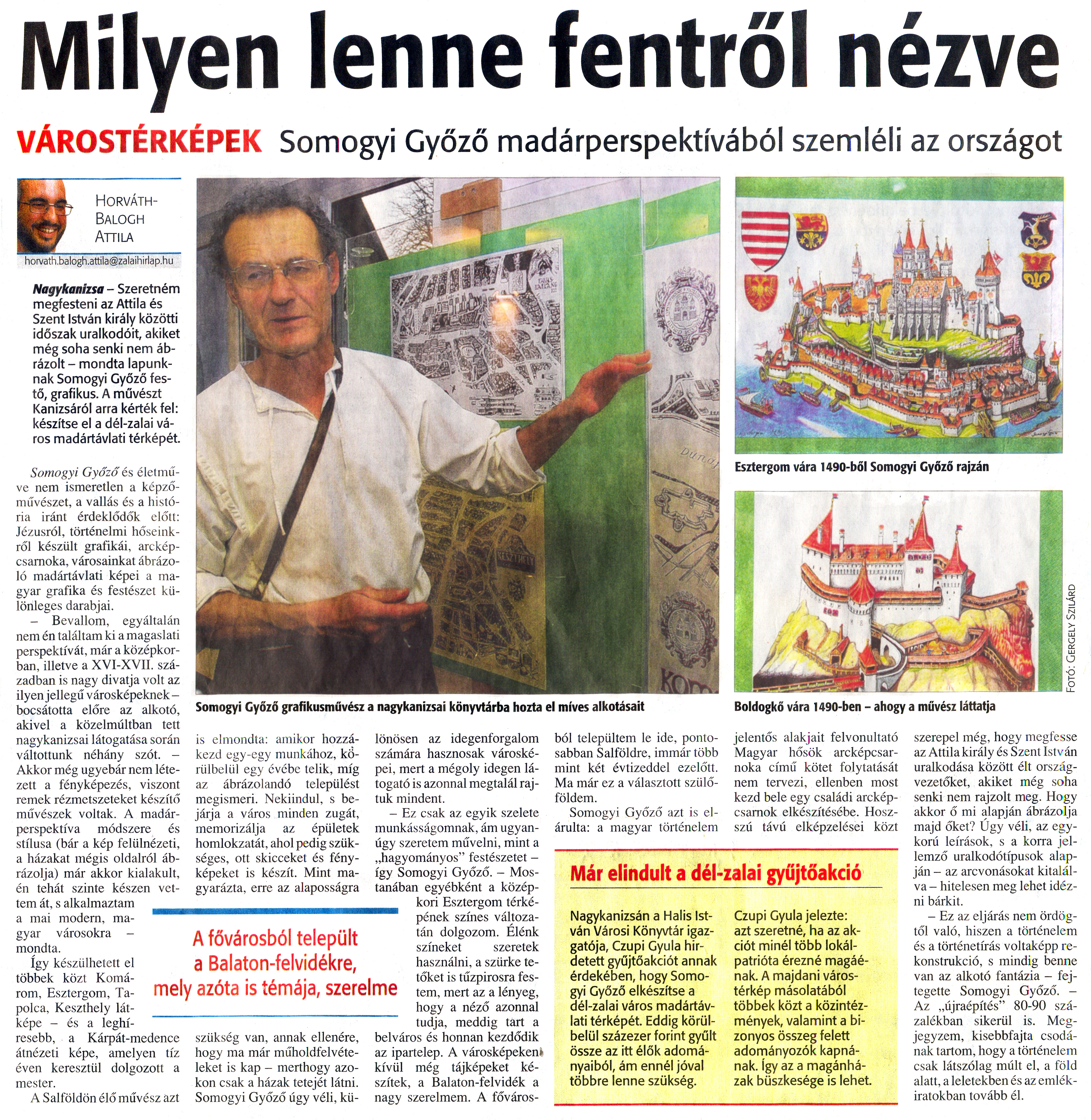 Nyilvános 1542 | 2235 | Zalai Hírlap 2010. január 4. 2. szám 7. oldal - Milyen lenne fentről nézve | A cikk szövege: Milyen lenne fentről nézve VÁROSTÉRKÉPEK Somogyi Győző madárperspektívából szemléli az országot A fővárosból települt a Balaton-felvidékre, mely azóta is témája, szerelme Horváth- Balogh Attila Nagykanizsa - Szeretném megfesteni az Attila és Szent István király közötti időszak uralkodóit, akiket még soha senki nem ábrázolt - mondta lapunknak Somogyi Győző festő, grafikus. A művészt Kanizsáról arra kérték fel: készítse el a dél-zalai város madártávlati térképét. Somogyi Győző és életműve nem ismeretlen a képzőművészet, a vallás és a história iránt érdeklődők előtt: Jézusról, történelmi hőseinkről készült grafikái, arcképcsarnoka, városainkat ábrázoló madártávlati képei a magyar grafika és festészet különleges darabjai. - Bevallom, egyáltalán nem én találtam ki a magaslati perspektívát, már a középkorban, illetve a XVI-XVII. században is nagy divatja volt az ilyen jellegű városképeknek -bocsátotta előre az alkotó, akivel a közelmúltban tett nagykanizsai látogatása során váltottunk néhány szót. - Akkor még ugyebár nem létezett a fényképezés, viszont remek rézmetszeteket készítő művészek voltak. A madárperspektíva módszere és stílusa (bár a kép felülnézeti, a házakat mégis oldalról ábrázolja) már akkor kialakult, én tehát szinte készen vettem át, s alkalmaztam a mai modern, magyar városokra - mondta. Így készülhetett el többek közt Komárom, Esztergom, Tapolca, Keszthely látképe - és a leghíresebb, a Kárpát-medence átnézeti képe, amelyen tíz éven keresztül dolgozott a mester. A Salföldön élő művész azt is elmondta: amikor hozzákezd egy-egy munkához, körülbelül egy évébe telik, míg az ábrázolandó települést megismeri. Nekiindul, s bejárja a város minden zugát, memorizálja az épületek homlokzatát, ahol pedig szükséges, ott skicceket és fényképeket is készít. Mint magyarázta, erre az alaposságra szükség van, annak ellenére, hogy ma már műholdfelvételeket is kap - merthogy azokon csak a házak tetejét látni. Somogyi Győző úgy véli, különösen az idegenforgalom számára hasznosak városképei, mert a mégoly idegen látogató is azonnal megtalál rajtuk mindent. - Ez csak az egyik szelete munkásságomnak, ám ugyanúgy szeretem művelni, mint a „hagyományos" festészetet -így Somogyi Győző. - Mostanában egyébként a középkori Esztergom térképének színes változatán dolgozom. Élénk színeket szeretek használni, a szürke tetőket is tűzpirosra festem, mert az a lényeg, hogy a néző azonnal tudja, meddig tárt a belváros és honnan kezdődik az ipartelep. A városképeken kívül még tájképeket készítek, a Balaton-felvidék a nagy szerelmem. A fővárosból települtem le ide, pontosabban Salföldre, immár több mint két évtizeddel ezelőtt. Ma már ez a választott szülőföldem. Somogyi Győző azt is elárulta: a magyar történelem jelentős alakjait felvonultató Magyar hősök arcképcsarnoka című kötet folytatását nem tervezi, ellenben most kezd bele egy családi arcképcsarnok elkészítésébe. Hosszú távú elképzelései közt szerepel még, hogy megfesse az Attila király és Szent István uralkodása között élt országvezetőket, akiket még soha senki nem rajzolt meg. Hogy akkor ő mi alapján ábrázolja majd őket? Úgy véli, az egykorú leírások, s a korra jellemző uralkodótípusok alapján - az arcvonásokat kitalálva - hitelesen meg lehet idézni bárkit. - Ez az eljárás nem ördögtől való, hiszen a történelem és a történetírás voltaképp rekonstrukció, s mindig benne van az alkotó fantázia - fejtegette Somogyi Győző. -Az „újraépítés" 80-90 százalékban sikerül is. Megjegyzem, kisebbfajta csodának tartom, hogy a történelem csak látszólag múlt el, a föld alatt, a leletekben és az emlékiratokban tovább él. Somogyi Győző grafikusművész a nagykanizsai könyvtárba hozta el míves alkotásait Esztergom vára 1490-ből Somogyi Győző rajzán Boldogkő vára 1490-ben - ahogy a művész láttatja Már elindult a dél-zalai gyűjtőakció Nagykanizsán a Halis István Városi Könyvtár igazgatója, Czupi Gyula hirdetett gyűjtőakciót annak érdekében, hogy Somogyi Győző elkészítse a dél-zalai város madártávlati térképét. Eddig körülbelül százezer forint gyűlt össze az itt élők adományaiból, ám ennél jóval többre lenne szükség. Czupi Gyula jelezte: azt szeretné, ha az akciót minél több lokálpatrióta érezné magáénak. A majdani várostérkép másolatából többek közt a közintézmények, valamint a bizonyos összeg felett adományozók kapnának, így az a magánházak büszkesége is lehet. |