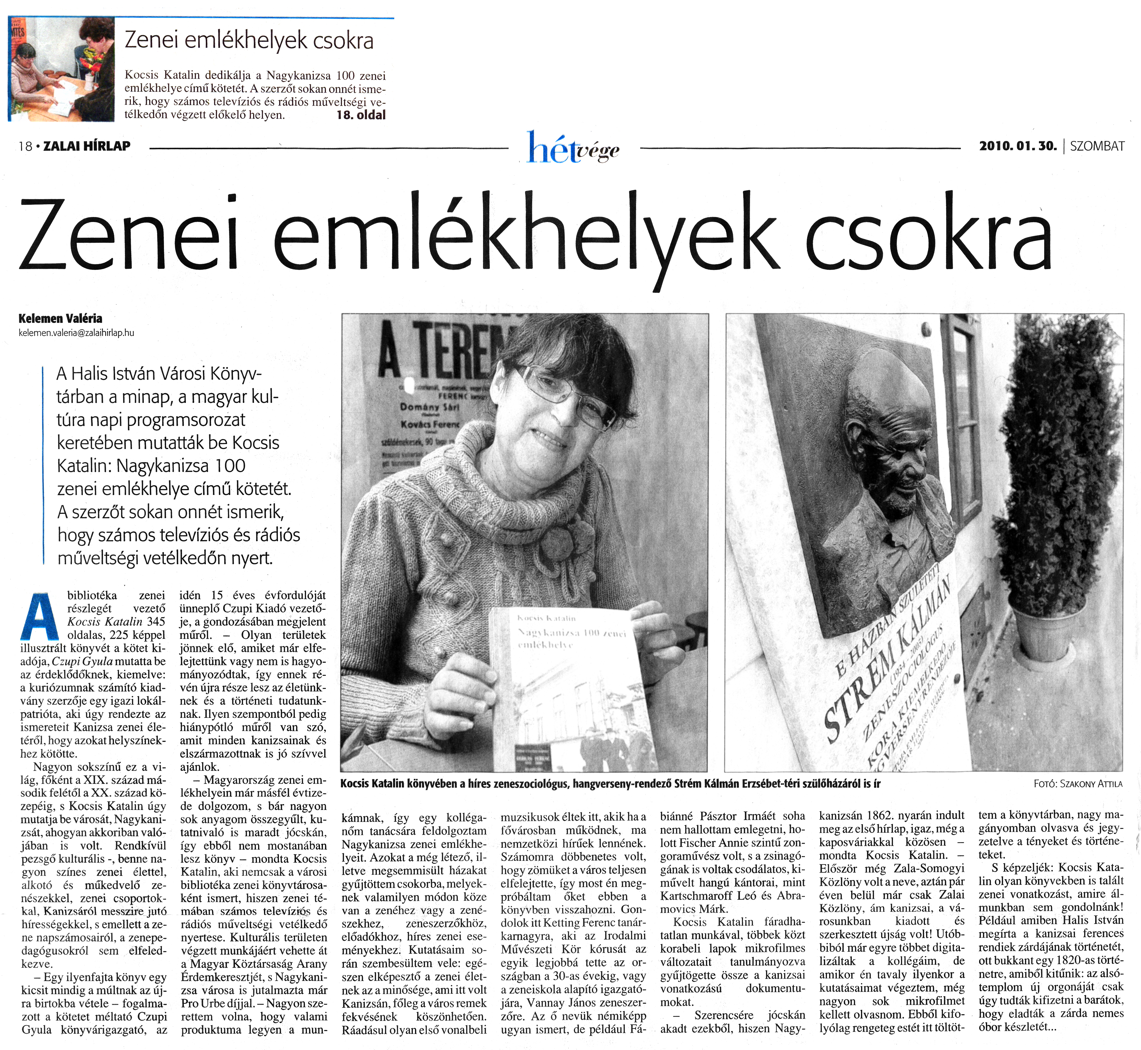 Nyilvános 1831 | 3243 | Zalai Hírlap 2010. január 30. 25. szám 18. oldal - Zenei emlékhelyek csokra | A cikk szövege: 18 • ZALAI HÍRLAP hét vége 2010.01.30. SZOMBAT Zenei emlékhelyek csokra Kelemen Valéria kelemen.valeria@zalaihirlap.hu A Halis István Városi Könyvtárban a minap, a magyar kultúra napi programsorozat keretében mutatták be Kocsis Katalin: Nagykanizsa 100 zenei emlékhelye című kötetét A szerzőt sokan onnét ismerik, hogy számos televíziós és rádiós műveltségi vetélkedőn nyert. A bibliotéka zenei részlegét vezető Kocsis Katalin 345 oldalas, 225 képpel illusztrált könyvét a kötet kiadója, Czupi Gyula mutatta be az érdeklődőknek, kiemelve: a kuriózumnak számító kiadvány szerzője egy igazi lokálpatrióta, aki úgy rendezte az ismereteit Kanizsa zenei életéről, hogy azokat helyszínekhez kötötte. Nagyon sokszínű ez a világ, főként a XIX. század második felétől a XX. század közepéig, s Kocsis Katalin űgy mutatja be városát, Nagykanizsát, ahogyan akkoriban valójában is volt. Rendkívül pezsgő kulturális benne nagyon színes zenei élettel, alkotó és műkedvelő zenészekkel, zenei csoportokkal, Kanizsáról messzirejiitó hírességekkel, s emellett a zene napszámosairól, a zenepedagógusokról sem elfeledkezve. - Egy ilyenfajta könyv egy kicsit mindig a múltnak az újra birtokba vétele - fogalmazott a kötetet méltató Czupi Gyula könyvárigazgató, az idén 15 éves évfordulóját ünneplő Czupi Kiadó vezetője, a gondozásában megjelent műről. - Olyan területek jönnek elő, amiket már elfelejtettünk vagy nem is hagyományozódtak, így ennek révén újra része lesz az életünknek és a történeti tudatunknak. Ilyen szempontból pedig hiánypótló műről van szó, amit minden kanizsainak és elszármazottnak is jó szívvel ajánlok. - Magyarország zenei emlékhelyein már másfél évtizede dolgozom, s bár nagyon sok anyagom összegyűlt, kutatnivaló is maradt jócskán, így ebből nem mostanában lesz könyv - mondta Kocsis Katalin, aki nemcsak a városi bibliotéka zenei könyvtárosaként ismert, hiszen zenei témában számos televíziós és rádiós műveltségi vetélkedő nyertese. Kulturális területen végzett munkájáért vehette át a Magyar Köztársaság Arany Érdemkeresztjét, s Nagykanizsa városa is jutalmazta már Pro Urbe díjjal. – Nagyon szerettem volna, hogy valami produktuma legyen a munkámnak, így egy kolléganőm tanácsára feldolgoztam Nagykanizsa zenei emlékhelyeit. Azokat a még létező, illetve megsemmisült házakat gyűjtöttem csokorba, melyeknek valamilyen módon köze van a zenéhez vagy a zenészekhez, zeneszerzőkhöz, előadókhoz, híres zenei eseményekhez. Kutatásaim során szembesültem vele: egészen elképesztő a zenei életnek az a minősége, ami itt volt Kanizsán, főleg a város remek fekvésének köszönhetően. Ráadásul olyan első vonalbeli muzsikusok éltek itt, akik ha a fővárosban működnek, ma nemzetközi hírűek lennének. Számomra döbbenetes volt, hogy zömüket a város teljesen elfelejtette, így most én megpróbáltam őket ebben a könyvben visszahozni. Gondolok itt Ketting Ferenc tanárkarnagyra, aki az Irodalmi Művészeti Kör kórusát az egyik legjobbá tette az országban a 30-as évekig, vagy a zeneiskola alapító igazgatójára, Vannay János zeneszerzőre. Az ő nevük némiképp ugyan ismert, de például Fábiánné Pásztor Irmáét soha nem hallottam emlegetni, holott Fischer Annié szintű zongoraművész volt, s a zsinagógának is voltak csodálatos, kiművelt hangú kántorai, mint Kartschmaroff Leó és Abramovics Márk. Kocsis Katalin fáradhatatlan munkával, többek közt korabeli lapok mikrofilmes változatait tanulmányozva gyűjtögette össze a kanizsai vonatkozású dokumentumokat. - Szerencsére jócskán akadt ezekből, hiszen Nagykanizsán 1862. nyarán indult meg az első hírlap, igaz, még a kaposváriakkal közösen -mondta Kocsis Katalin. - Először még Zala-Somogyi Közlöny volt a neve, aztán pár éven belül már csak Zalai Közlöny, ám kanizsai, a városunkban kiadott és szerkesztett újság volt! Utóbbiból már egyre többet digitalizáltak a kollégáim, de amikor én tavaly ilyenkor a kutatásaimat végeztem, még nagyon sok mikrofilmet kellett olvasnom. Ebből kifolyólag rengeteg estét itt töltöttem a könyvtárban, nagy magányomban olvasva és jegyzetelve a tényeket és történeteket. S képzeljék: Kocsis Katalin olyan könyvekben is talált zenei vonatkozást, amire álmunkban sem gondolnánk! Például amiben Halis István megírta a kanizsai ferences rendiek zárdájának történetét, ott bukkant egy 1820-as történetre, amiből kitűnik: az alsótemplom új orgonáját csak úgy tudták kifizetni a barátok, hogy eladták a zárda nemes óborkészletét... Kocsis Katalin könyvében a híres zeneszociológus, hangverseny-rendező Strém Kálmán Erzsébet-téri szülőházáról is ír |