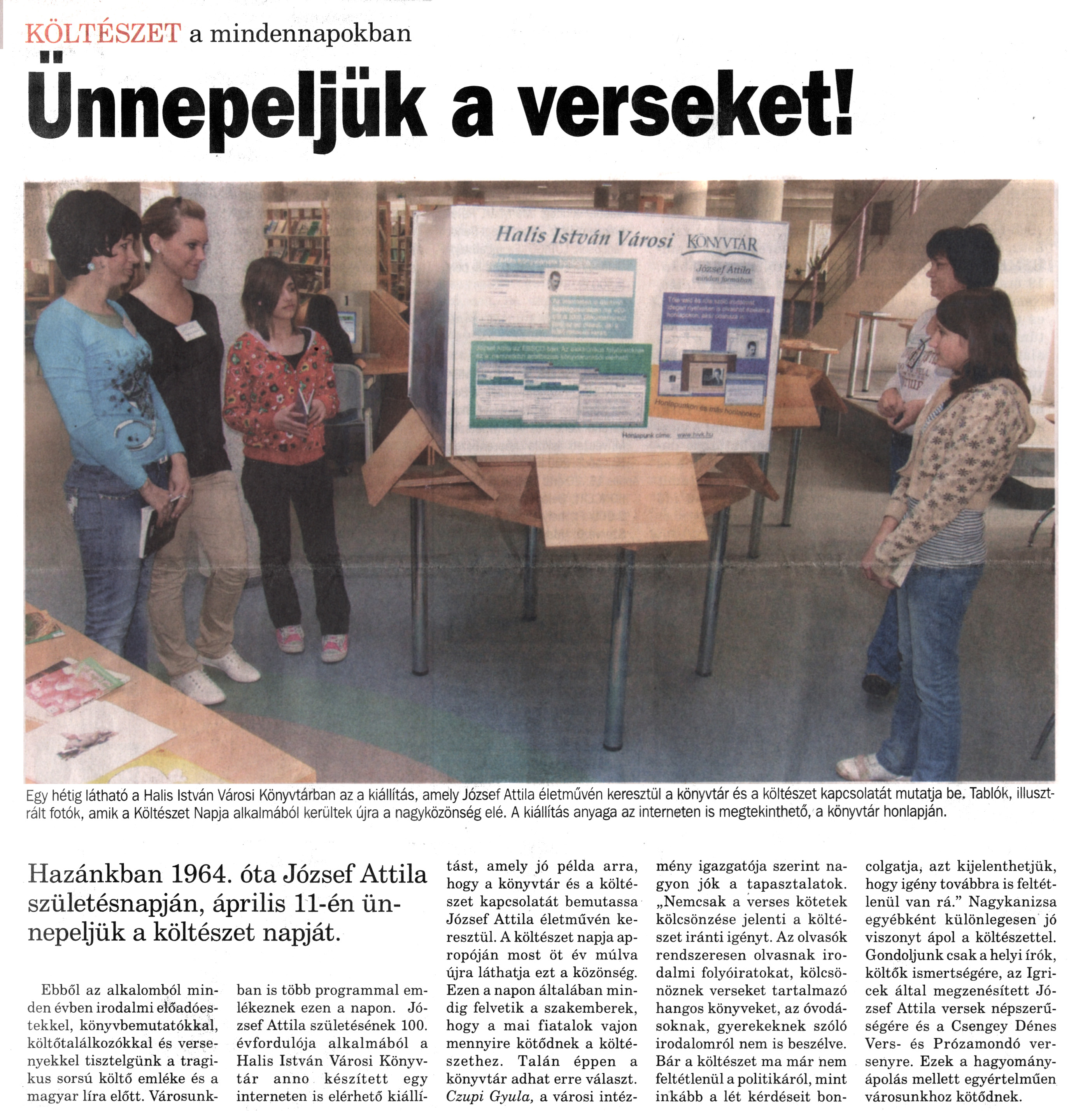 Nyilvános 1609 | 2198 | Nagykanizsai Maraton 2010. április 9. 14. szám 1. oldal - Ünnepeljük a verseket | A cikk szövege: KÖLTÉSZET a mindennapokban Ünnepeljük a verseket! Egy hétig látható a Halis István Városi Könyvtárban az a kiállítás, amely József Attila életművén keresztül a könyvtár és a költészet kapcsolatát mutatja be. Tablók, illusztrált fotók, amik a Költészet Napja alkalmából kerültek újra a nagyközönség elé. A kiállítás anyaga az interneten is megtekinthető, a könyvtár honlapján. Hazánkban 1964. óta József Attila születésnapján, április 11-én ünnepeljük a költészet napját. Ebből az alkalomból minden évben irodalmi előadóestekkel, könyvbemutatókkal, költőtalálkozókkal és versenyekkel tisztelgünk a tragikus sorsú költő emléke és a magyar líra előtt. Városunkban is több programmal emlékeznek ezen a napon. József Attila születésének 100. évfordulója alkalmából a Halis István Városi Könyvtár anno készített egy interneten is elérhető kiállítást, amely jó példa arra, hogy a könyvtár és a költészet kapcsolatát bemutassa József Attila életművén keresztül. A költészet napja apropóján most öt év múlva újra láthatja ezt a közönség. Ezen a napon általában mindig felvetik a szakemberek, hogy a mai fiatalok vajon mennyire kötődnek a költészethez. Talán éppen a könyvtár adhat erre választ. Czupi Gyula, a városi intézmény igazgatója szerint nagyon jók a tapasztalatok. „Nemcsak a verses kötetek kölcsönzése jelenti a költészet iránti igényt. Az olvasók rendszeresen olvasnak irodalmi folyóiratokat, kölcsönöznek verseket tartalmazó hangos könyveket, az óvodásoknak, gyerekeknek szóló irodalomról nem is beszélve. Bár a költészet ma már nem feltétlenül a politikáról, mint inkább a lét kérdéseit boncolgatja, azt kijelenthetjük, hogy igény továbbra is feltétlenül van rá." Nagykanizsa egyébként különlegesen jó viszonyt ápol a költészettel. Gondoljunk csak a helyi írók, költők ismertségére, az Igricek által megzenésített József Attila versek népszerűségére és a Csengey Dénes Vers- és Prózamondó versenyre. Ezek a hagyományápolás mellett egyértelműen városunkhoz kötődnek. |