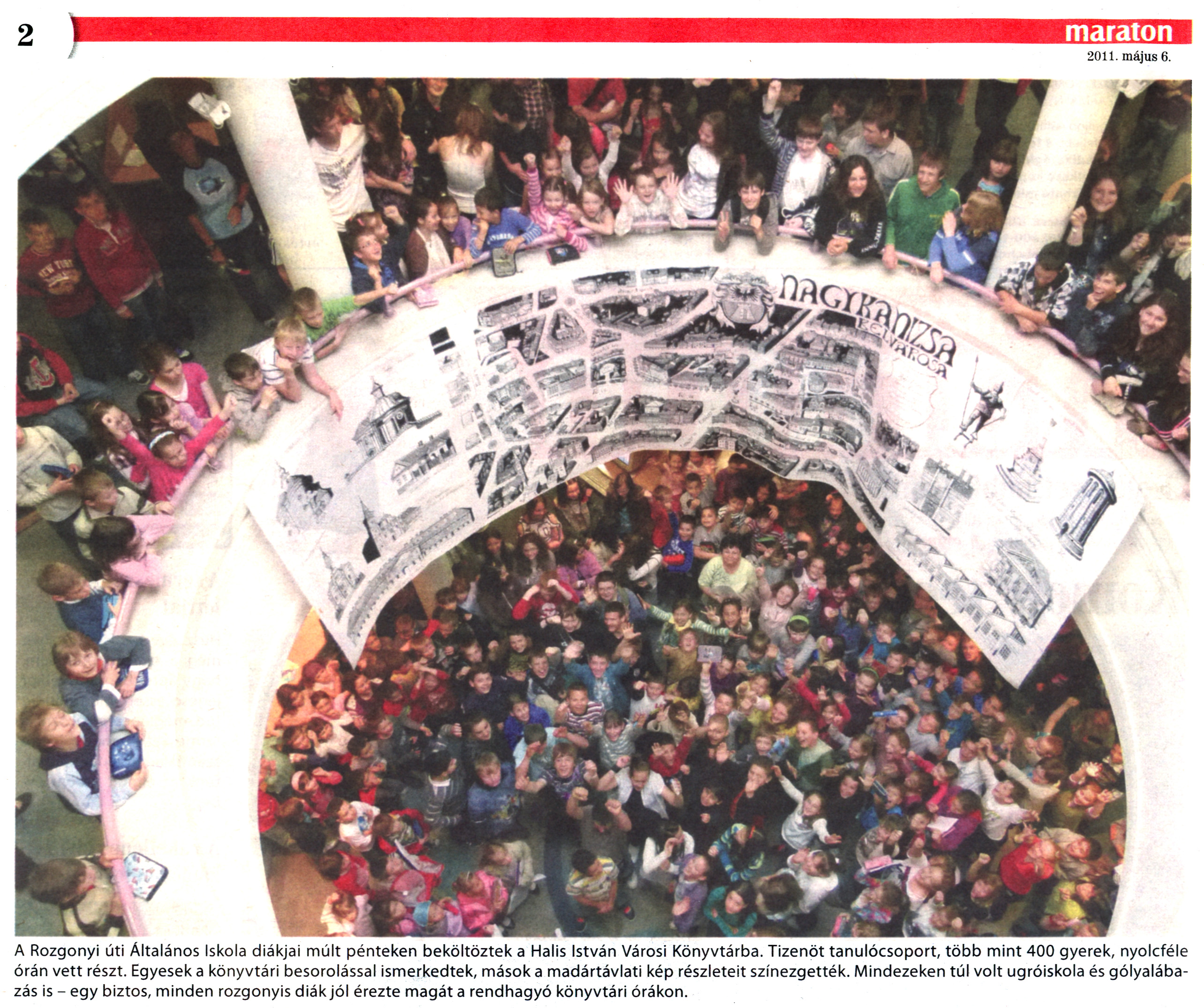 Nyilvános 2542 | 8094 | Nagykanizsai Maraton 2011. május 6. 18. szám 2. oldal - Rozgonyi úti Általános Iskola | A cikk szövege: A Rozgonyi úti Általános Iskola diákjai múlt pénteken beköltöztek a Halis István Városi Könyvtárba. Tizenöt tanulócsoport, több mint 400 gyerek, nyolcféle órán vett részt. Egyesek a könyvtári besorolással ismerkedtek, mások a madártávlati kép részleteit színezgették. Mindezeken túl volt ugróiskola és gólyalábazás is - egy biztos, minden rozgonyis diák jól érezte magát a rendhagyó könyvtári órákon. |