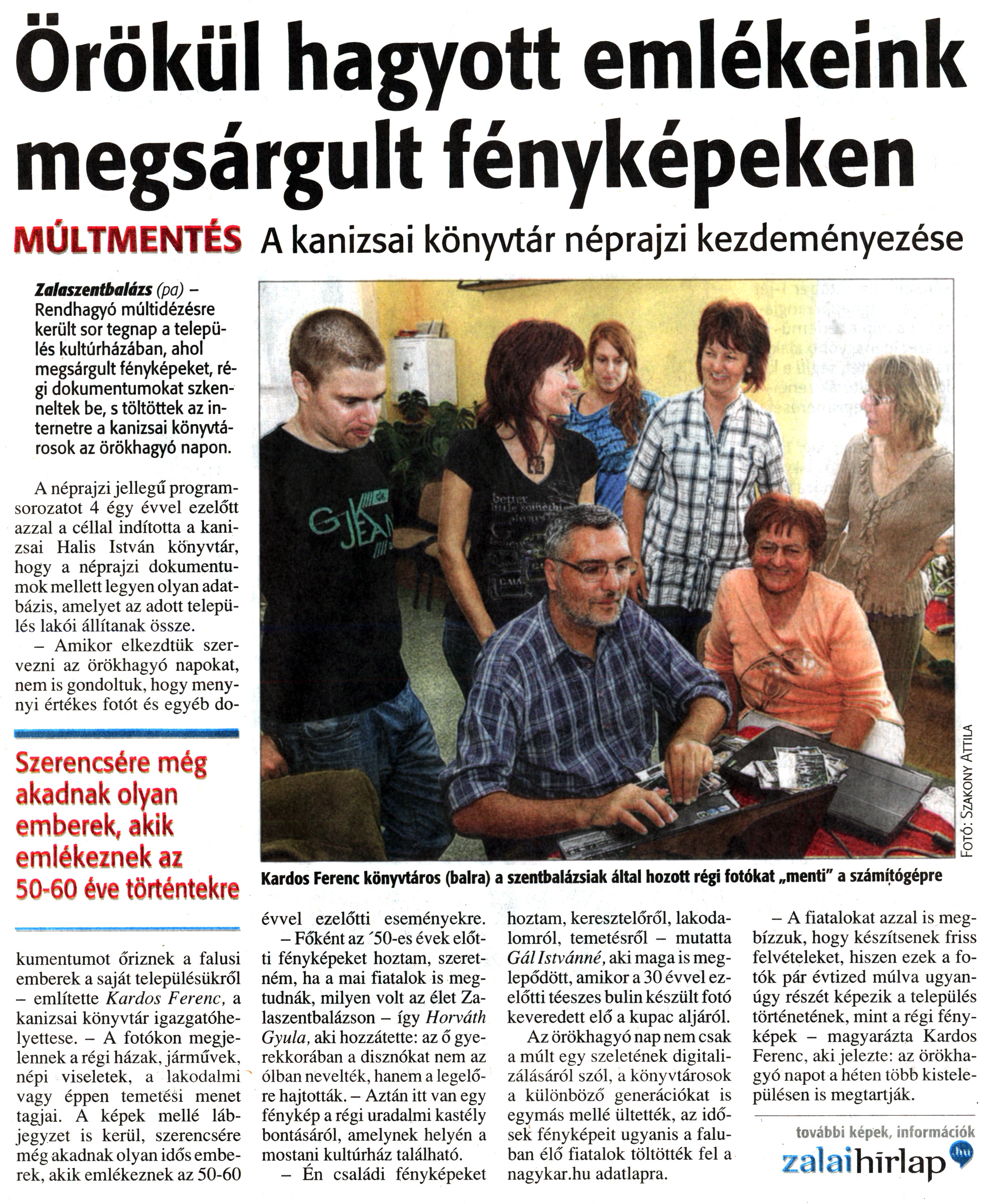 Nyilvános 1701 | 3988 | Zalai Hírlap 2012. október 2. 231. szám 4. oldal - Örökül hagyott emlékeink megsárgult fényképeken | Örökül hagyott emlékeink megsárgult fényképeken MÚLTMENTÉS A kanizsai könyvtár néprajzi kezdeményezése Kardos Ferenc könyvtáros (balra) a szentbalázsiak által hozott régi fotókat „menti" a számítógépre Zalaszentbalázs (pa) - Rendhagyó múltidézésre került sor tegnap a település kultúrházában, ahol megsárgult fényképeket, régi dokumentumokat szkenneltek be, s töltöttek az internetre a kanizsai könyvtárosok az örökhagyó napon. A néprajzi jellegű programsorozatot 4 égy évvel ezelőtt azzal a céllal indította a kanizsai Halis István könyvtár, hogy a néprajzi dokumentumok mellett legyen olyan adatbázis, amelyet az adott település lakói állítanak össze. - Amikor elkezdtük szervezni az örökhagyó napokat, nem is gondoltuk, hogy menynyi értékes fotót és egyéb dokumentumot őriznek a falusi emberek a saját településükről - említette Kardos Ferenc, a kanizsai könyvtár igazgatóhelyettese. - A fotókon megjelennek a régi házak, járművek, népi viseletek, a lakodalmi vagy éppen temetési menet tagjai. A képek mellé lábjegyzet is kerül, szerencsére még akadnak olyan idős emberek, akik emlékeznek az 50-60 évvel ezelőtti eseményekre. - Főként az \'50-es évek előtti fényképeket hoztam, szeretném, ha a mai fiatalok is megtudnák, milyen volt az élet Zalaszentbalázson - így Horváth Gyula, aki hozzátette: az ő gyerekkorában a disznókat nem az ólban nevelték, hanem a legelőre hajtották. - Aztán itt van egy fénykép a régi uradalmi kastély bontásáról, amelynek helyén a mostani kultúrház található. - Én családi fényképeket hoztam, keresztelőről, lakodalomról, temetésről - mutatta Gál Istvánné, aki maga is meglepődött, amikor a 30 évvel ezelőtti téeszes bulin készült fotó keveredett elő a kupac aljáról. Az örökhagyó nap nem csak a múlt egy szeletének digitalizálásáról szól, a könyvtárosok a különböző generációkat is egymás mellé ültették, az idősek fényképeit ugyanis a faluban élő fiatalok töltötték fel a nagykar.hu adatlapra. - A fiatalokat azzal is megbízzuk, hogy készítsenek friss felvételeket, hiszen ezek a fotók pár évtized múlva ugyanúgy részét képezik a település történetének, mint a régi fényképek - magyarázta Kardos Ferenc, aki jelezte: az örökhagyó napot a héten több kistelepülésen is megtartják. |