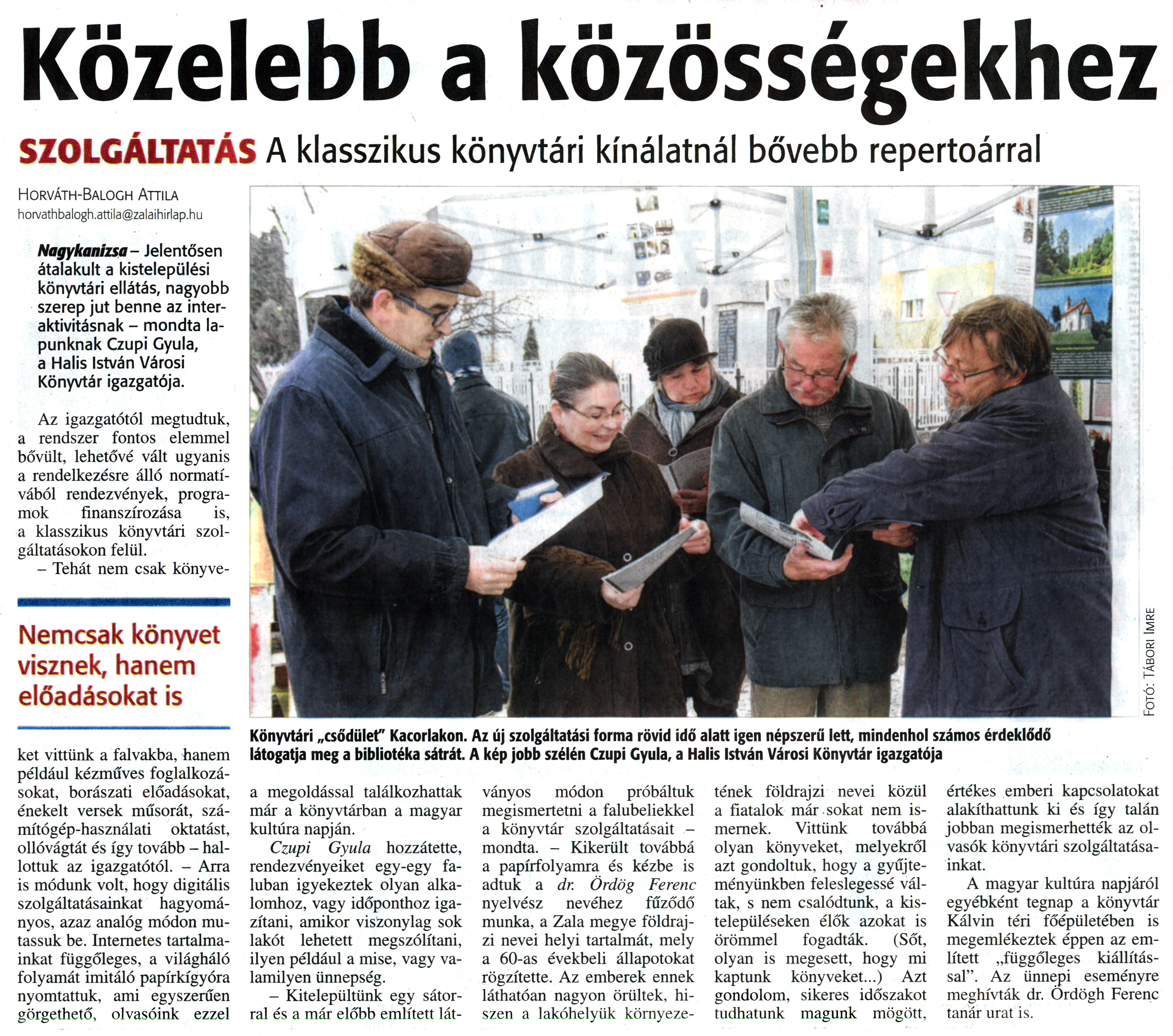 Nyilvános 2125 | 5166 | Zalai Hírlap 2014. január 23. 19. szám 11. oldal - Közelebb a közösségekhez | Közelebb a közösségekhez SZOLGÁLTATÁSA klasszikus könyvtári kínálatnál bővebb repertoárral Nemcsak könyvet visznek, hanem előadásokat is Horváth-Balogh Attila horvathbalogh.attila@zalaihirlap.hu Nagykanizsa - Jelentősen átalakult a kistelepülési könyvtári ellátás, nagyobb szerep jut benne az interaktivitásnak - mondta lapunknak Czupi Gyula, a Halis István Városi Könyvtár igazgatója. Az igazgatótól megtudtuk, a rendszer fontos elemmel bővült, lehetővé vált ugyanis a rendelkezésre álló normatívából rendezvények, programok finanszírozása is, a klasszikus könyvtári szolgáltatásokon felül. - Tehát nem csak könyveket vittünk a falvakba, hanem például kézműves foglalkozásokat, borászati előadásokat, énekelt versek műsorát, számítógép-használati oktatást, ollóvágtát és így tovább - hallottuk az igazgatótól. - Arra is módunk volt, hogy digitális szolgáltatásainkat hagyományos, azaz analóg módon mutassuk be. Internetes tartalmainkat függőleges, a világháló folyamát imitáló papírkígyóra nyomtattuk, ami egyszerűen görgethető, olvasóink ezzel a megoldással találkozhattak már a könyvtárban a magyar kultúra napján. Czupi Gyula hozzátette, rendezvényeiket egy-egy faluban igyekeztek olyan alkalomhoz, vagy időponthoz igazítani, amikor viszonylag sok lakót lehetett megszólítani, ilyen például a mise, vagy valamilyen ünnepség. - Kitelepültünk egy sátorral és a már előbb említett lát- ványos módon próbáltuk megismertetni a falubeliekkel a könyvtár szolgáltatásait -mondta. - Kikerült továbbá a papírfolyamra és kézbe is adtuk a dr. Ördög Ferenc nyelvész nevéhez fűződő munka, a Zala megye földrajzi nevei helyi tartalmát, mely a 60-as évekbeli állapotokat rögzítette. Az emberek ennek láthatóan nagyon örültek, hiszen a lakóhelyük környezetének földrajzi nevei közül a fiatalok már sokat nem ismernek. Vittünk továbbá olyan könyveket, melyekről azt gondoltuk, hogy a gyűjteményünkben feleslegessé váltak, s nem csalódtunk, a kistelepüléseken élők azokat is örömmel fogadták. (Sőt, olyan is megesett, hogy mi kaptunk könyveket...) Azt gondolom, sikeres időszakot tudhatunk magunk mögött. értékes emberi kapcsolatokat alakíthattunk ki és így talán jobban megismerhették az olvasók könyvtári szolgáltatásainkat. A magyar kultúra napjáról egyébként tegnap a könyvtár Kálvin téri főépületében is megemlékeztek éppen az említett „függőleges kiállítással". Az ünnepi eseményre meghívták dr. Ördög Ferenc tanár urat is. Könyvtári „csődület" Kacorlakon. Az új szolgáltatási forma rövid idő alatt igen népszerű lett, mindenhol számos érdeklődő látogatja meg a bibliotéka sátrát. A kép jobb szélén Czupi Gyula, a Halis István Városi Könyvtár igazgatója Fotó: Tábori Imre |