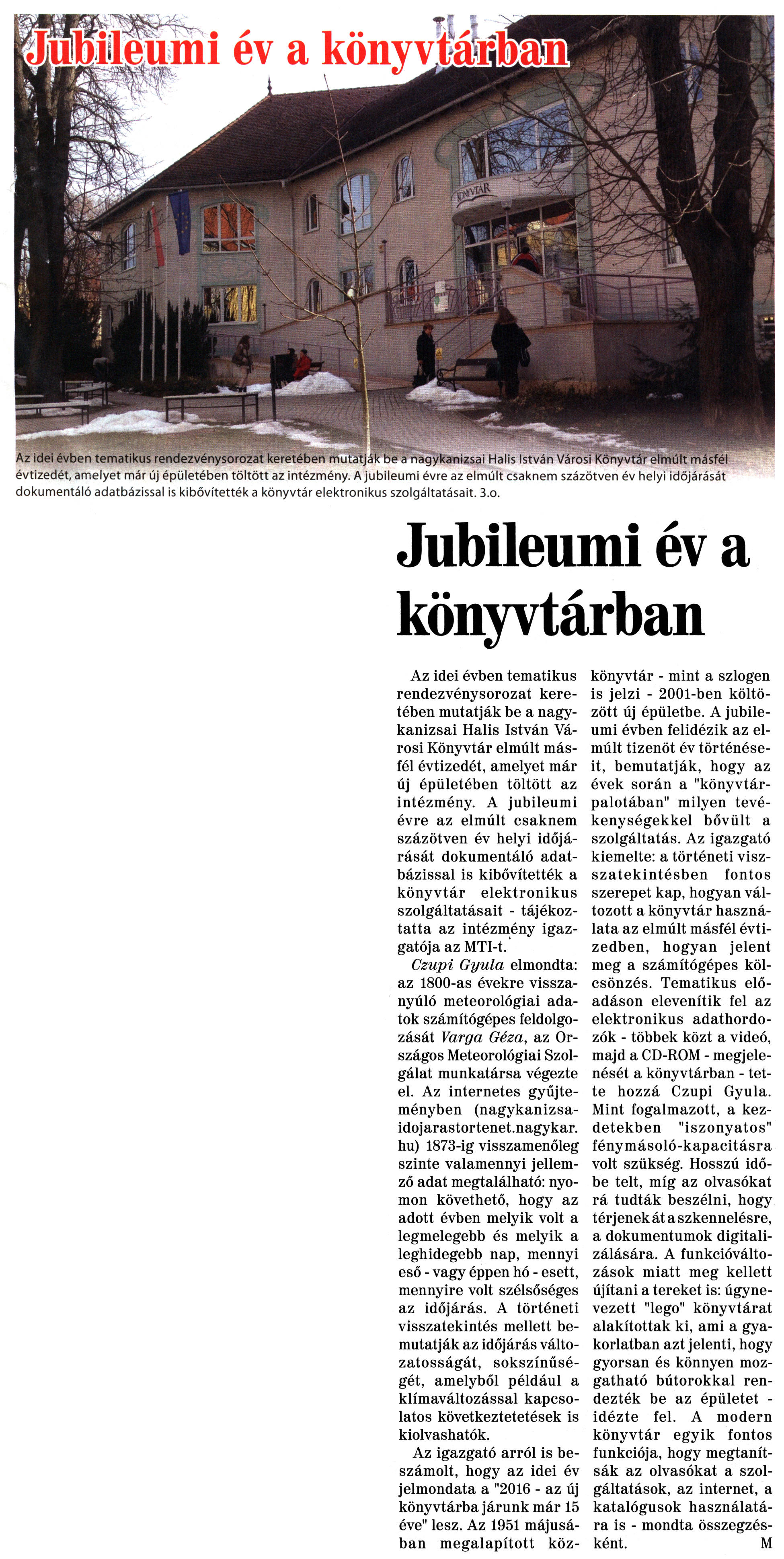 Nyilvános 1808 | 3707 | Nagykanizsai Maraton 2016. január 15. 2. szám 1, 3. oldal | Jubileumi év a könyvtárban Az idei évben tematikus rendezvénysorozat keretében mutatják be a nagykanizsai Halis István Városi Könyvtár elmúlt másfél évtizedét, amelyet már új épületében töltött az intézmény. A jubileumi évre az elmúlt csaknem százötven év helyi időjárását dokumentáló adatbázissal is kibővítették a könyvtár elektronikus szolgáltatásait. 3.o. Jubileumi év a könyvtárban Az idei évben tematikus rendezvénysorozat keretében mutatják be a nagykanizsai Halis István Városi Könyvtár elmúlt másfél évtizedét, amelyet már új épületében töltött az intézmény. A jubileumi évre az elmúlt csaknem százötven év helyi időjárását dokumentáló adatbázissal is kibővítették a könyvtár elektronikus szolgáltatásait - tájékoztatta az intézmény igazgatója az MTI-t. Czupi Gyula elmondta: az 1800-as évekre visszanyúló meteorológiai adatok számítógépes feldolgozását Varga Géza, az Országos Meteorológiai Szolgálat munkatársa végezte el. Az internetes gyűjteményben (nagykanizsaidojarastortenet.nagykar.hu) 1873-ig visszamenőleg szinte valamennyi jellemző adat megtalálható: nyomon követhető, hogy az adott évben melyik volt a legmelegebb és melyik a leghidegebb nap, mennyi eső - vagy éppen hó - esett, mennyire volt szélsőséges az időjárás. A történeti visszatekintés mellett bemutatják az időjárás változatosságát, sokszínűségét, amelyből például a klímaváltozással kapcsolatos következtetetések is kiolvashatók. Az igazgató arról is beszámolt, hogy az idei év jelmondata a "2016 - az új könyvtárba járunk már 15 éve" lesz. Az 1951 májusában megalapított közkönyvtár - mint a szlogen is jelzi - 2001-ben költözött új épületbe. A jubileumi évben felidézik az elmúlt tizenöt év történéseit, bemutatják, hogy az évek során a "könyvtárpalotában" milyen tevékenységekkel bővült a szolgáltatás. Az igazgató kiemelte: a történeti visszatekintésben fontos szerepet kap, hogyan változott a könyvtár használata az elmúlt másfél évtizedben, hogyan jelent meg a számítógépes kölcsönzés. Tematikus előadáson elevenítik fel az elektronikus adathordozók - többek közt a videó, majd a CD-ROM - megjelenését a könyvtárban - tette hozzá Czupi Gyula. Mint fogalmazott, a kezdetekben "iszonyatos" fénymásoló-kapacitásra volt szükség. Hosszú időbe telt, míg az olvasókat rá tudták beszélni, hogy térjenek át a szkennelésre, a dokumentumok digitalizálására. A funkcióváltozások miatt meg kellett újítani a tereket is: úgynevezett "lego" könyvtárat alakítottak ki, ami a gyakorlatban azt jelenti, hogy gyorsan és könnyen mozgatható bútorokkal rendezték be az épületet -idézte fel. A modern könyvtár egyik fontos funkciója, hogy megtanítsák az olvasókat a szolgáltatások, az internet, a katalógusok használatára is - mondta összegzésként. M |