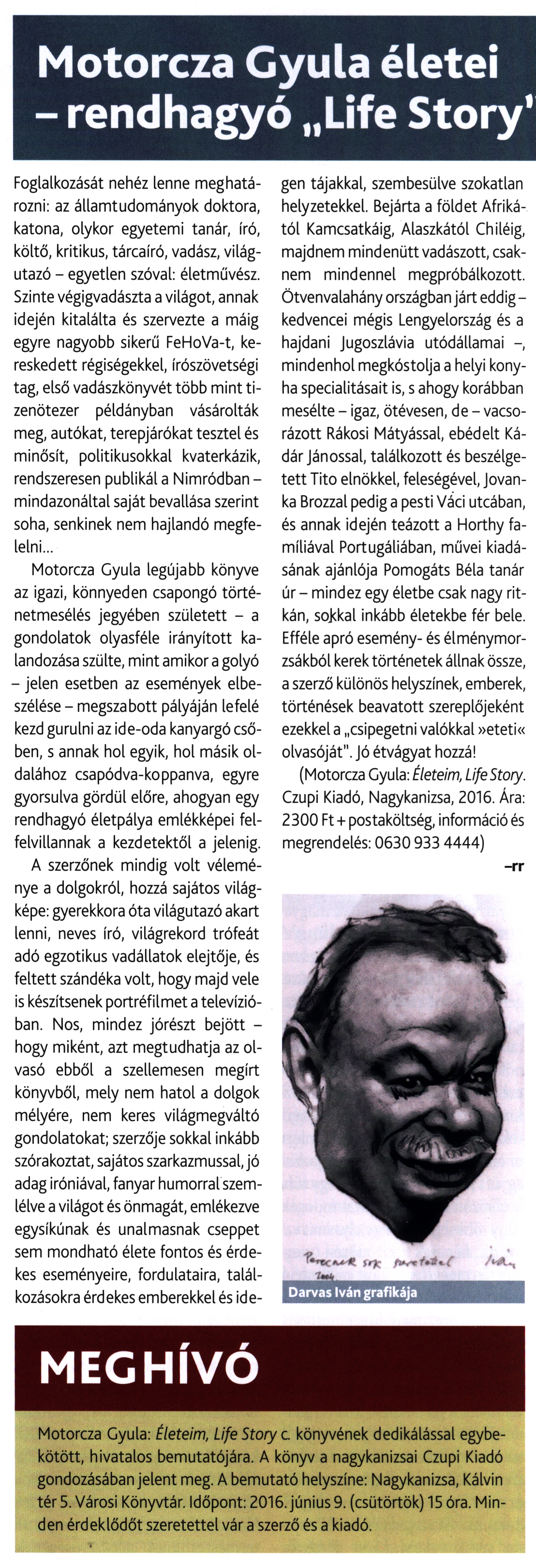 Nyilvános 1837 | 3604 | Nimród vadászújság 2016. június, 54. oldal - Motorcza Gyula életei - rendhagyó Life Story | Foglalkozását nehéz lenne meghatározni: az államtudományok doktora, katona, olykor egyetemi tanár, író, költő, kritikus, tárcaíró, vadász, világutazó - egyetlen szóval: életművész. Szinte végigvadászta a világot, annak idején kitalálta és szervezte a máig egyre nagyobb sikerű FeHoVa-t, kereskedett régiségekkel, írószövetségi tag, első vadászkönyvét több mint tizenötezer példányban vásárolták meg, autókat, terepjárókat tesztel és minősít, politikusokkal kvaterkázik, rendszeresen publikál a Nimródban -mindazonáltal saját bevallása szerint soha, senkinek nem hajlandó megfelelni... Motorcza Gyula legújabb könyve az igazi, könnyeden csapongó történetmesélés jegyében született - a gondolatok olyasféle irányított kalandozása szülte, mint amikor a golyó - jelen esetben az események elbeszélése - megszabott pályáján lefelé kezd gurulni az ide-oda kanyargó csőben, s annak hol egyik, hol másik oldalához csapódva-koppanva, egyre gyorsulva gördül előre, ahogyan egy rendhagyó életpálya emlékképei felfelvillannak a kezdetektől a jelenig. A szerzőnek mindig volt véleménye a dolgokról, hozzá sajátos világképe: gyerekkora óta világutazó akart lenni, neves író, világrekord trófeát adó egzotikus vadállatok elejtője, és feltett szándéka volt, hogy majd vele is készítsenek portréfilmet a televízióban. Nos, mindez jórészt bejött - hogy miként, azt megtudhatja az olvasó ebből a szellemesen megírt könyvből, mely nem hatol a dolgok mélyére, nem keres világmegváltó gondolatokat; szerzője sokkal inkább szórakoztat, sajátos szarkazmussal, jó adag iróniával, fanyar humorral szemlélve a világot és önmagát, emlékezve egysíkúnak és unalmasnak cseppet sem mondható élete fontos és érdekes eseményeire, fordulataira, találkozásokra érdekes emberekkel és idegen tájakkal, szembesülve szokatlan helyzetekkel. Bejárta a földet Afrikától Kamcsatkáig, Alaszkától Chiléig, majdnem mindenütt vadászott, csaknem mindennel megpróbálkozott. Ötvenvalahány országban járt eddig -kedvencei mégis Lengyelország és a hajdani Jugoszlávia utódállamai -, mindenhol megkóstolja a helyi konyha specialitásait is, s ahogy korábban mesélte - igaz, ötévesen, de - vacsorázott Rákosi Mátyással, ebédelt Kádár Jánossal, találkozott és beszélgetett Tito elnökkel, feleségével, Jovan-ka Brozzal pedig a pesti Váci utcában, és annak idején teázott a Horthy famíliával Portugáliában, művei kiadásának ajánlója Pomogáts Béla tanár úr - mindez egy életbe csak nagy ritkán, sokkal inkább életekbe fér bele. Efféle apró esemény- és élménymorzsákból kerek történetek állnak össze, a szerző különös helyszínek, emberek, történések beavatott szereplőjeként ezekkel a csipegetni valókkal »eteti« olvasóját". Jó étvágyat hozzá! (Motorcza Gyula: Életeim, Life Story. Czupi Kiadó, Nagykanizsa, 2016. Ára: 2300 Ft + postaköltség, információ és megrendelés: 0630 933 4444) -rr MEGHÍVÓ Motorcza Gyula: Életeim, Life Story c könyvének dedikálással egybekötött, hivatalos bemutatójára. A könyv a nagykanizsai Czupi Kiadó gondozásában jelent meg. A bemutató helyszíne: Nagykanizsa, Kálvin tér 5. Városi Könyvtár. Időpont: 2016. június 9. (csütörtök) 15 óra. Minden érdeklődőt szeretettel vár a szerző és a kiadó. |