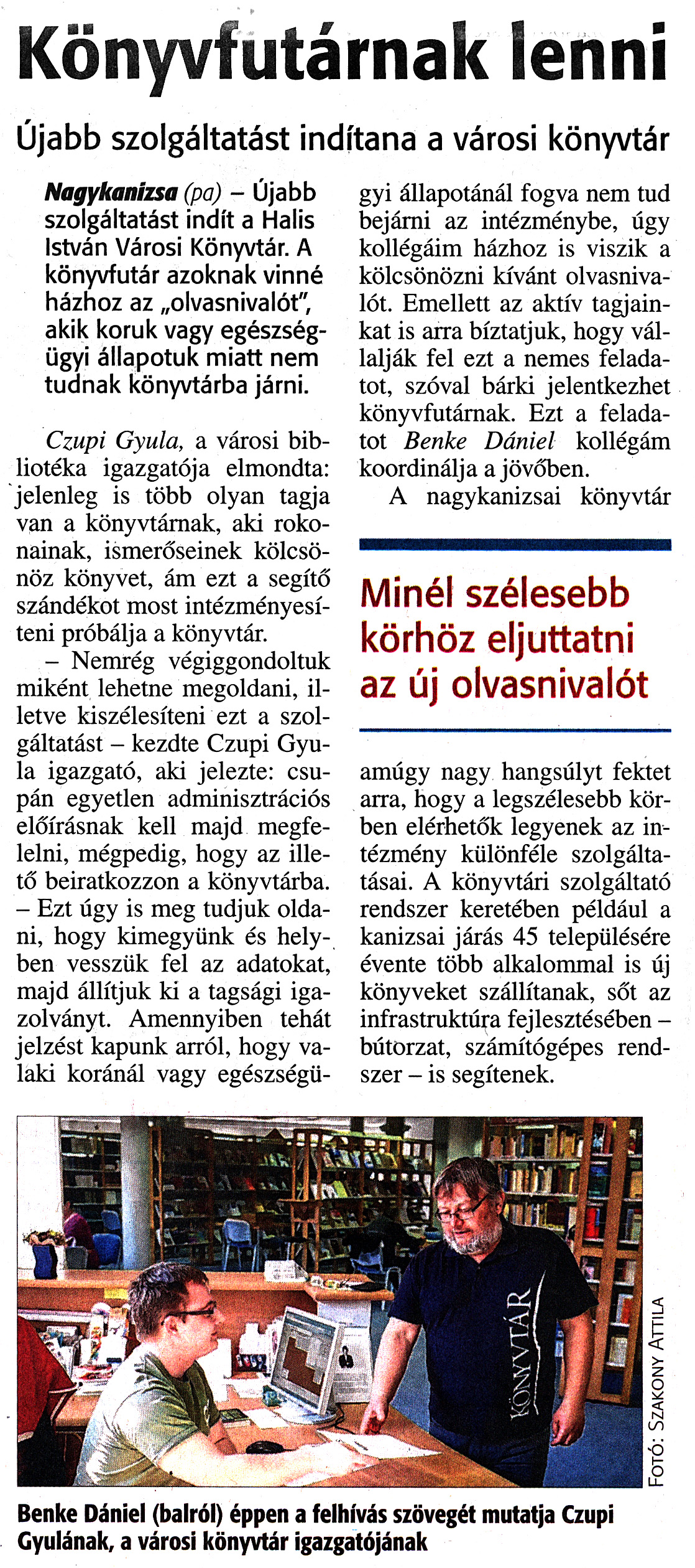 Nyilvános 1806 | 3263 | Zalai Hírlap 2017. március 16. 63. szám 4. oldal | Könyvfutárnak lenni Újabb szolgáltatást indítana a városi könyvtár Nagykanizsa (pa) - Újabb szolgáltatást indít a Halis István Városi Könyvtár. A könyvfutár azoknak vinné házhoz az „olvasnivalót", akik koruk vagy egészségügyi állapotuk miatt nem tudnak könyvtárba járni. Czupi Gyula, a városi bibliotéka igazgatója elmondta: jelenleg is több olyan tagja van a könyvtárnak, aki rokonainak, ismerőseinek kölcsönöz könyvet, ám ezt a segítő szándékot most intézményesíteni próbálja a könyvtár. - Nemrég végiggondoltuk miként lehetne megoldani, illetve kiszélesíteni ezt a szolgáltatást - kezdte Czupi Gyula igazgató, aki jelezte: csupán egyetlen adminisztrációs előírásnak kell majd megfelelni, mégpedig, hogy az illető beiratkozzon a könyvtárba. - Ezt úgy is meg tudjuk oldani, hogy kimegyünk és helyben vesszük fel az adatokat, majd állítjuk ki a tagsági igazolványt. Amennyiben tehát jelzést kapunk arról, hogy valaki koránál vagy egészségügyi állapotánál fogva nem tud bejárni az intézménybe, úgy kollégáim házhoz is viszik a kölcsönözni kívánt olvasnivalót. Emellett az aktív tagjainkat is arra bíztatjuk, hogy vállalják fel ezt a nemes feladatot, szóval bárki jelentkezhet könyvfutárnak. Ezt a feladatot Benke Dániel kollégám koordinálja a jövőben. A nagykanizsai könyvtár Minél szélesebb körhöz eljuttatni az új olvasnivalót amúgy nagy hangsúlyt fektet arra, hogy a legszélesebb körben elérhetők legyenek az intézmény különféle szolgáltatásai. A könyvtári szolgáltató rendszer keretében például a kanizsai járás 45 településére évente több alkalommal is új könyveket szállítanak, sőt az infrastruktúra fejlesztésében -bútorzat, számítógépes rendszer - is segítenek. Benke Dániel (balról) éppen a felhívás szövegét mutatja Czupi Gyulának, a városi könyvtár igazgatójának |